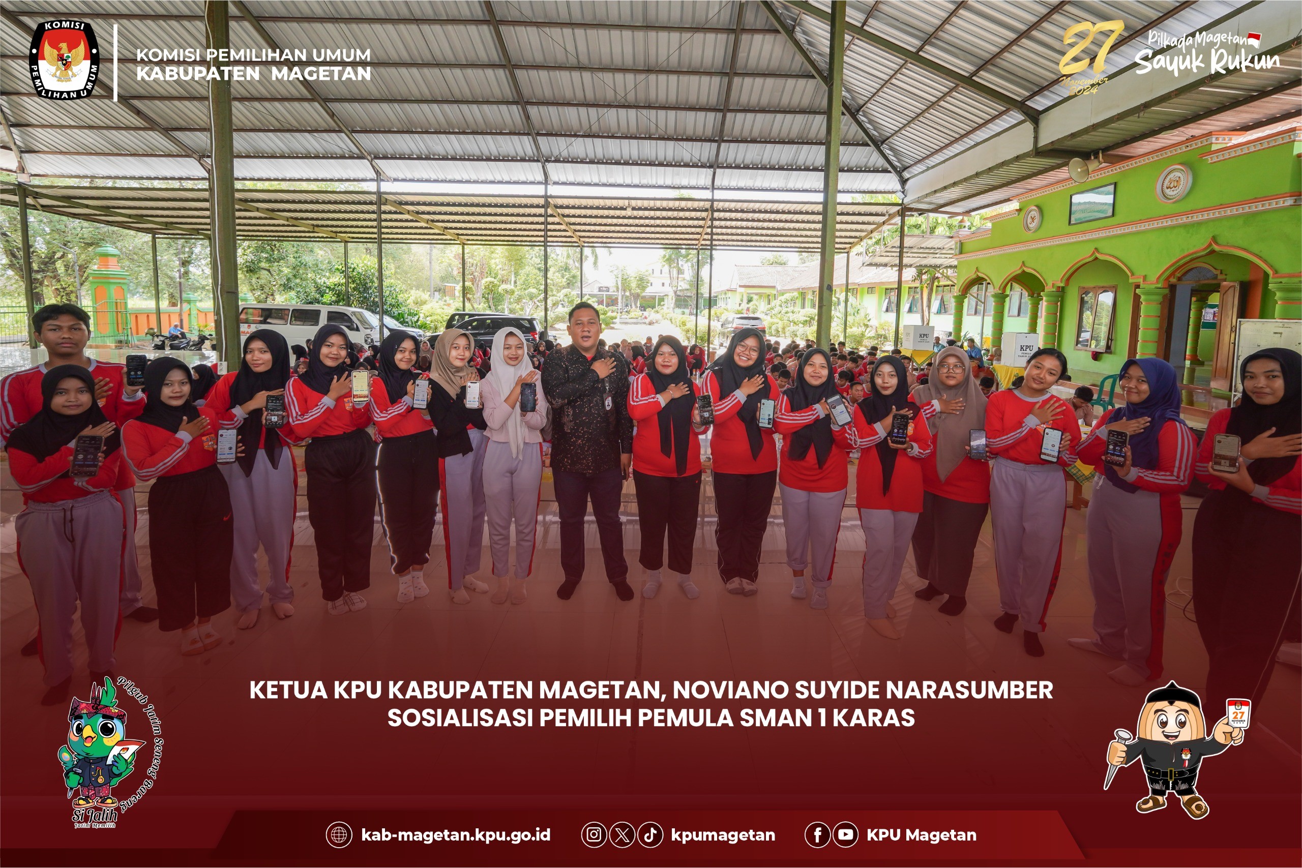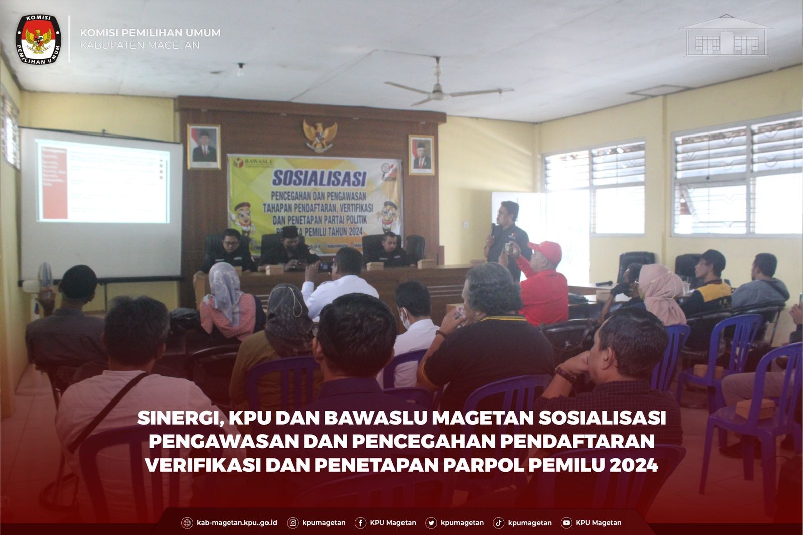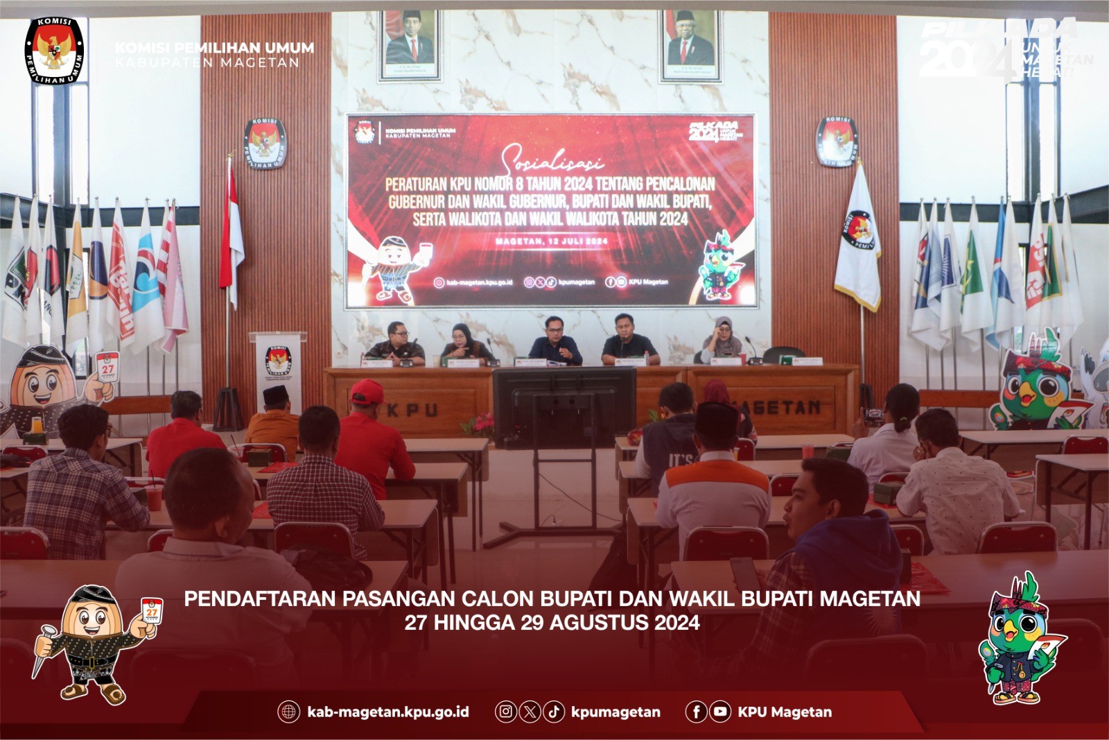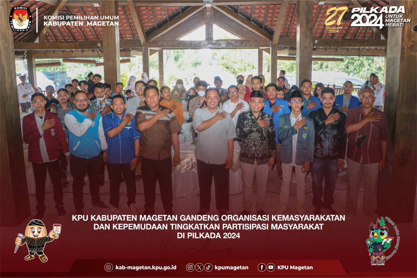 Magetan, kab-magetan.kpu.go.id - KPU Kabupaten Magetan melaksanakan giat sosialisasi dengan tema "Tahapan Pemilihan Kepala Daerah dan Sinergi Stakeholder dalam Peningkatan Partisipasi Masyarakat Pemilihan Bupati dan Wakil Bupati Kabupaten Magetan Tahun 2024" bertempat di Joglo Kondang Ayem, Magetan, Senin (29/7). Kegiatan sosialiasasi ini mengundang berbagai organisasi kemasyarakatan dan kepemudaan seperti GMNI, PMII, IPNU-IPPNU, Pemuda Pancasila, Nahdlatul Ulama, HMI, dan masih banyak lagi. Ketua KPU Kabupaten Magetan, Noviano Suyide dalam sambutannya menargetkan tingkat partisipasi masyarakat pada Pilkada 2024 lebih tinggi daripada Pemilu 2024. "Untuk target kami di Pilkada 2024, partisipasi masyarakat paling tidak di atas 80% bahkan bisa melebihi pencapaian Pemilu 2024 lalu di angka 82%." Ungkapnya. Divisi Sosdiklih Parmas dan SDM KPU Kabupaten Magetan, Rhichy Kurnia Putra kembali mengingatkan dan mengajak seluruh peserta sosialisasi untuk datang ke TPS memberikan suaranya pada Pilkad 2024. "Rabu, 27 November 2024 mari kita semua datang ke TPS untuk memilih Gubernur dan Wakil Gubernur Jawa Timur serta Bupati dan Wakil Bupati Magetan. Pastikan nama anda semua terdaftar di daftar pemilih Pilkada 2024 dengan cara cek di cekdptonline.kpu.go.id serta selalu update informasi kepemiluan dengan mengunjungi sosial media dari KPU Kabupaten Magetan yang mana kami selalu update terkait tahapan Pilkada 2024 yang tengah berjalan," ujar Rhichy. M. Syarif Thoyib, narasumber yang dihadirkan pada sosialisasi ini menyampaikan pentingnya sinergi antar lembaga. " Sinergi antar lembaga dalam pemilukada sangat penting untuk menciptakan proses yang transparan dan partisipatif. Kolaborasi dapat meningkatkan sosialisasi tahapan pemilu dan mengurangi potensi money politics. Dengan sinergi, diharapkan ada dialog yang konstruktif dan komitmen bersama untuk menjaga persatuan meskipun terdapat perbedaan pilihan," sampainya pada peserta sosialisasi. Lebih lanjut Syarif juga menganggap keterlibatan generasi muda dalam proses pemilu dapat meningkatkan partisipasi dan kesadaran politik, serta mendorong perubahan positif. "Dengan memanfaatkan platform multiplatform dan berbasis komunitas, generasi muda dapat memperkuat suara mereka dan mempengaruhi hasil Pilkada," tutupnya. (br)