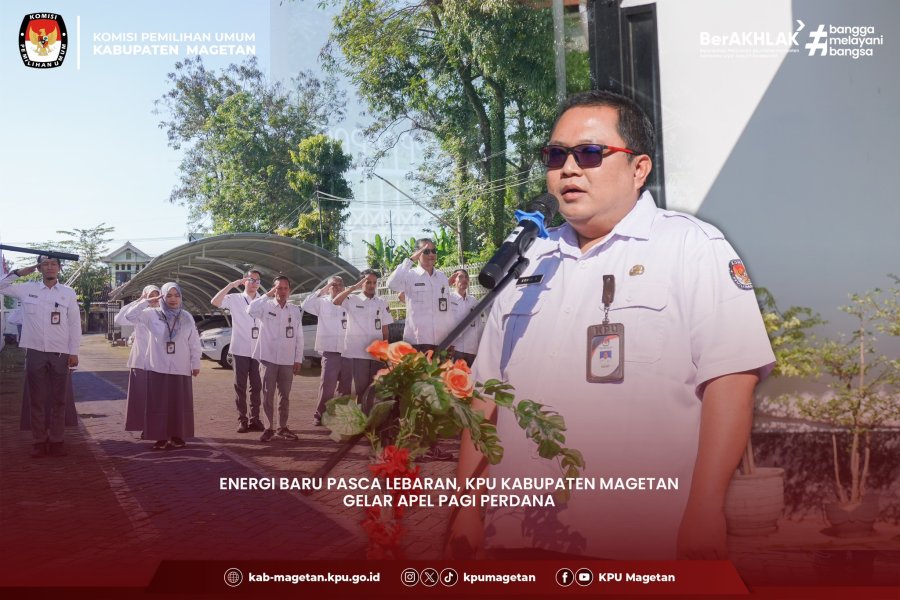 #TemanPemilih, KPU Kabupaten Magetan melaksanakan apel pagi perdana pasca Idul Fitri, Senin (30/3) yang menjadi momentum untuk kembali menguatkan semangat kerja dan kebersamaan.