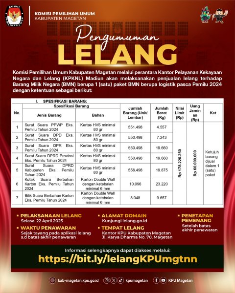 #TemanPemilih, berikut kami sampaikan pengumuman lelang terhadap Barang Milik Negara (BMN) berupa 1 (satu) paket BMN berupa eks logistik pasca Pemilu 2024.