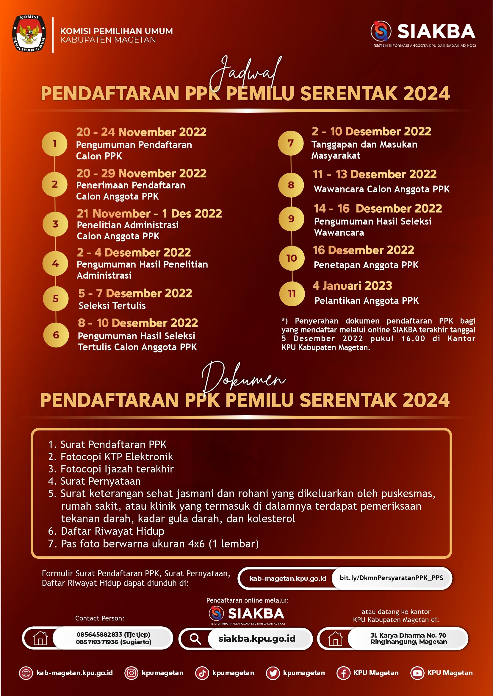 Pengumuman Pendaftaran Panitia Pemilihan Kecamatan (PPK) Pemilu Serentak Tahun 2024 KPU Kabupaten Magetan Sabtu, 19 November 2022 21:00 1182 Untuk Formulir Surat Pendaftaran PPK, Surat Pernyataan, dan Daftar Riwayat Hidup dapat diunduh disini Rilis selengkapnya dapat diunduh disini Bagikan: Telah dilihat 1,182 kali