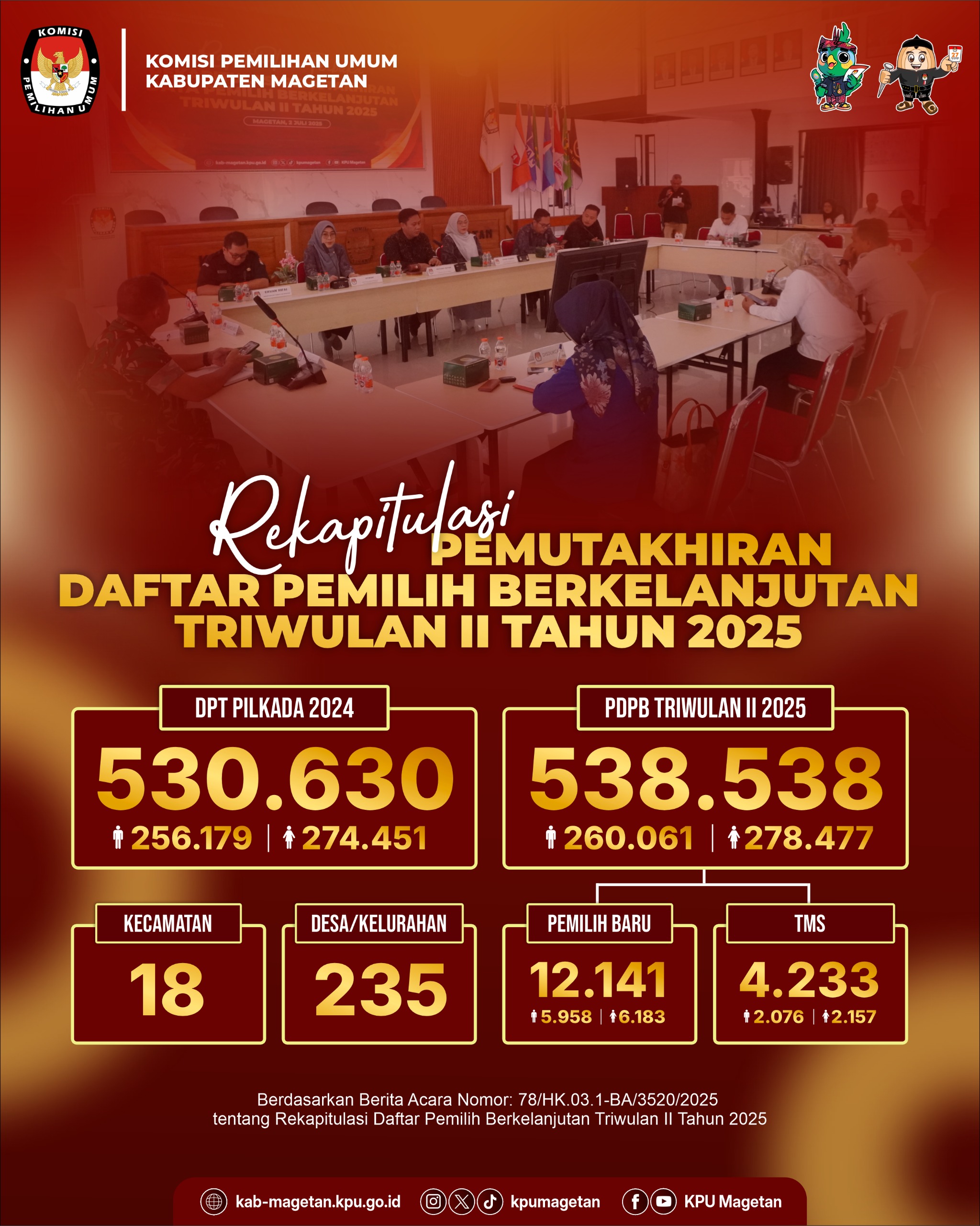 #TemanPemilih, berikut kami sampaikan rekapitulasi Pemutakhiran Daftar Pemilih Berkelanjutan Kabupaten Magetan Triwulan II Tahun 2025 di Kabupaten Magetan.