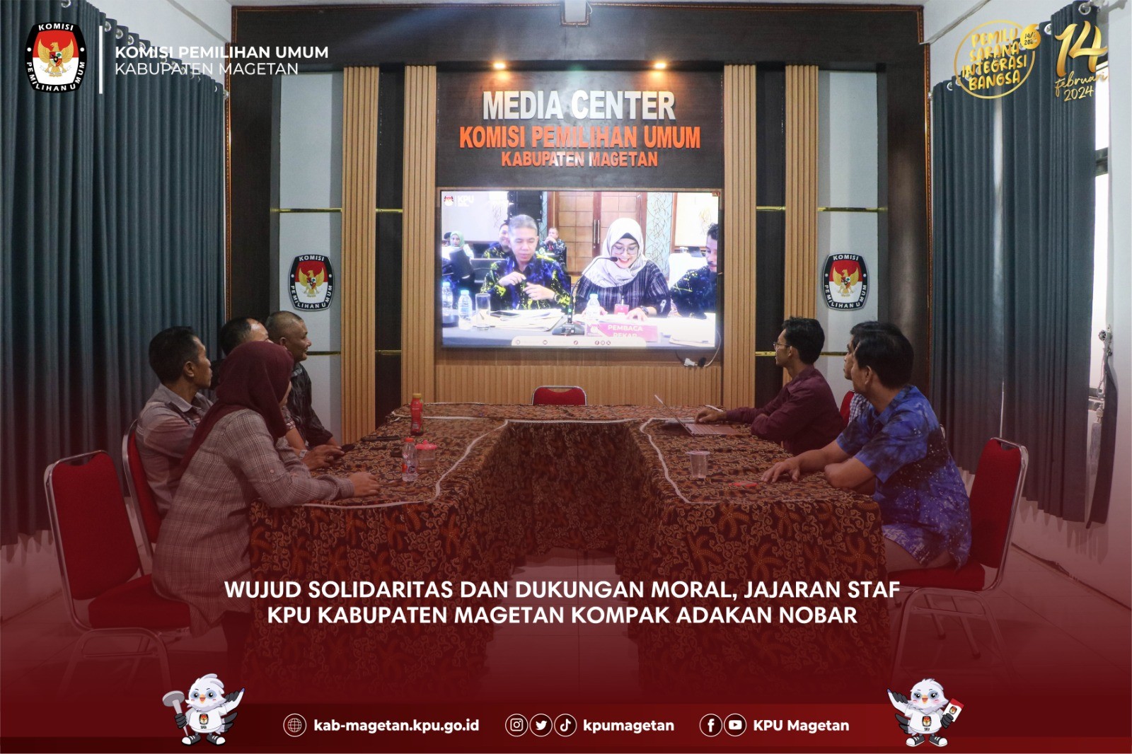Staf KPU Kabupaten Magetan Sub Bagian Hukum dan SDM, Tjetjep Sudaryanto menjelaskan bahwa kegiatan nonton bareng ini merupakan wujud solidaritas dan dukungan moral bagi tim yang bertugas di tingkat provinsi. "Kami ingin menunjukkan bahwa kami sepenuhnya mendukung dan berdiri di belakang tim kami yang saat ini memiliki tanggung jawab besar. Ini adalah momen penting bagi demokrasi kita, dan penting bagi kami untuk memberikan dukungan penuh," ujarnya.