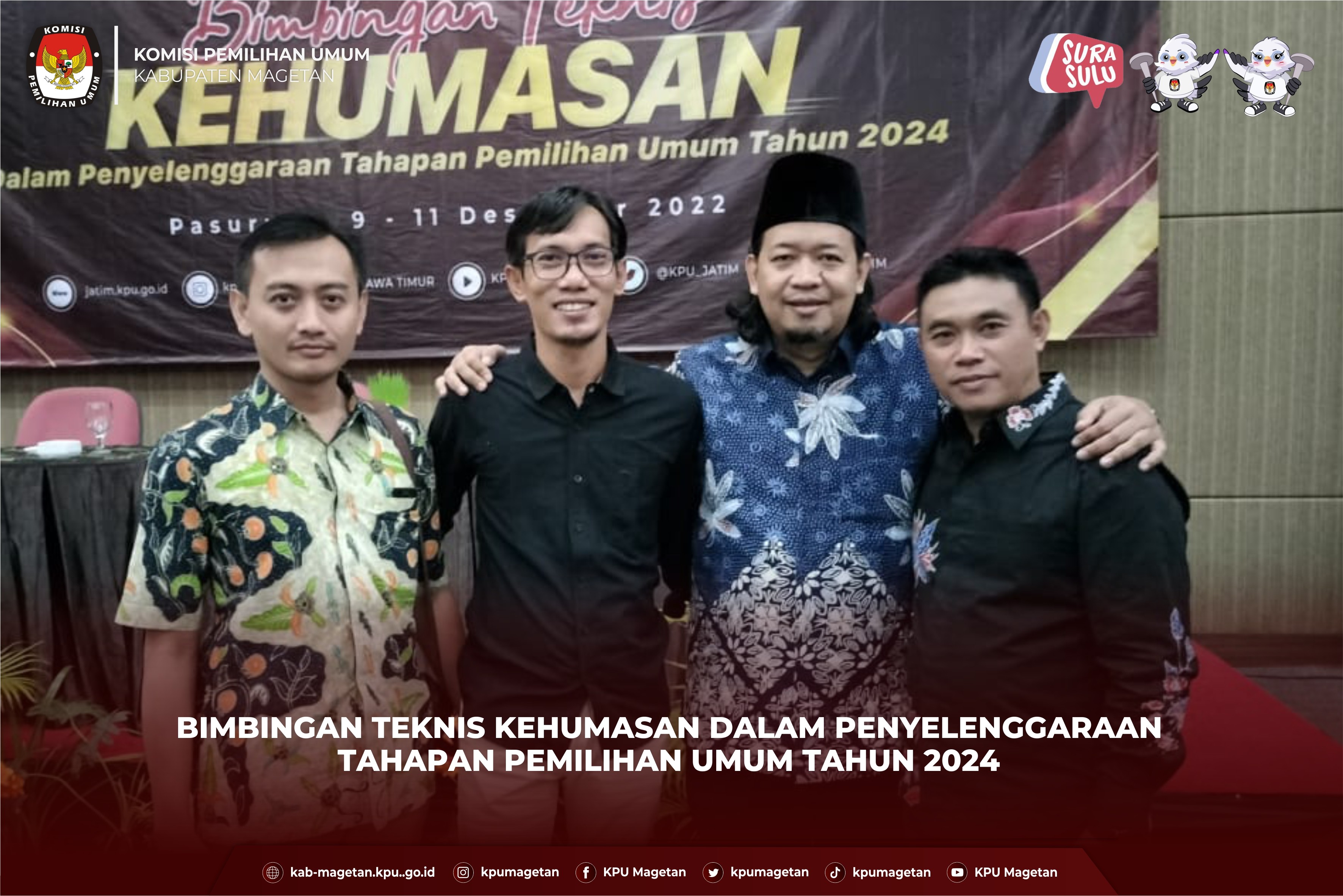 kab-magetan.kpu.go.id - Partisipasi masyarakat merupakan salah satu elemen penting penentu sukses atau tidaknya penyelenggaraan Pemilu. Untuk itu, KPU Kabupaten Magetan mengikuti Bimbingan Teknis Kehumasan dalam Penyelenggaraan Pemilu 2024, 9-11 Desember 2022. Bimbingan Teknis ini diselenggarakan oleh KPU Provinsi Jawa Timur dan diikuti oleh Divisi Sosdiklih Parmas dan SDM, Sekretaris, Bendahara, dan Staf Parmas dari KPU Kabupaten/Kota se-Jawa Timur. Acara dibuka oleh Divisi Sosdiklih Parmas KPU Provinsi Jawa Timur, Gogot Cahyo Baskoro di Aula KPU Kabupaten Pasuruan. Dalam pembukaannya, Gogot Cahyo Baskoro ungkapkan harapan dari diselenggarakannya bimbingan teknis ini. "Kami sengaja menyelenggarakan bimbingan teknis ini supaya teman-teman di Divisi Parmas dapat mengembangkan pemahaman terkait pelayanan terhadap publik agar menjadi lebih baik dan juga memperdalam kepercayaan publik terhadap suatu individual maupun organisasi." Ungkapnya. Gogot Cahyo Baskoro juga berharap dalam bimtek ini juga dapat memperkuat KPU Kabupaten/Kota dalam menangkal hoaks khususnya saat tahapan Pemilu 2024. "Perlu kolaborasi dan sinergi antar lembaga dalam penanganan disinformasi, dibantu dengan teknologi yang mampu diakses bersama stakeholder terkait." Jelasnya. (br)
