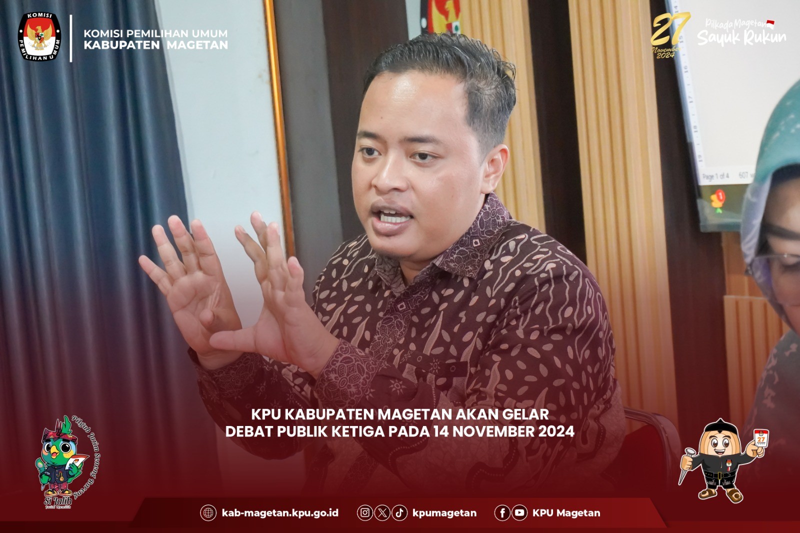 Magetan, kab-magetan.kpu.go.id - KPU Kabupaten Magetan mengadakan Rapat Koordinasi terkait Debat Pemilihan Bupati dan Wakil Bupati Magetan Tahun 2024 bersama Petugas Penghubung Pasangan Calon Bupati dan Wakil Bupati Magetan Tahun 2024, Bawaslu, Pemerintah Daerah, dan Pihak Kepolisian. Debat ketiga Pasangan Calon Bupati dan Wakil Bupati Magetan Tahun 2024 akan digelar pada 14 November 2024. Anggota KPU Magetan, Rhichy Kurnia Putra, menyampaikan bahwa pihaknya hari ini (04/11) mengundang LO untuk memastikan jadwal debat ketiga. “Hari ini kami melakukan koordinasi teknis terkait jadwal pelaksanaan debat ketiga. Semua Pasangan Calon Bupati dan Wakil Bupati Magetan melalui LO menyepakati bahwa debat ketiga akan dilaksanakan pada hari Kamis, 14 November 2024,” terangnya. “Adapun terkait Rapat Umum, dilakukan sekali untuk setiap Pasangan Calon Bupati dan Wakil Bupati Magetan Tahun 2024, yaitu untuk Rapat Umum yang dilaksanakan oleh Pasangan Calon Nomor Urut 01, Hj. Nanik Endang R. MPd dan Suyatni Priasmoro, S.H., M.H. pada tanggal 23 November 2024 dengan lokasi di wilayah Kabupaten Magetan. Pasangan Calon Nomor Urut 02, Ir. Hergunadi, M.T. dan Dr. A. Basuki Babussalam, S.H., M.H. pada tanggal 17 November 2024 dengan lokasi di wilayah Kabupaten Magetan. Pasangan Calon Nomor Urut 03, H. Sujatno, S.E., M.M. dan Ida Yuhana Ulfa, S.Pd., M.Pd. pada tanggal 20 November 2024 dengan lokasi di wilayah Kabupaten Magetan,” pungkasnya. (sgt)