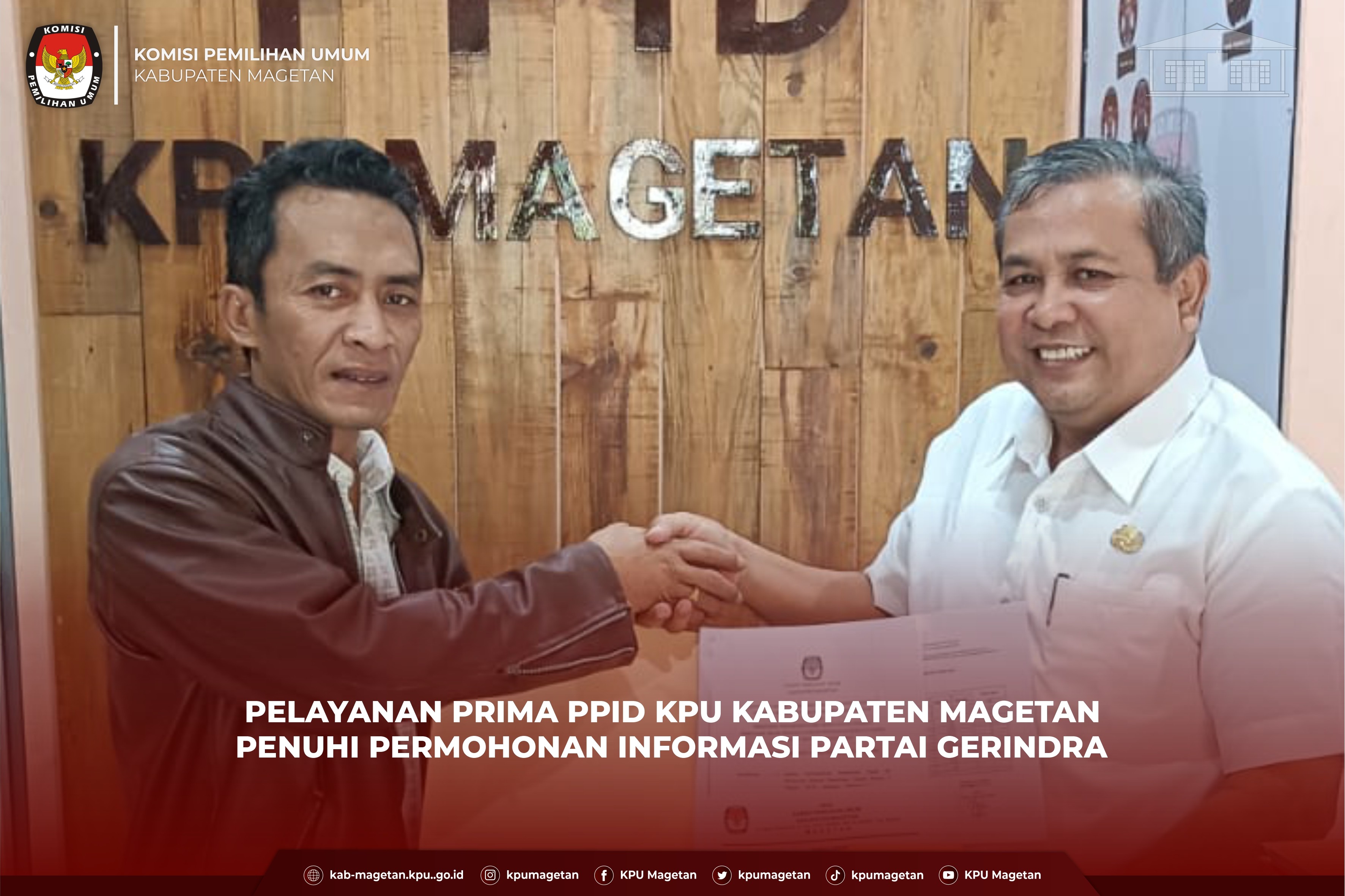 Magetan, kab-magetan.kpu.go.id - PPID KPU Kabupaten Magetan kembali berikan pelayanan informasi kepada partai Gerindra, Kamis, (28/7). Prasetyo Andi, perwakilan dari partai Gerindra yang datang langsung ke KPU Kabupaten Magetan untuk mengajukan permohonan informasi. “Permohonan informasi yang kami ajukan kali ini kepada PPID KPU Kabupaten Magetan adalah perihal Salinan SK Perolehan Kursi DPRD 2019.” Ungkap Prasetyo Andi. Permohonan informasi tersebut langsung diproses oleh petugas PPID KPU Kabupaten Magetan yang sedang bertugas, Bakri Siminggus. Tak butuh waktu lama, permohonan informasi diproses sesuai dengan SOP diantaranya mengisi formulir permohonan disertai foto copy KTP pemohon. Dokumen langsung diserahkan setelah melalui proses legalisasi oleh sekretariat dan Pimpinan KPU Kabupaten Magetan. Sekretaris KPU Kabupaten Magetan, Suprapto yang ikut mendampingi proses pemenuhan permohonan informasi tersebut menyampaikan bahwa pelayanan informasi di PPID KPU Kabupaten Magetan yang diajukan oleh partai Gerindra kali ini dipenuhi pada hari yang sama disaat permohonan informasi tersebut tersampaikan ke PPID KPU Kabupaten Magetan. "Permohonan informasi dari partai Gerindra ini dapat kami selesaikan tanpa membutuhkan waktu yang lama karena begitu permohonan informasi ini kami terima, maka petugas PPID KPU Kabupaten Magetan kami langsung memprosesnya sesuai dengan SOP yang berlaku." Jelasnya. (br)