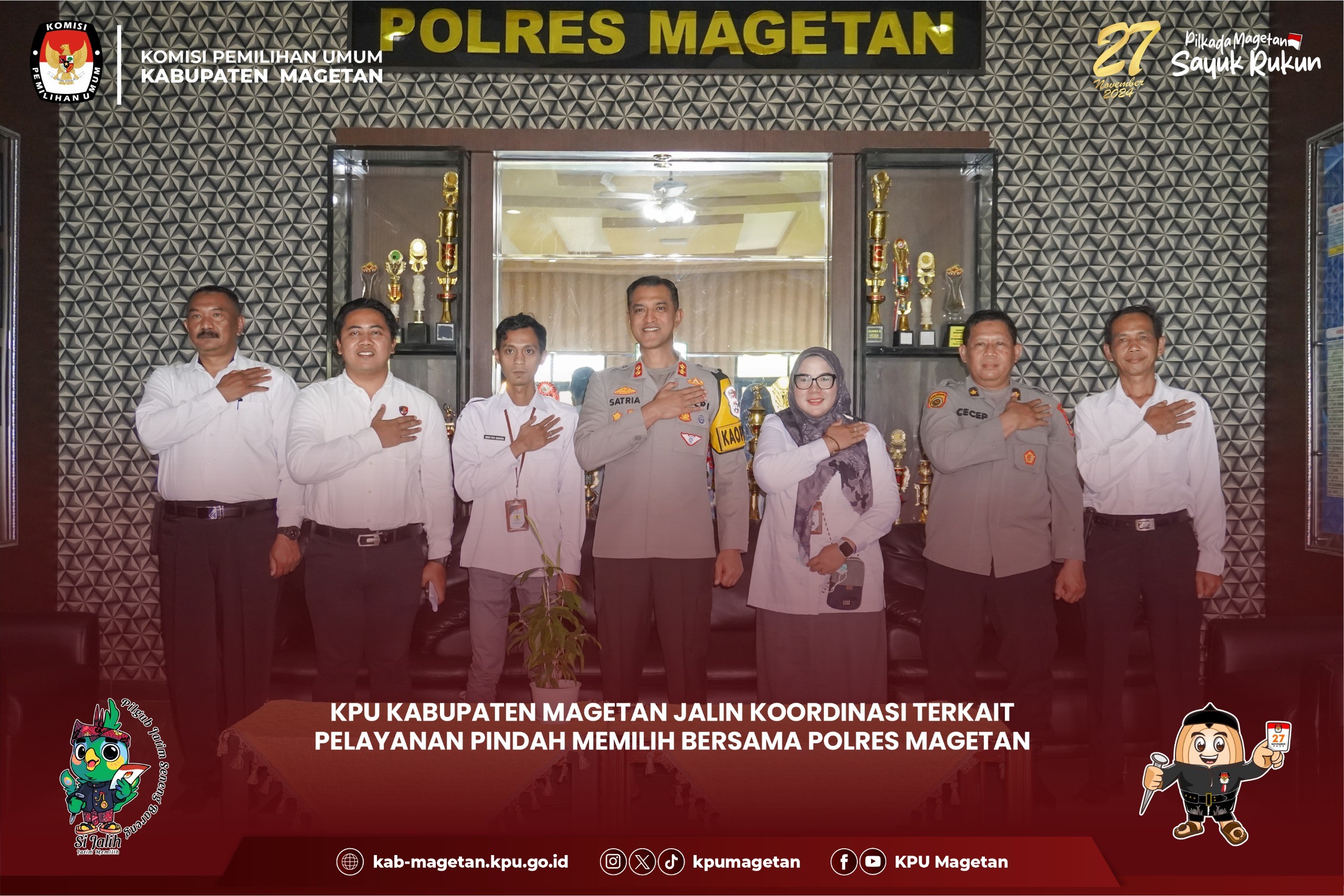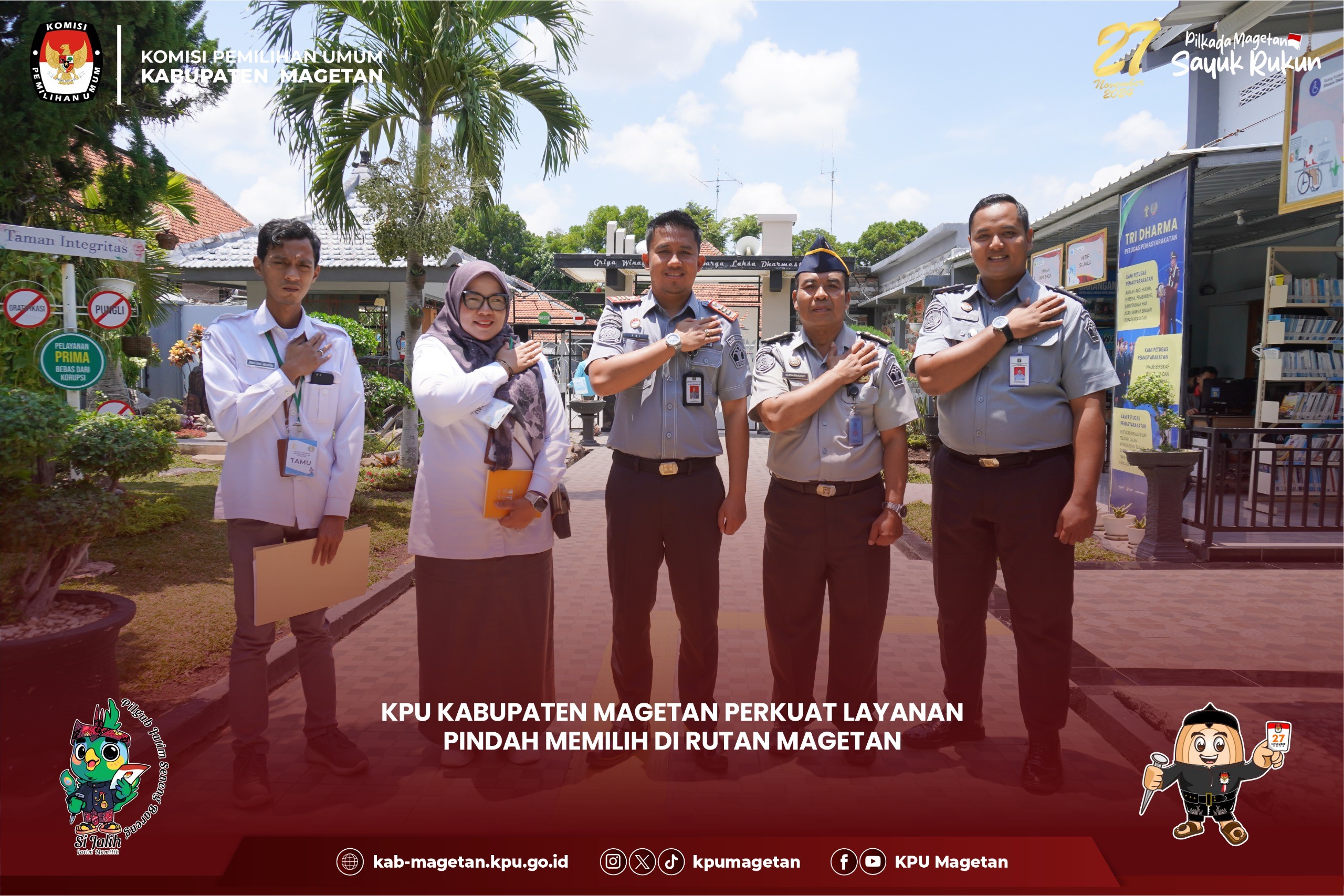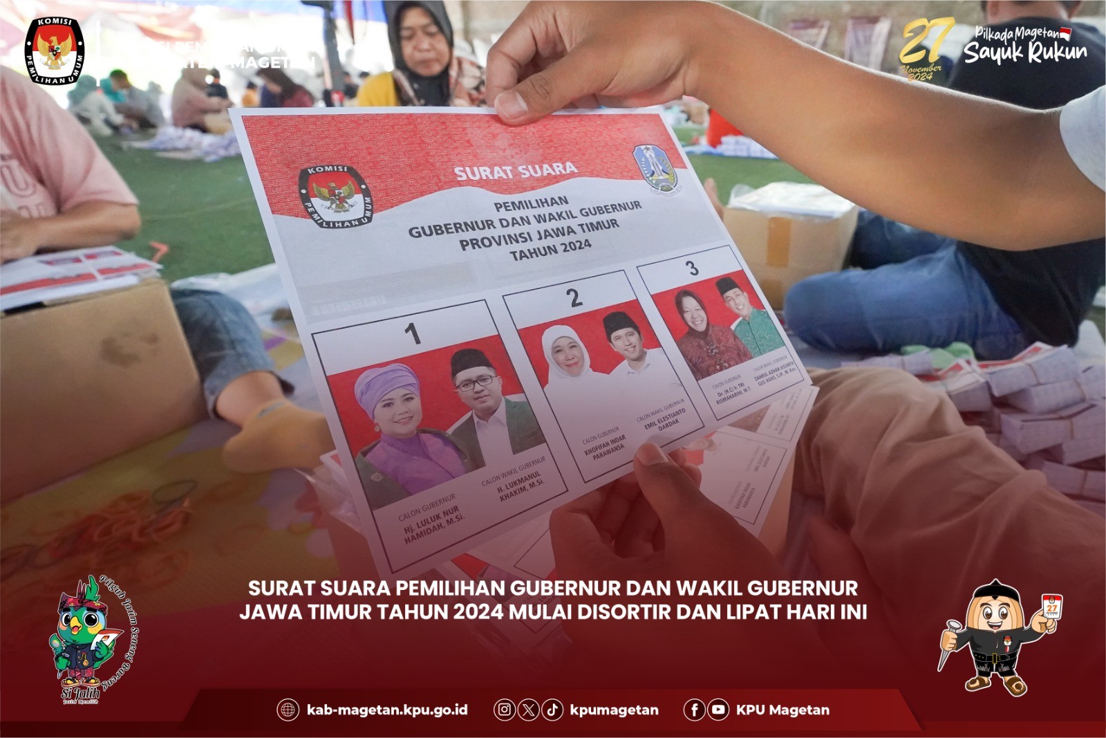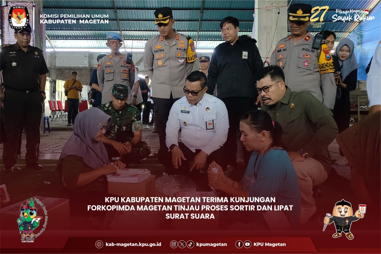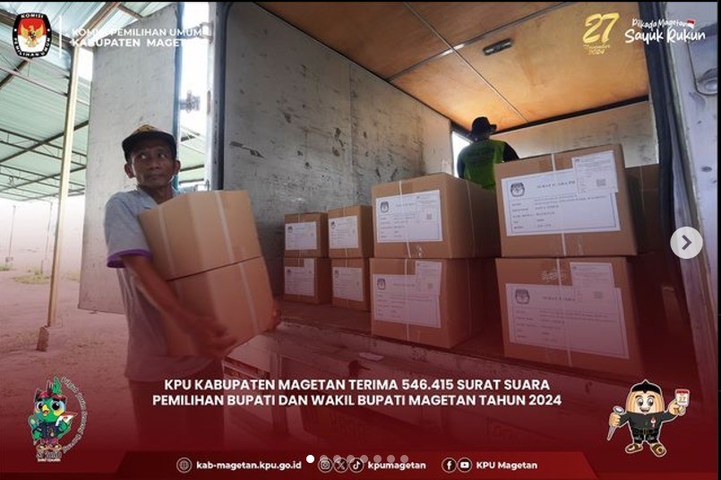 Magetan, kab-magetan.kpu.go.id - KPU Kabupaten Magetan menerima kunjungan dari Forum Koordinasi Pimpinan Daerah (Forkopimda) Kabupaten Magetan pada Rabu, (30/10) di Gudang Logistik KPU Kabupaten Magetan. Kunjungan tersebut dipimpin oleh Pj. Bupati Magetan, Kapolres, dan Dandim, Kejari, dan DPRD yang hadir untuk meninjau langsung proses surat suara Pilkada Serentak 2024. Kunjungan Forkopimda ini difokuskan pada gudang logistik KPU Kabupaten Magetan, tempat penyimpanan dan distribusi berbagai peralatan serta material yang akan digunakan dalam pelaksanaan Pilkada Serentak tahun 2024. Kasubbag Keuangan, Umum, dan Logistik KPU Kabupaten Magetan, Sundarso menjelaskan progres proses sortir dan lipat surat suara. "Hari ini sudah memasuki hari ketiga proses sortir dan lipat surat suara pemilihaan Bupati dan Wakil Bupati Magetan tahun 2024 yang kami targetkan selesai pada hari inni," ungkapnya. Pj. Bupati Magetan, Nizhamul mengapresiasi terkait sarana prasarana gudan logistik KPU Magetan. "Tempatnya safety dan sesuai untuk dijadikan tempat penyimpanan logistik Pilkada Serentsk tahun 2024," pujinya. (br)