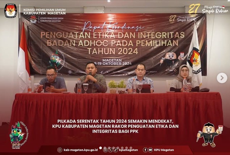 KPU Kabupaten Magetan pastikan penyelenggara pilkada tingkat kecamatan jaga etika dan integritas selama tahapan Pilkada serentak. Ini dilakukan lewat Rapat Koordinasi Penguatan Etika dan Integritas Badan Adhoc Pemilihan Tahun 2024 di Kintamani Sarangan (18-19/10). Anggota KPU Kabupaten Magetan Divisi Hukum dan Pengawasan, Istikah, ungkap pentingnya PPK pegang kode etik penyelenggara. “Penguatan etika dan integritas bagi penyelenggara pilkada dengan tetap memegang kode etik serta pakta integritas yang sudah ditandatangani oleh seluruh badan adhoc,” jelasnya. Narasumber Rapat Koordinasi dari Kejaksaan Negeri Magetan, Andi Sofyan, sampaikan alur penanganan pelanggaran kode etik. “Alur penanganan pelanggaran kode etik, kode perilaku, sumpah/janji, dan/atau pakta integritas berdasarkan hasil pengawasan internal, antara lain dilakukan rapat pleno yang dituangkan dalam berita acara. Bila tidak ada dugaan pelanggaran, proses dihentikan. Jika ada, dilakukan verifikasi dan klarifikasi, hasil verifikasi dituangkan ke berita acara, kemudian dilakukan rapat pleno. Bila tidak ditemukan dugaan pelanggaran, penanganan dihentikan dan disampaikan kepada PPK, PPS, KPPS yang bersangkutan. Jika ditemukan dugaan pelanggaran, dilakukan pemberhentian sementara dan dibentuk tim pemeriksa,” terang kasat intel Kejaksaan Magetan ini. Sementara itu, narasumber kedua, DR. Ahmad Hudri, sampaikan pentingnya PPK jaga azas penyelenggara pemilu. “Mandiri, Jujur, Adil, Kepastian hukum, Tertib, Kepentingan umum, Keterbukaan, Proposional, Profesional, Akuntabilitas, Efisiensi, dan Efektivitas merupakan 12 azas penyelenggara pemilu yang harus dipegang PPK. Bila disimpulkan, kedua belas azas ini menjadi satu, yaitu istikomah menjalankan azas tersebut,” terang pria yang pernah jadi Ketua KPU Kota Probolinggo ini. (sgt)