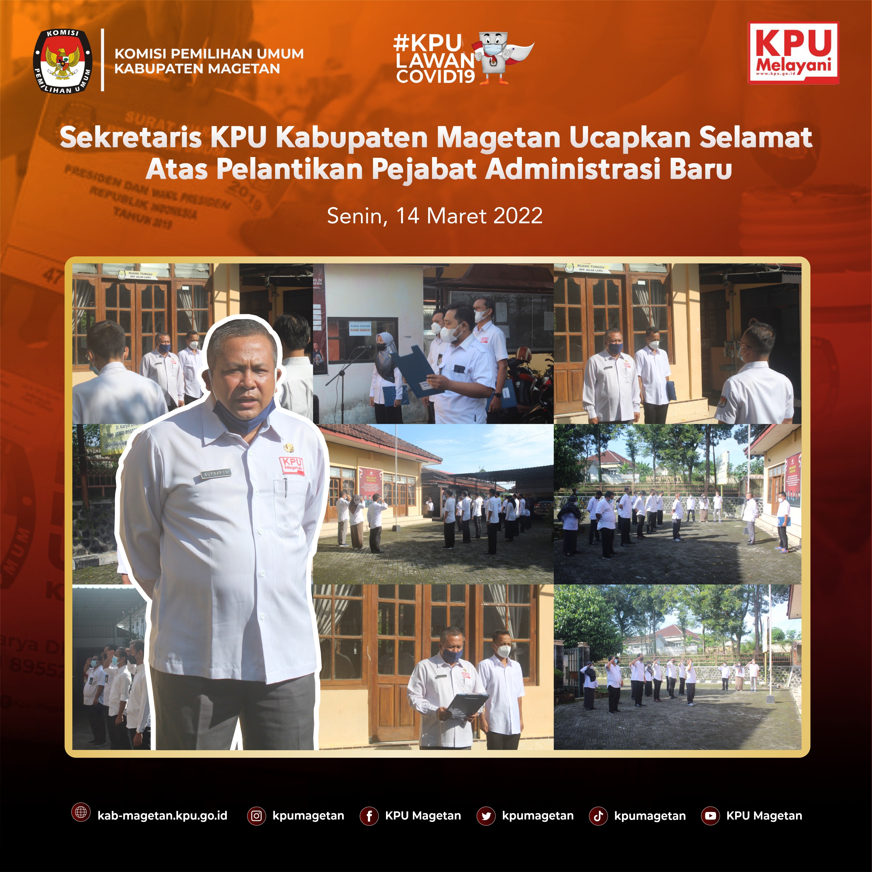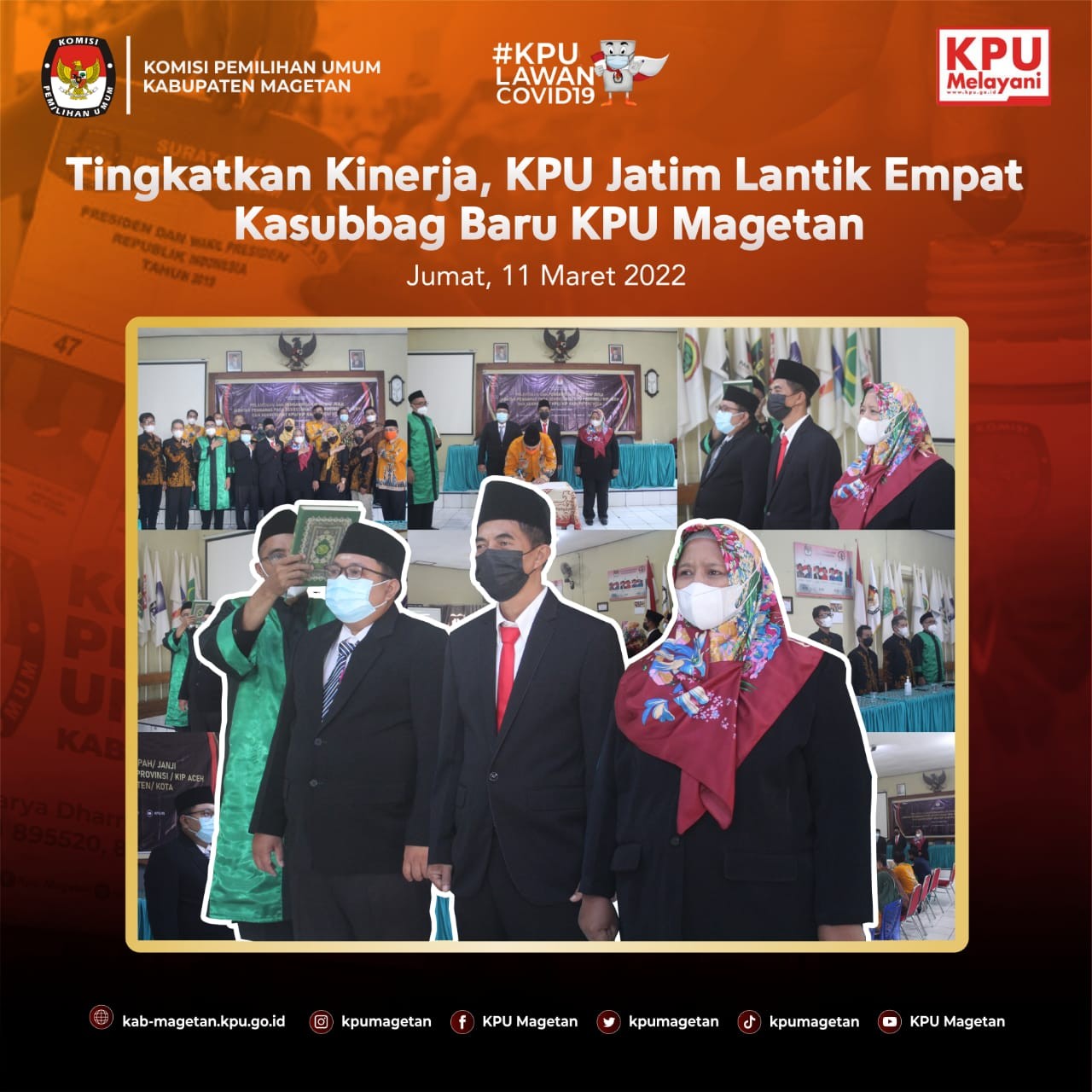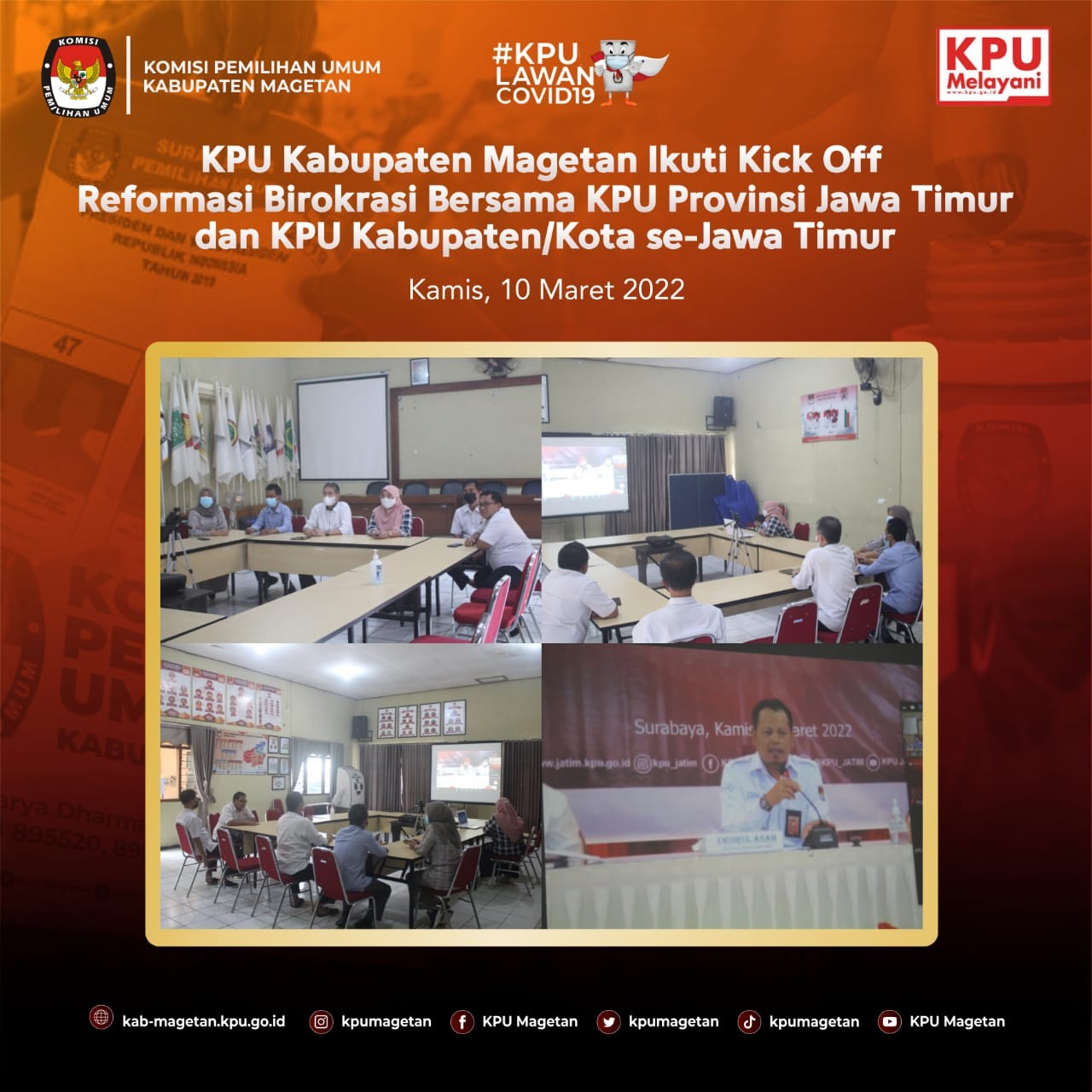 kab-magetan.kpu.go.id - KPU Provinsi Jawa Timur melaksanakan prosesi pelantikan dan pengambilan sumpah/janji jabatan pengawas, Jumat (11/3). Kegiatan dilaksanakan secara luring di KPU Provinsi Jatim dan daring di seluruh satuan kerja KPU Kabupaten/Kota se-Jawa Timur. Prosesi yang dilaksanakan secara daring di Aula Jalak Lawu KPU Kabupaten Magetan, dihadiri oleh seluruh pimpinan, kasubbag dan seluruh staf. Terdapat beberapa perubahan dalam struktur kesekretariatan KPU Kabupaten Magetan, seperti Kasubag Subbagian Teknis dam Hupmas KPU Kabupaten Magetan, Andik Indarto diangkat menjadi Kasubag Subbagian Hukum dan SDM KPU Kabupaten Kediri, Dina Triasmadji yang sebelumnya menjabat sebagai Kasubag Subbagian Hukum dan SDM KPU Kabupaten Magetan diangkat menjadi Kasubag Subbagian Teknis dan Hupmas KPU Kabupaten Jombang, dan Tri Wahyu yang sebelumnya menjabat sebagai staf KUL KPU Kabupaten Magetan kini menjabat sebagai Kasubag Subbagian Hukum dan SDM KPU Kabupaten Madiun. Sedangkan, Ervan Rifai dan Sundarso tetap menjabat sebagai Kasubag Program dan Data dan Kasubag KUL KPU Kabupaten Magetan. Untuk posisi Kasubag Subbagian Teknis dan Hupmas KPU Kabupaten Magetan sendiri diisi oleh Priyo Susilo dan Sulistyoani mengisi jabatan sebagai Kasubag Subbagian Hukum dan SDM KPU Kabupaten Magetan. Khusus untuk Priyo Susilo, ia dilantik oleh KPU Provinsi Kalimantan Timur. Sekretaris KPU Kabupaten Magetan, Suprapto mengucapkan selamat kepada pegawai yang dilantik hari ini. "Saya ucapkan selamat bagi semua pegawai yang dilantik pada hari ini, semoga tetap amanah dan tetap menjunjung tinggi profesionalisme dalam bekerja. Untuk saudara Andik Indarto, Dina Triasmadji, dan Tri Wahyu yang meninggalkan KPU Kabupaten Magetan, saya harapkan yang terbaik di tempat barunya. Dan saya ucapkan selamat datang kepada saudari Sulistyoani dan saudara Priyo Susilo di keluarga besar KPU Kabupaten Magetan. Semoga dapat segera beradaptasi di lingkungan KPU Kabupaten Magetan dan kami tidak sabar untuk segera bekerja sama dengan anggota keluarga baru KPU Kabupaten Magetan ini." Pungkasnya.