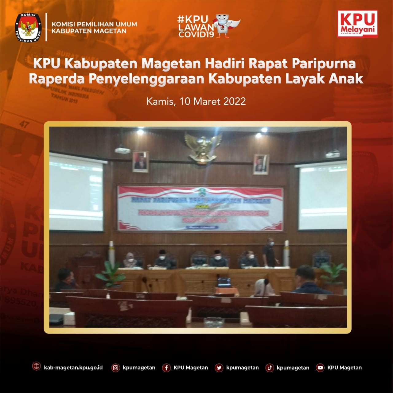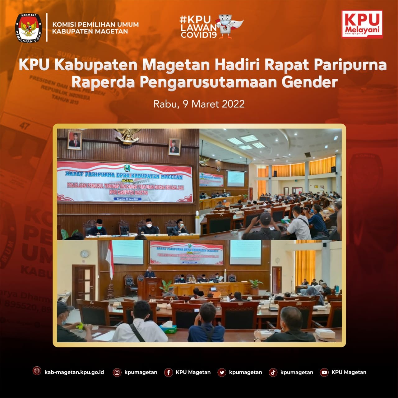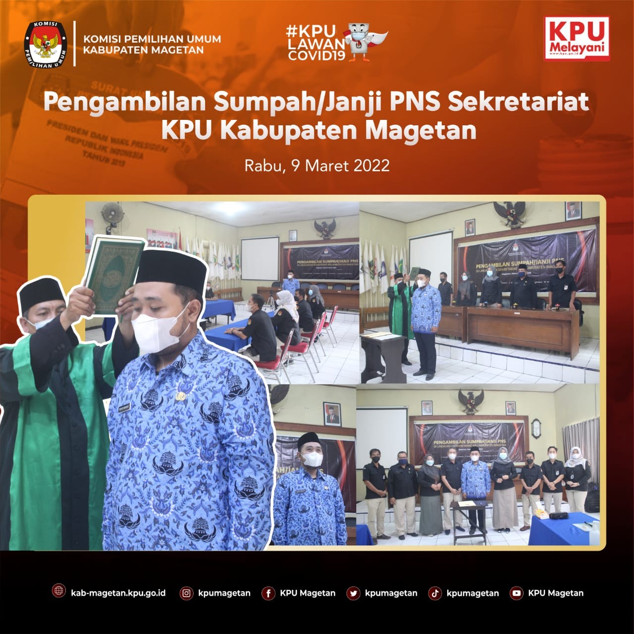 kab-magetan.kpu.go.id - KPU Provinsi Jawa Timur melaksanakan prosesi pelantikan dan pengambilan sumpah/janji jabatan pengawas, Jumat (11/3). Kegiatan dilaksanakan secara luring di KPU Provinsi Jatim dan daring di seluruh satuan kerja KPU Kabupaten/Kota se-Jawa Timur. Prosesi yang dilaksanakan secara daring di Aula Jalak Lawu KPU Kabupaten Magetan, dihadiri oleh seluruh pimpinan, kasubbag dan seluruh staf. Terdapat beberapa perubahan dalam struktur kesekretariatan KPU Kabupaten Magetan, seperti Kasubag Subbagian Teknis dam Hupmas KPU Kabupaten Magetan, Andik Indarto diangkat menjadi Kasubag Subbagian Hukum dan SDM KPU Kabupaten Kediri, Dina Triasmadji yang sebelumnya menjabat sebagai Kasubag Subbagian Hukum dan SDM KPU Kabupaten Magetan diangkat menjadi Kasubag Subbagian Teknis dan Hupmas KPU Kabupaten Jombang, dan Tri Wahyu yang sebelumnya menjabat sebagai staf KUL KPU Kabupaten Magetan kini menjabat sebagai Kasubag Subbagian Hukum dan SDM KPU Kabupaten Madiun. Sedangkan, Ervan Rifai dan Sundarso tetap menjabat sebagai Kasubag Program dan Data dan Kasubag KUL KPU Kabupaten Magetan. Untuk posisi Kasubag Subbagian Teknis dan Hupmas KPU Kabupaten Magetan sendiri diisi oleh Priyo Susilo dan Sulistyoani mengisi jabatan sebagai Kasubag Subbagian Hukum dan SDM KPU Kabupaten Magetan. Khusus untuk Priyo Susilo, ia dilantik oleh KPU Provinsi Kalimantan Timur. Sekretaris KPU Kabupaten Magetan, Suprapto mengucapkan selamat kepada pegawai yang dilantik hari ini. "Saya ucapkan selamat bagi semua pegawai yang dilantik pada hari ini, semoga tetap amanah dan tetap menjunjung tinggi profesionalisme dalam bekerja. Untuk saudara Andik Indarto, Dina Triasmadji, dan Tri Wahyu yang meninggalkan KPU Kabupaten Magetan, saya harapkan yang terbaik di tempat barunya. Dan saya ucapkan selamat datang kepada saudari Sulistyoani dan saudara Priyo Susilo di keluarga besar KPU Kabupaten Magetan. Semoga dapat segera beradaptasi di lingkungan KPU Kabupaten Magetan dan kami tidak sabar untuk segera bekerja sama dengan anggota keluarga baru KPU Kabupaten Magetan ini." Pungkasnya.