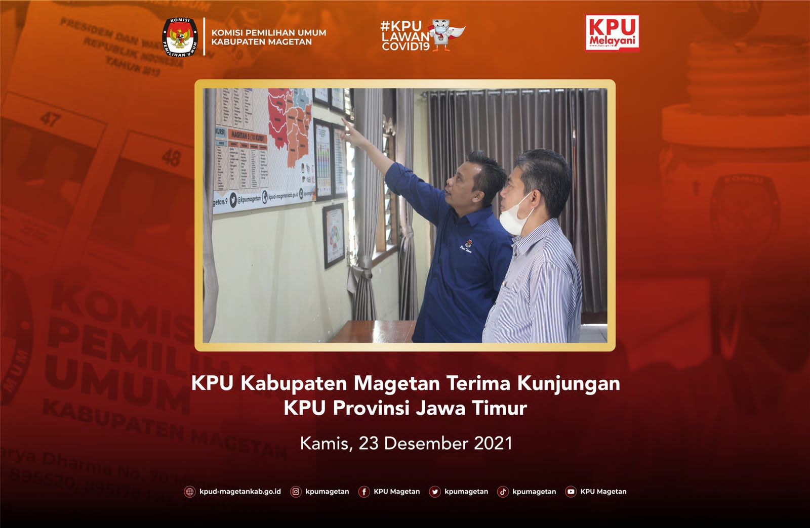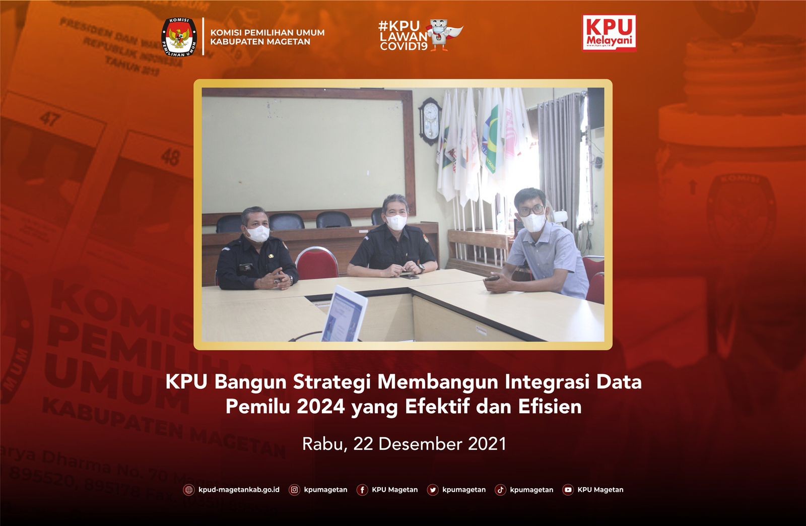 kab-magetan.kpu.go.id - KPU Kabupaten Magetan mengikuti Webinar Seri VII KPU RI secara daring, Rabu (22/12) bertempat di Aula Jalak Lawu KPU Kabupaten Magetan. Tema yang diangkat pada seri ketujuh webinar KPU RI ini adalah "Strategi Membangun Integrasi Data Pemilu 2024 yang Efektif dan Efisien" dengan menghadirkan 2 narasumber yakni Marsudi Wahyu Kisworo, Dewan Pengarah Badan Riset dan Inovasi Nasional (BRIN) dan Gusti Ayu Putri Saptawati, Wakil Rektor Bidang Sumberdaya ITBMarsudi Wahyu Kisworo, Dewan Pengarah Badan Riset dan Inovasi Nasional (BRIN) dan Gusti Ayu Putri Saptawati, Wakil Rektor Bidang Sumberdaya ITB. Ketua KPU RI, Ilham Saputra dalam sambutannya menjelaskan bahwa dalam rangka persiapan untuk menghadapi Pemilu dan Pemilihan Serentak 2024 diperlukan adanya evaluasi terhadap teknologi yang sebelumnya telah digunakan pada Pemilu 2019. "Penting bagi kita untuk mengevaluasi beberapa teknogi yang kita gunakan pada Pemilu 2019 lalu untuk mensukseskan Pemilu dan Pemilihan serentak 2024 mendatang." Ungkapnya. Pemateri pertama, Marsudi Wahyu Kisworo dalam materinya berjudul "Strategi Membangun Data Pemilu Terintegrasi: Pendekatan Arsitektur Enterprise" menjelaskan seperti apa transformasi digital dari KPU dan beberapa pilar penting dalam rangka transformasi digital. Ia menyebut dalam proses transformasi digital ini dibutuhkan adanya sistem yang terintegritasi, yang mana sistem terintegrasi ini dapat meningkatkan kemajuan dan keunggulan organisasi serta mengikatkan efisiensi dan kualitas informasi. Ia juga menjelaskan mengenai tahapan-tahapan dalam mengintegrasikan sistem mulai dari mengorganisasikan sumberdaya hingga standarisasi pengadaan perangkat ralam pengembangan sistem. Gusti Ayu Putri Saptawati sebagai pemateri kedua dengan materinya yang berjudul "Model Integrasi Data Pemilu 2024" menjelaskan mengenai konsep dari integrasi data itu sendiri dimulai dari integrasi data secara fisik maupun logikal. Beberapa poin juga dijelaskan seperti pendekatan/metode identifikasi data kepemiluan, tahapan pelaksanaan pemilu yang dimulai dari perencanaan dan penyusunan peraturan pemilu hingga pengesahan hasil pemilu, memetakan aplikasi khusus pada saat tahapan kepemiluan, dan integrasi data pemilu. Setelah 2 narasumber telag selesai memaparkan materinya, sesi dilanjutkan dengan tanya jawab antara narasumber dengan peserta webinar. Ketua KPU Kabupaten Magetan, Fahrudin mengungkapkan bahwa webinar kali ini dapat digunakan untuk menemukan formulasi yang tepat untuk mengintegrasi data Pemilu. "Narasumber yang hadir kali ini memanglah mereka yang sudah ahli dalam bidang teknologi informasi dan saya berharap ini dapat membantu kita di KPU dalam mengintegrasi data Pemilu mulai dari saat tahapan hingga hasil Pemilu." Jelasnya.