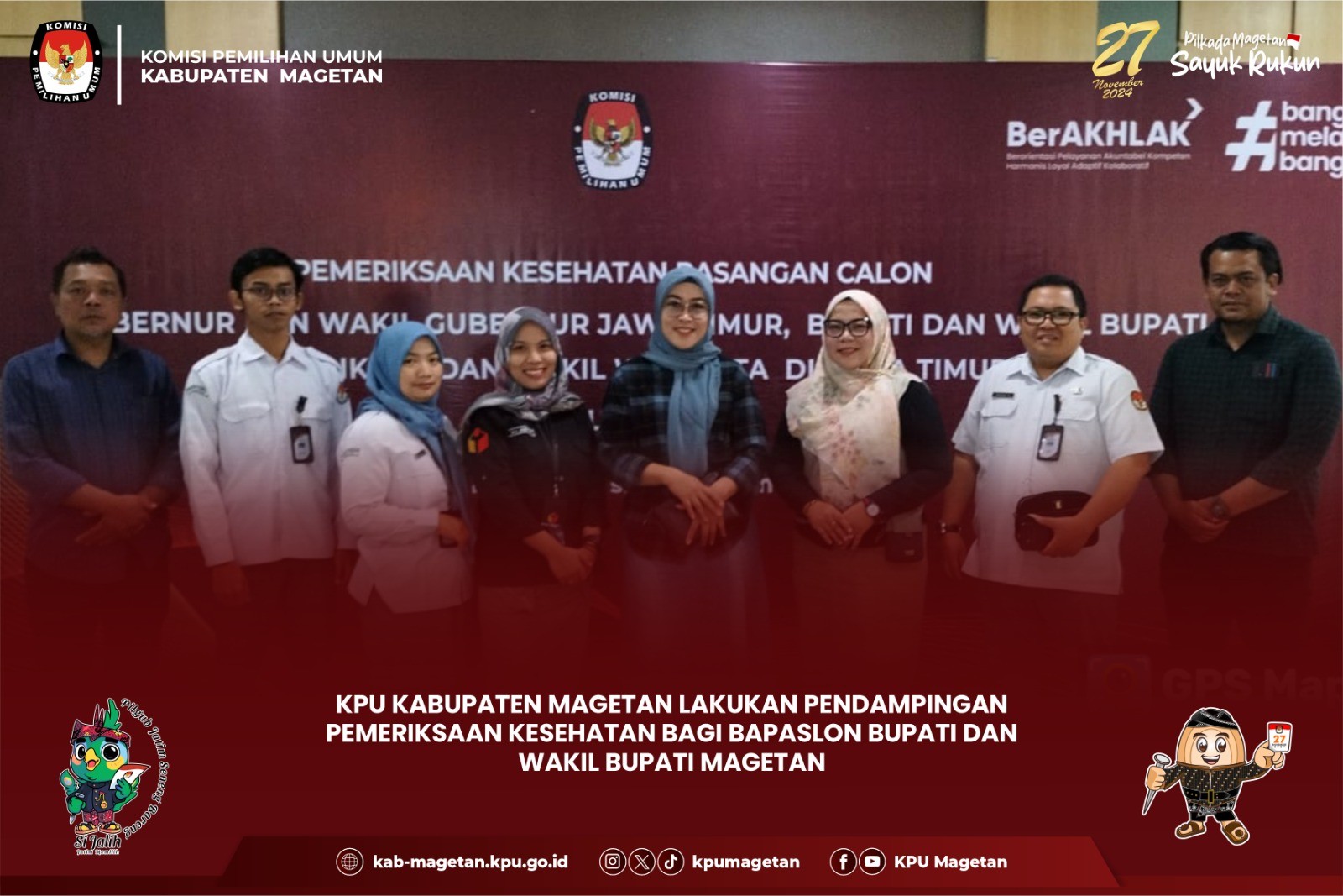 Magetan, kab-magetan.kpu.go.id - KPU Kabupaten Magetan telah melaksanakan pendampingan pemeriksaan kesehatan bagi bakal pasangan calon (bapaslon) Bupati dan Wakil Bupati Magetan di RSUD Dr. Soetomo Surabaya pada 29 Agustus hingga 1 September 2024. Kegiatan ini bertujuan untuk memastikan bahwa setiap calon memenuhi syarat kesehatan yang telah ditetapkan oleh sesuai dengan aturan yang ada. Pendampingan ini merupakan bagian dari proses verifikasi untuk memastikan kelayakan bapaslon dalam melaksanakan tugas sebagai kepala daerah. Proses pemeriksaan kesehatan ini melibatkan serangkaian tes dan evaluasi medis yang dilakukan oleh tim dokter yang berkompeten di RSUD Dr. Soetomo. Tes ini mencakup berbagai aspek kesehatan, mulai dari pemeriksaan fisik umum hingga tes psikologis serta beberapa tes yang lebih mendalam. Ketua KPU Kabupaten Magetan, Noviano Suyide menyampaikan bahwa pemeriksaan kesehatan ini merupakan salah satu syarat wajib yang harus dipenuhi oleh bapaslon sebelum mereka dinyatakan resmi sebagai kandidat dalam pemilihan bupati dan wakil bupati. "KPU Kabupaten Magetan memastikan bahwa seluruh proses ini berjalan dengan lancar dan sesuai dengan ketentuan yang berlaku. Hasil dari pemeriksaan kesehatan ini akan menjadi salah satu pertimbangan dalam penetapan kelayakan bapaslon untuk melanjutkan ke tahap selanjutnya," ungkapnya. Dengan adanya pendampingan ini, diharapkan seluruh bapaslon dapat memenuhi standar kesehatan yang diperlukan dan proses pemilihan kepala daerah Kabupaten Magetan dapat berlangsung dengan adil dan transparan. KPU Kabupaten Magetan berkomitmen untuk terus melaksanakan setiap tahapan pemilu dengan penuh tanggung jawab dan menjaga integritas proses demokrasi di daerah tersebut. (br)