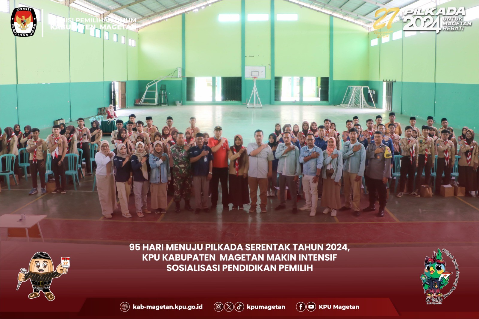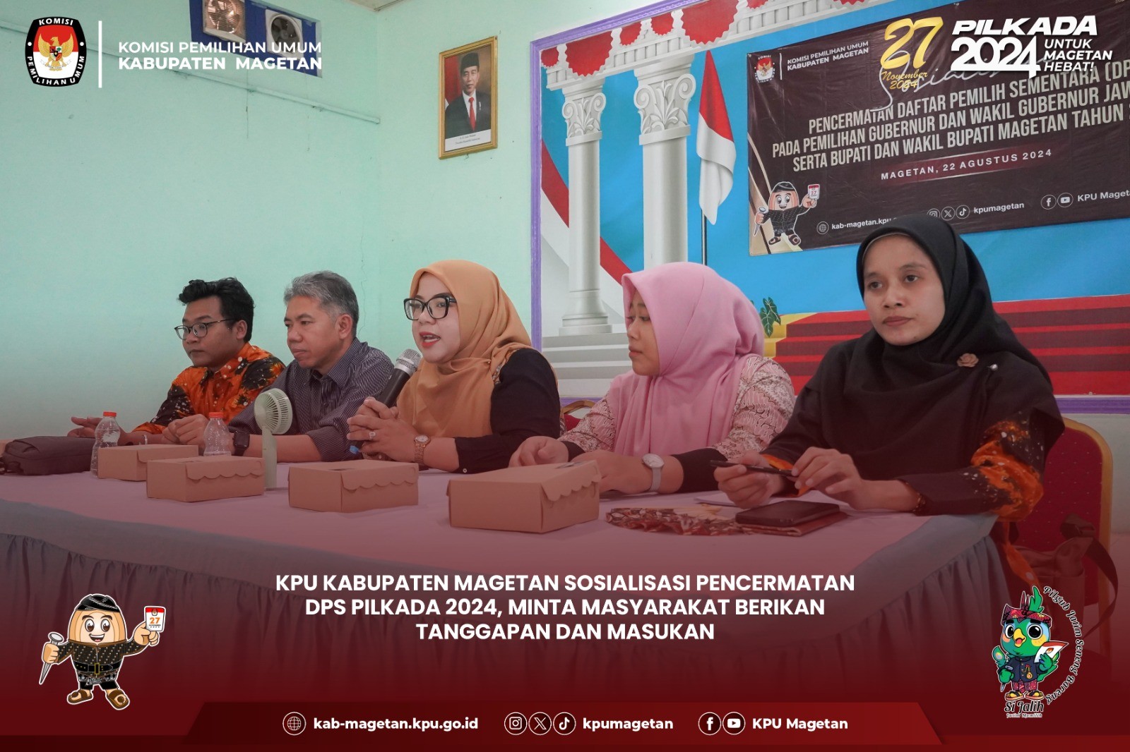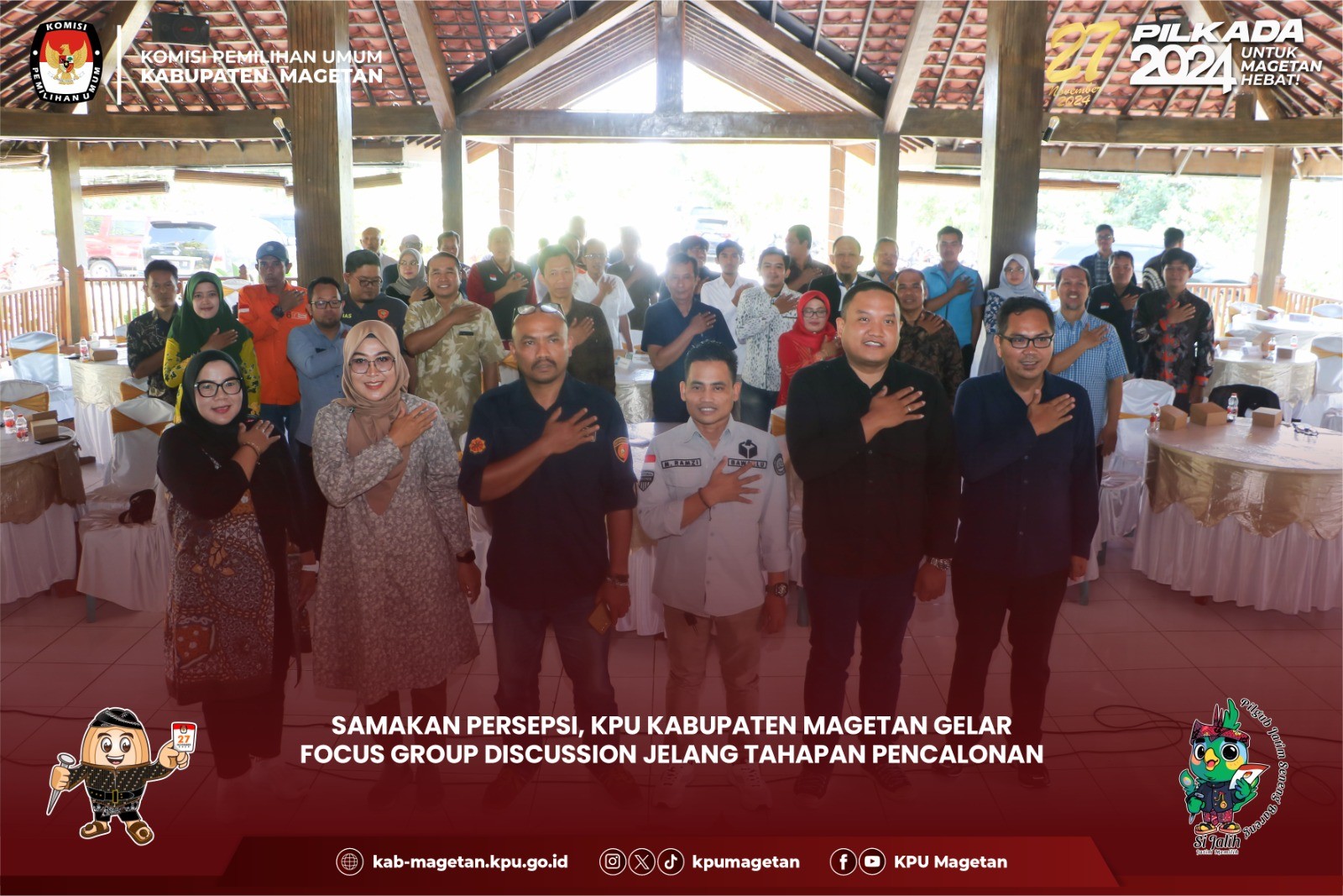 Magetan, kab-magetan.kpu.go.id - 3 hari jelang dibukanya pendaftaran pasangan calon Bupati dan Wakil Bupati Kabupaten Magetan pada Pilkada Serentak 2024, KPU Kabupaten Magetan menggelar Focus Group Discussion (FGD) Mitigasi Pencalonan Pemilihan Bupati dan Wakil Bupati Kabupaten Magetan tahun 2024, Sabtu (24/8) di Joglo Kondang Ayem, Magetan. FGD ini turut mengundang perwakilan Partai Politik se-Kabupaten Magetan, Bakesbangpol, Dinas Perhubungan, Satpol PP, Bagian Hukum Pemerintah Daerah Magetan, Bagian Pemerintahan Daerah Magetan, KP2KP Magetan, Rutan Magetan, Disdukcapil, Kementerian Agama Magetan, dan Dinas Pendidikan, Kepemudaan dan Olahraga Kabupaten Magetan. Divisi Perencanaan Data dan Informasi KPU Kabupaten Magetan, Nanik Yasiroh dalam sambutannya menyebut FGD ini digelar dalam rangka persiapan Pendaftaran Calon Bupati dan Wakil Bupati Magetan pada tanggal 27 - 29 Agustus 2024. "Kegiatan ini juga diharapkan seluruh elemen baik penyelenggara, kontestan dan pengamanan bahkan stakeholder terkait benar-benar siap dalam Pilkada Tahun 2024. Maka mari memaksimalkan kegiatan ini agar Pilkada Magetan tahun 2024 berjalan dengan aman dan kondusif," terang mantan PPK Bendo tersebut. 4 narasumber dihadirkan dalam FGD ini, diantaranya Divisi Teknis Penyelenggara KPU Kabupaten Magetan, Ivan Tri Kumoro, Anggota Bawaslu Magetan M. Ramzi, perwakilan Kejaksaan Negeri Magetan Kejaksaan Negeri Magetan Oleh Anggih Romadhon, dan perwakilan dari Polres Magetan Iptu Arif Wardoyo. (br)