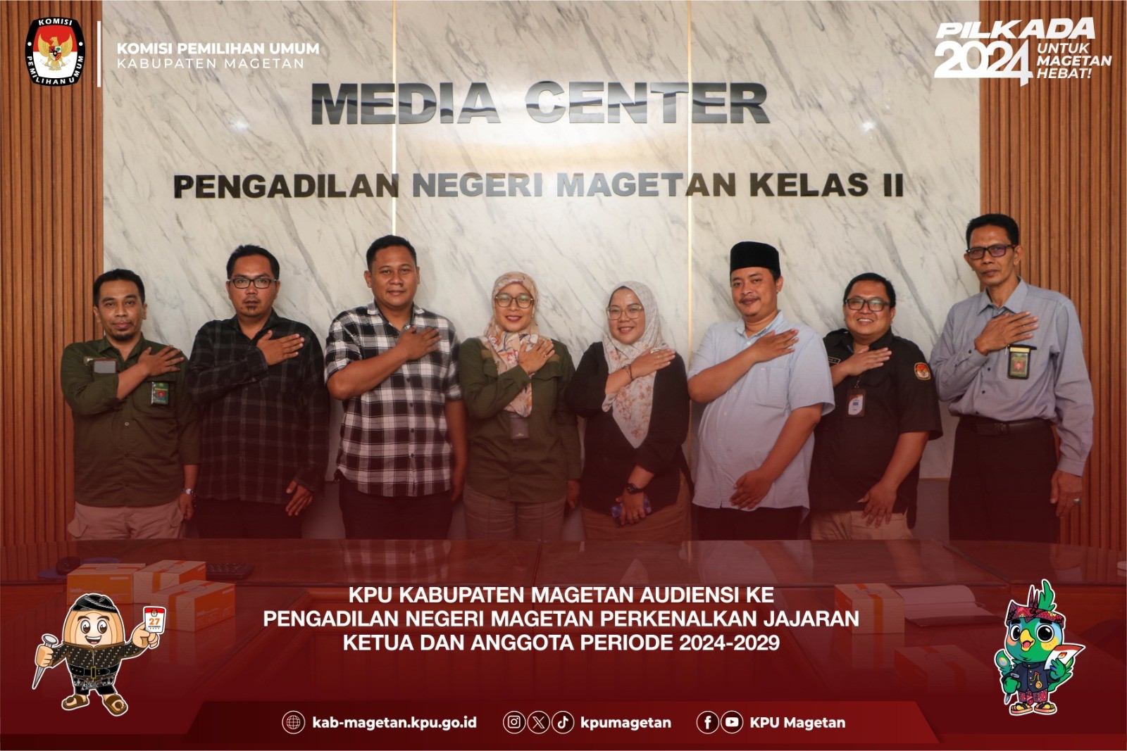 Magetan, kab-magetan.kpu.go.id - KPU Kabupaten Magetan terus memperkuat sinergitas dengan stakeholder yang ada di Kabupaten Magetan. Terkini, KPU Kabupaten Magetan menyambangi Kantor Pengadilan Negeri Magetan dengan tujuan audiensi sekaligus memperkenalkan jajaran Ketua dan Anggota KPU Kabupaten Magetan periode 2024-2029, Rabu (26/6). Ketua KPU Kabupaten Magetan yang baru, Noviano Suyide menyampaikan pentingnya audiensi ini sebagai langkah awal membangun hubungan yang baik dengan berbagai instansi terkait, termasuk Pengadilan Negeri. "Kami merasa penting untuk memperkenalkan diri dan membangun komunikasi yang efektif dengan Pengadilan Negeri. Sinergi ini sangat penting untuk memastikan proses Pilkada berjalan lancar dan sesuai dengan aturan hukum," ujar Noviano. Wakil Ketua Pengadilan Negeri Magetan, Mellina Nawang Wulan yang menyambut kedatangan perwakilan KPU Kabupaten Magetan mengucapkan selamat kepada jajaran Komisioner KPU Kabupaten Magetan yang terpilih. "Kami sangat mengapresiasi kunjungan ini dan siap memberikan dukungan penuh dalam bentuk pendampingan hukum serta pengawasan terhadap proses Pilkada. Kerjasama yang baik antara KPU dan Pengadilan Negeri sangat krusial dalam menciptakan Pilkada yang bersih dan demokratis," sampainya. Dengan terjalinnya komunikasi yang baik antara KPU dan Pengadilan Negeri, diharapkan penyelenggaraan Pilkada di Kabupaten Magetan dapat berjalan dengan lebih transparan, adil, dan akuntabel, serta mampu meningkatkan partisipasi masyarakat dalam proses demokrasi. (br)