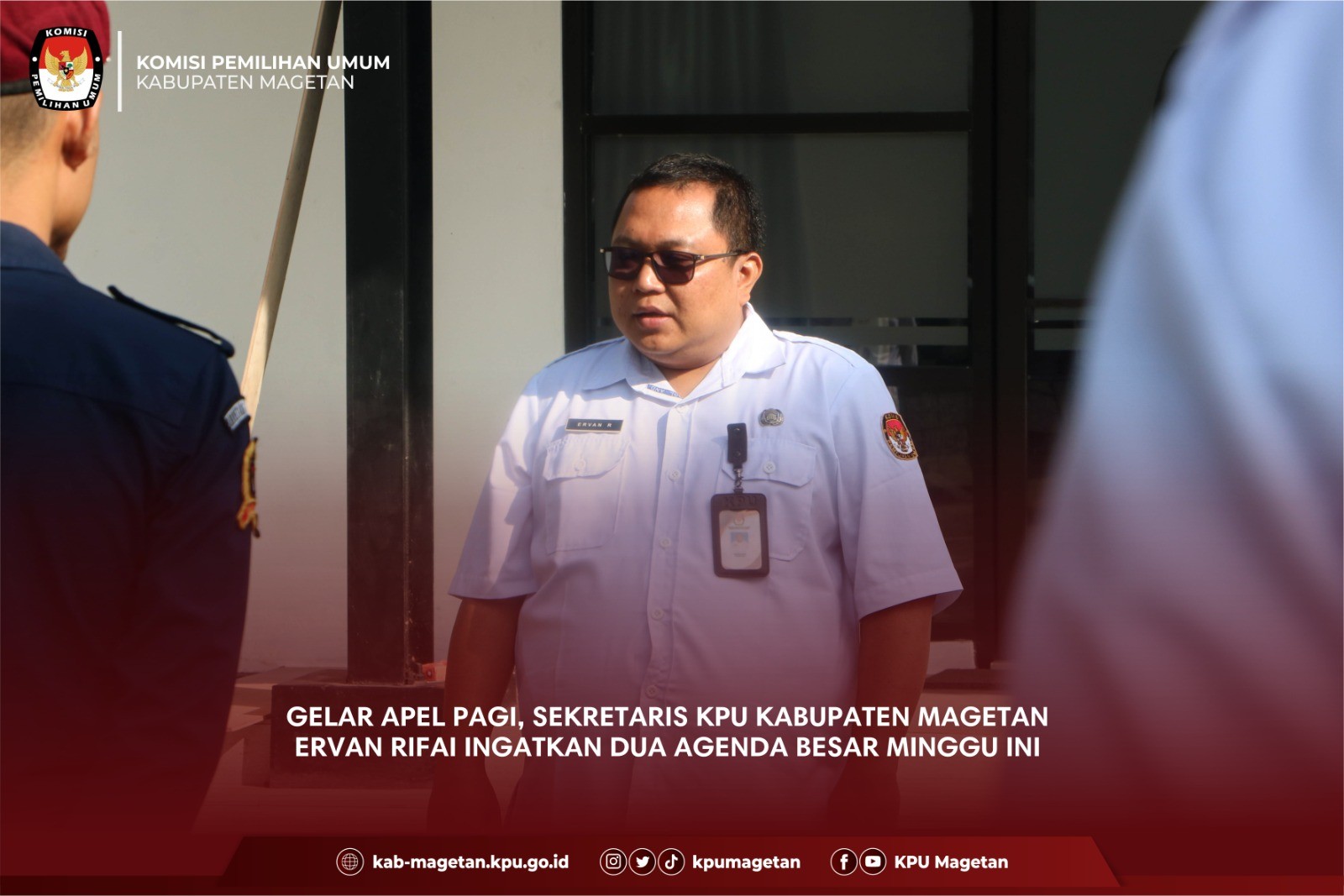 Magetan, kab-magetan.kpu.go.id - Jajaran KPU Kabupaten Magetan menggelar apel pagi di halaman depan kantor secretariat KPU Kabupaten Magetan, Senin (13/5). Sekretaris KPU Kabupaten Magetan, Ervan Rifai, bertindak sebagai pembina apel dan memberikan pesan kepada seluruh pegawai untuk menjaga kondisi kesehatan dengan baik. Hal ini mengingat ada dua agenda besar yang akan dihadapi, yakni pelantikan PPK Pilkada 2024 terpilih serta tes tulis calon anggota PPS Pilkada 2024. Dalam pesannya, Ervan Rifai menekankan pentingnya menjaga kesehatan dalam menghadapi dua agenda besar tersebut. "Pelantikan PPK Pilkada 2024 dan tes tulis PPS Pilkada 2024 merupakan tahapan penting dalam persiapan menuju Pilkada yang akan datang. Kondisi kesehatan yang prima diharapkan dapat mendukung kinerja teman-teman semua dalam menjalankan tugas-tugasnya dengan baik," ujarnya. Ervan Rifai juga meminta agar seluruh jajaran saling bahu membahu bekerja sama demi lancarnya giat pada minggu ini. "Lancar tidaknya giat kita pada minggu ini harus kita pastikan Bersama. Seluruh jajaran saya minta untuk saling bekerja sama dan memastikan seluruh kegiatan dapat berjalan dengan baik sebagaimana mestinya," tutupnya. Dengan semangat yang tinggi dan kesadaran akan pentingnya menjaga kesehatan, KPU Kabupaten Magetan siap menghadapi tantangan dalam minggu ini. Dukungan penuh dari seluruh pegawai diharapkan dapat memastikan kelancaran dan suksesnya pelantikan PPK Pilkada 2024 serta tes tulis PPS Pilkada 2024. (br)