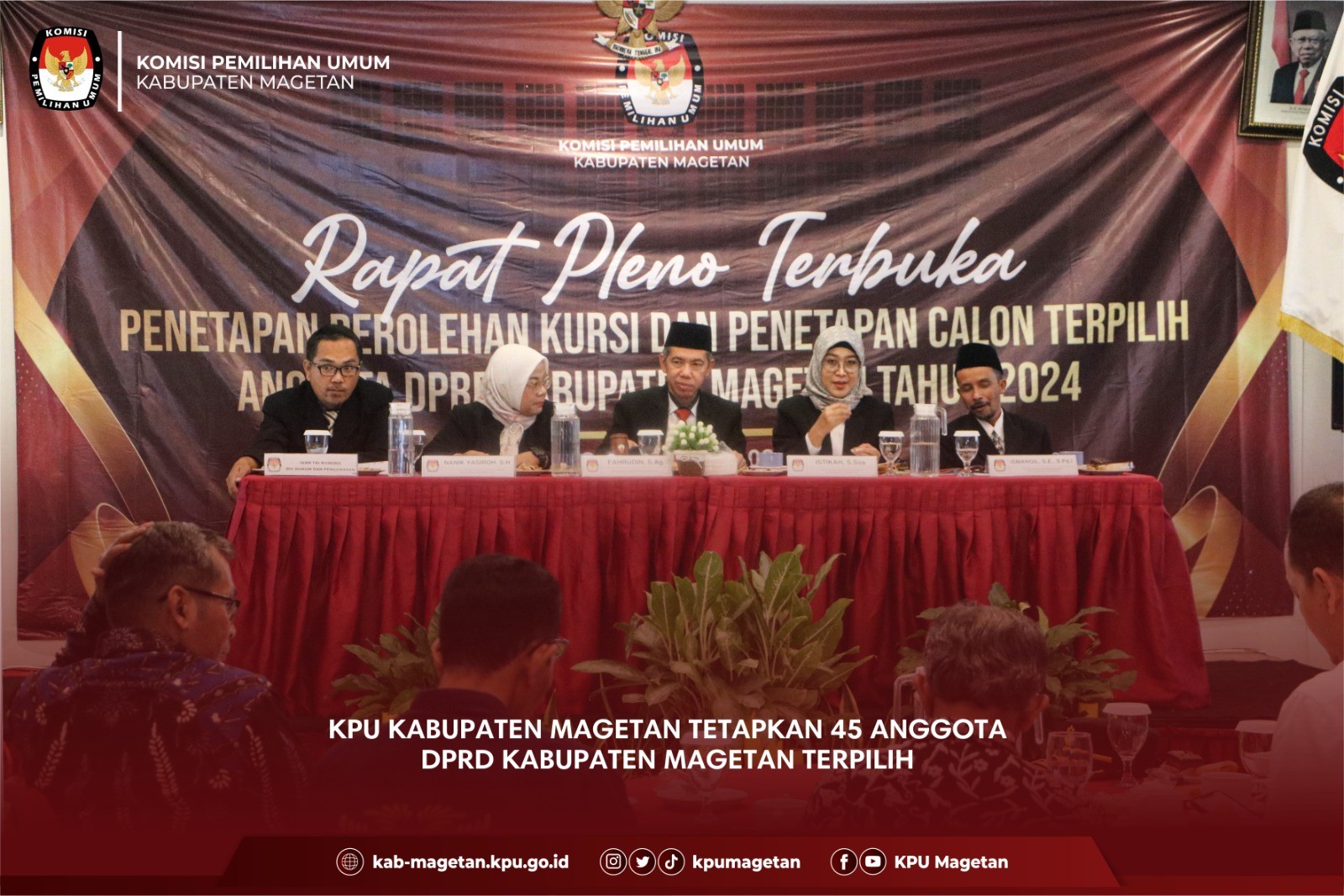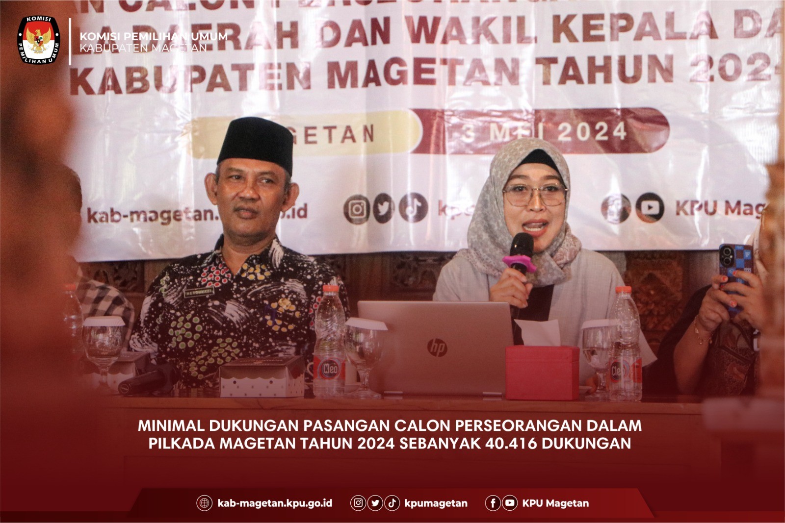 Magetan, kab-magetan.kpu.go.id - KPU Kabupaten Magetan mulai mensosialisasikan tahapan Pilkada 2024 diantaranya Sosialisasi Pemenuhan Persyaratan Dukungan Pasangan Calon Perseorangan pada Pemilihan Bupati dan Wakil Bupati Magetan Tahun 2024, Jum’at (3/5) di RM. Harmada Magetan. Pj.Bupati Magetan Hergunadi menyampaikan ucapan terima kasih kepada masyarakat Magetan sudah menjaga kondusifitas Magetan dalam Pemilu Presiden dan Legislatif. “Kami sampaikan terima kasih untuk masyarakat Magetan terkait Situasi Pemilu Presiden dan Legeslatif 2024 di Magetan berjalan Kondusif, tentu dalam Pilkada 27 November nanti situasi ini sama sama kita ciptakan, Informasi terkait Pilkada ini silahkan disebarluaskan supaya makin banyak calon terbaik untuk bertanding, Pemilu dan Pilkada harus berjalan dengan sportif untuk kemajuan Magetan, tentu lancar prosesnya tanpa mengganggu proses ekonomi kehidupan masyarakat,”Himbaunya. Anggota KPU Magetan Divisi Teknis Istikah menyampaikan Tahapan Pencalonan Pasangan Bupati dan Wakil Bupati dari Jalur Perseorangan. “Pemenuhan Persyaratan Dukungan Pasangan Calon Perseorangan 5 Mei – 19 Agustus 2024, Pengumuman Pendaftaran Pasangan Calon 24 – 26 Agustus 2024, Pendaftaran Dan Penelitian Persyaratan Pasangan Calon 27 Agustus – 21 September 2024, Penetapan Pasangan Calon 22 September 2024, Terangnya. “Keputusan Komisi Pemilihan Umum Kabupaten Magetan No. 1083 Tahun 2024 Tentang Syarat Minimal Dukungan Dan Persebaran Bakal Pasangan Calon Perseorangan Dalam Pemilihan Bupati Dan Wakil Bupati Magetan Tahun 2024 Menetapkan Syarat Minimal Dukungan dan Persebaran Dukungan Bakal Pasangan Calon Perseorangan dalam Pemilihan Bupati dan Wakil Bupati Magetan Tahun 2024 sebanyak 40.416 (Empat Puluh Ribu Empat Ratus Enam Belas) dukungan dan sebaran minimal sebanyak 10 (Sepuluh) Kecamatan dari 18 (Delapan Belas) Kecamatan sebagai dasar dalam pemenuhan persyaratan dukungan minimal pemilih bagi bakal pasangan calon perseorangan dalam Pemilihan Bupati dan Wakil Bupati Magetan Tahun 2024,”Pungkas Perempuan Alumni Fakultas Fisip Universitas Muhammadiyah Malang ini. (sgt).