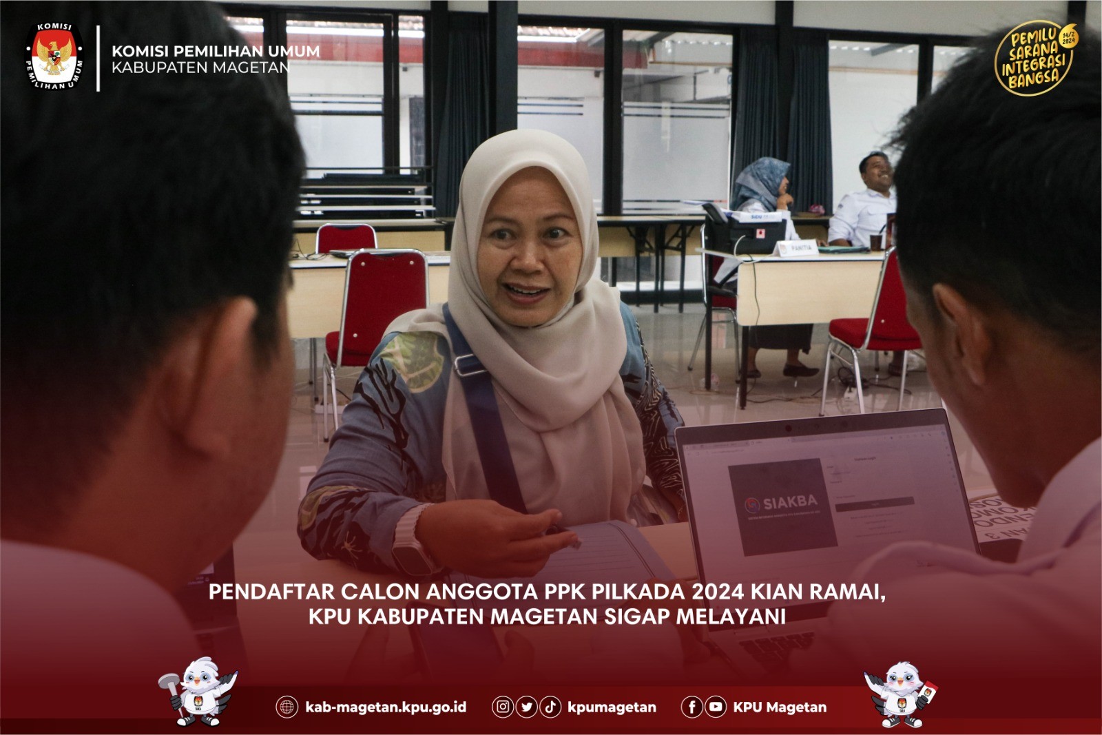 Magetan, kab-magetan.kpu.go.id - Pendaftaran Calon Anggota (PPK) untuk Pemilihan Kepala Daerah (Pilkada) 2024 di Kabupaten Magetan semakin ramai dengan antusiasme para calon yang ingin mencalonkan diri. Kamis, (25/4) KPU Kabupaten Magetan mencatat lonjakan peminat yang signifikan sejak dibukanya pendaftaran. Demi mempermudah proses pendaftaran bagi para calon, KPU Kabupaten Magetan telah menyiapkan layanan helpdesk khusus. Helpdesk tersebut berfungsi sebagai pusat pelayanan yang menyediakan bantuan teknis dan informasi terkait persyaratan serta prosedur pendaftaran. Langkah ini diambil sebagai upaya untuk memastikan bahwa proses pendaftaran berjalan lancar dan transparan bagi semua pihak yang berminat. Ketua KPU Kabupaten Magetan, Fahrudin, menyatakan apresiasi atas antusiasme yang ditunjukkan oleh para calon PPK. "Semakin banyaknya peminat PPK menandakan semakin tingginya kesadaran masyarakat akan pentingnya peran dalam pesta demokrasi. Kami berterimakasih atas antusiasme pelamar yang hingga kini semakin ramai berdatangan ke kantor KPU Kabupaten Magetan," Ungkapnya. Dia juga menekankan pentingnya pendaftaran yang sesuai prosedur untuk memastikan keabsahan dan kelayakan setiap calon. Dengan semakin ramainya pendaftar PPK, KPU Kabupaten Magetan mengajak seluruh elemen masyarakat untuk terus mendukung proses demokrasi yang berjalan. (br)