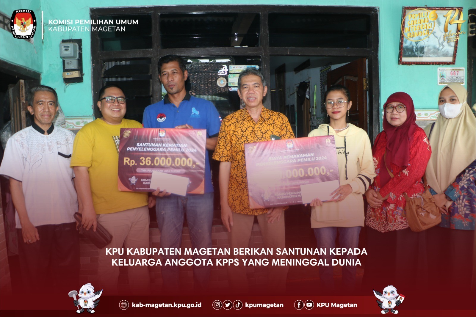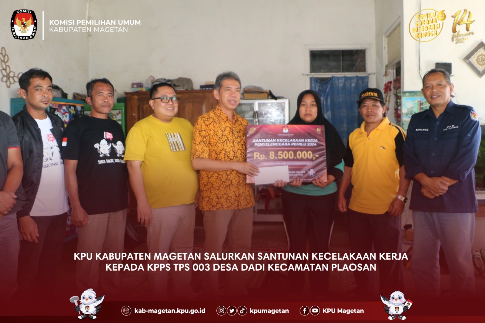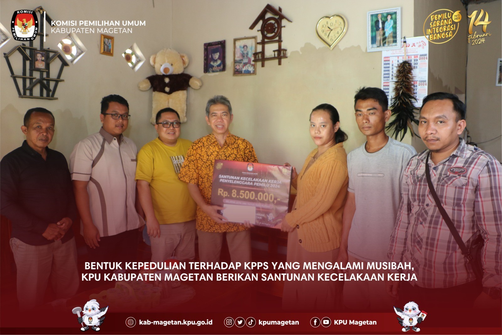 Magetan, kab-magetan.kpu.go.id - KPU Kabupaten Magetan menunjukkan empati dan kepedulian terhadap petugas Kelompok Penyelenggara Pemungutan Suara (KPPS) yang mengalami musibah saat bertugas. Jumat, (23/2) KPU Kabupaten Magetan memberikan santunan kecelakaan kerja kepada Ida Puspita Sari, seorang anggota KPPS di TPS 008 Desa Kalang, Kecamatan Sidorejo, yang mengalami musibah setelah melaksanakan tugasnya dalam Pemilu 2024. Ketua KPU Kabupaten Magetan, Fahrudin menyatakan bahwa pemberian santunan ini merupakan bentuk tanggung jawab moral dan sosial lembaga kepada petugas KPPS yang telah mengalami musibah karena tugas negara. "Santunan yang diberikan diharapkan dapat membantu meringankan beban Ida Puspita Sari dan keluarganya dalam menghadapi masa-masa sulit ini," ungkapnya. Ia juga menyampaikan bahwa pemberian santunan ini merupakan bagian dari program perlindungan kepada seluruh petugas KPPS. "Ini adalah bentuk kepedulian kami terhadap petugas KPPS yang telah bekerja keras demi suksesnya pemilihan umum. Kami berharap bantuan ini dapat meringankan beban Ida Puspita Sari dan keluarganya," ujarnya. Adapun Ida beserta keluarga mengucapkan terimakasih sebesar-besarnya kepada KPU Kabupaten Magetan atas atensi dan kepeduliannya. (br)