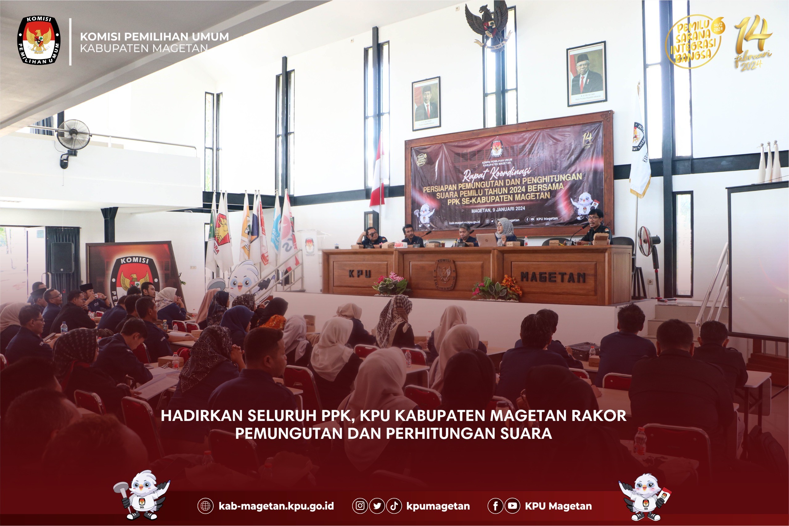 Magetan, kab-magetan.kpu.go.id - Menuju tahapan pemungutan suara Pemilu Serentak 2024 yang jatuh pada hari Rabu 14 Februari 2024, KPU Kabupaten Magetan melakukan Rapat Koordinasi Persiapan Pemungutan dan Perhitungan Suara pada Pemilu 2024 bersama seluruh Panitia Pemilihan Kecamatan (PPK) se-Kabupaten Magetan, Selasa (9/1). Kegiatan Rakor diawali dengan pemaparan umum seluruh Anggota dan Sekretaris KPU Magetan terkait seluruh tahapan Pemilu yang sudah dan sedang berjalan. Anggota KPU Magetan Divisi Hukum dan Pengawasan Ismangil menyampaikan kembali terkait komitmen bersama menjaga integritas sebagai penyelenggara pemilu. “Menjaga Intergitas sebagai Penyelenggara Pemilu menjadi hal terpenting dalam menjaga marwah kelembagaan,”Terang Pria Kelahiran Panekan ini. “PPK harus memahami betul regulasi peraturan,ini langkah penting menghindari proses sengketa Pemilu,”Imbuhnya. Anggota KPU Magetan Divisi Teknis Penyelenggara Istikah menyampaikan beberapa regulasi terkait proses pemungutan dan penghitungan suara pada Pemilu 2024 ”Tahapan yang harus Kita siapkan dalam proses pemungutan dan penghitungan suara diantaranya Pra Pemungutan Suara di TPS, Persiapan Pemungutan Suara di TPS, Pelaksanaan Pemungutan Suara, Persiapan Penghitungan Suara, Pelaksanaan Penghitungan Suara, tahapan ini harus secara utuh dipahamkan kepada KPPS kita,”Terang Perempuan kelahiran trenggalek ini.(sgt)