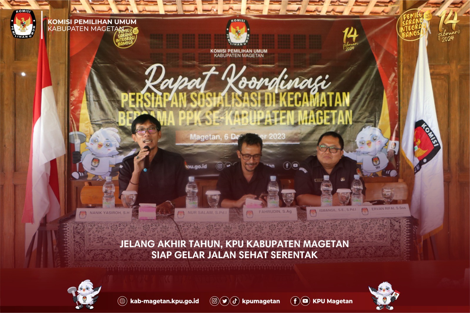 Magetan, kab-magetan.kpu.go.id - Sepekan lebih pasca memasuki masa kampanye, KPU Kabupaten Magetan kumpulkan PPK Divisi Hukum se-Kabupaten Magetan dalam Rapat Koordinasi Upaya Pencegahan Pelanggaran Kampanye pada Pemilu 2024, Rabu (6/12). "Lebih dari 1 pekan kita memasuki masa kampanye, perlu antisipasi jika ada pelanggaran kampanye sehingga kota semua paham tentang apa yang harus dilakukan PPK dan jajaran di bawahnya," Ungkap Divisi Hukum dan Pengawasan KPU Kabupaten Magetan, Ismangil. Beberapa materi disampaikan oleh Ismangil kepada peserta rakor seperti metode kampanye dan terkait APK (Alat Peraga Kampanye). Ia juga kembali mengingatkan tentang lokasi pemasangan APK. "Lokasi pemasangan alat APK wajib dipasang di lokasi yang tidak dilarang berdasarkan Peraturan KPU dan peraturan perundang-undangan terkait." Dalam rakor yang diselenggarakan di Aula Jalak Lawu KPU Kabupaten Magetan in, KPU Kabupaten Magetan juga turut mengundang Kapolres Magetan dan Kejasaan Negeri Magetan sebagai narasumber dan memberikan materi sesuai dengan ranah tugas dan wewenang masing-masing. (br)