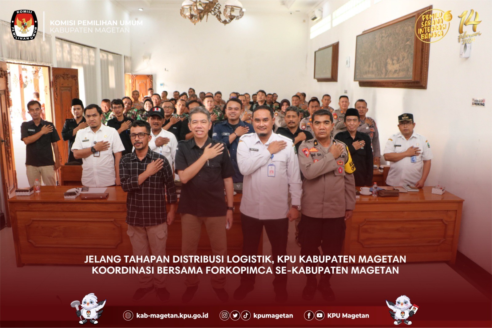Magetan, kab-magetan.kpu.go.id - KPU Kabupaten Magetan mengambil langkah strategis dengan menggelar rapat koordinasi bersama Forkopimcam seluruh Kabupaten Magetan. Rapat ini dilaksanakan sebagai bagian dari persiapan yang matang jelang distribusi logistik Pemilu 2024, Rabu (24/1) bertempat di Harmadha Joglo Magetan. Dalam rapat tersebut, KPU Kabupaten Magetan menyampaikan detail rencana distribusi logistik, termasuk jumlah, jenis, dan waktu pengiriman yang telah diatur secara cermat. Ketua KPU Kabupaten Magetan, Fahrudin menuturkan pentingnya kolaborasi antar stakeholder dalam tahapan ini. "Kolaborasi antara KPU dan pihak keamanan serta pemerintah kecamatan diharapkan dapat meningkatkan pengawasan dan pengamanan selama proses distribusi logistik, sehingga setiap tahapan dapat berjalan tanpa hambatan dan gangguan," jelasnya. Selain itu, Fahrudin juga menjelaskan bahwa rapat koordinasi ini menjadi wadah untuk membahas potensi tantangan atau kendala yang mungkin muncul selama proses distribusi logistik. "Upaya preventif dan solusi cepat dapat dipersiapkan bersama untuk mengatasi situasi yang tidak terduga, sehingga distribusi logistik pemilihan dapat berjalan efisien dan efektif," tambahnya. KPU Kabupaten Magetan berharap bahwa rapat koordinasi ini tidak hanya menjadi langkah awal persiapan logistik pemilihan, tetapi juga membangun sinergi yang erat antara lembaga-lembaga terkait. Kebersamaan ini diharapkan dapat menciptakan iklim kerjasama yang kondusif dan mendukung terlaksananya pemilihan yang demokratis dan bebas dari hambatan logistik. Dalam rakor ini, turut hadir sebagai narasumber diantaranya Asisten Pemerintahan dan Kesejahteraan Rakyat Setdakab Magetan, Benny Adrian serta Kabag Ops Polres Magetan, AKP Sini. (br)