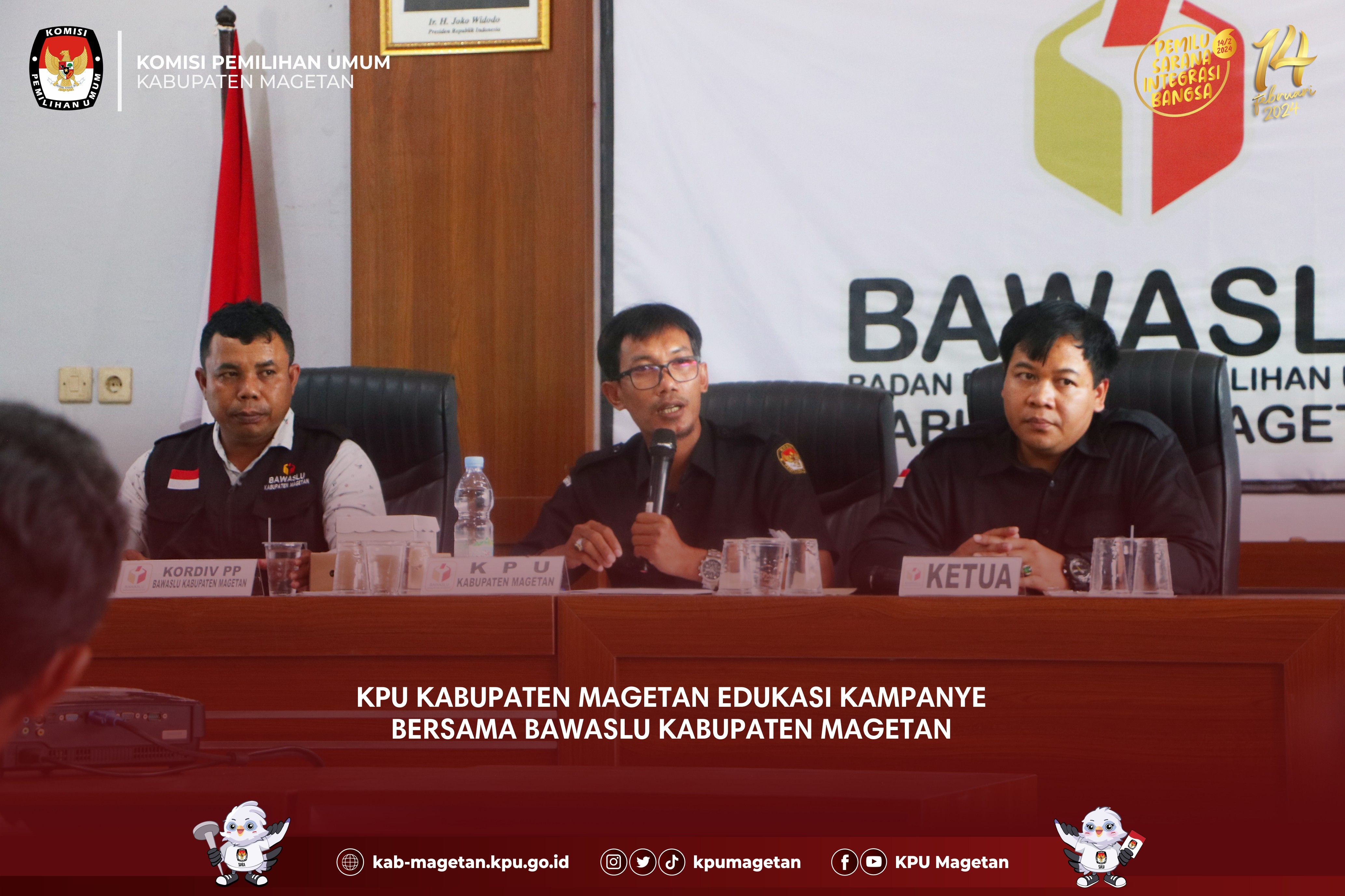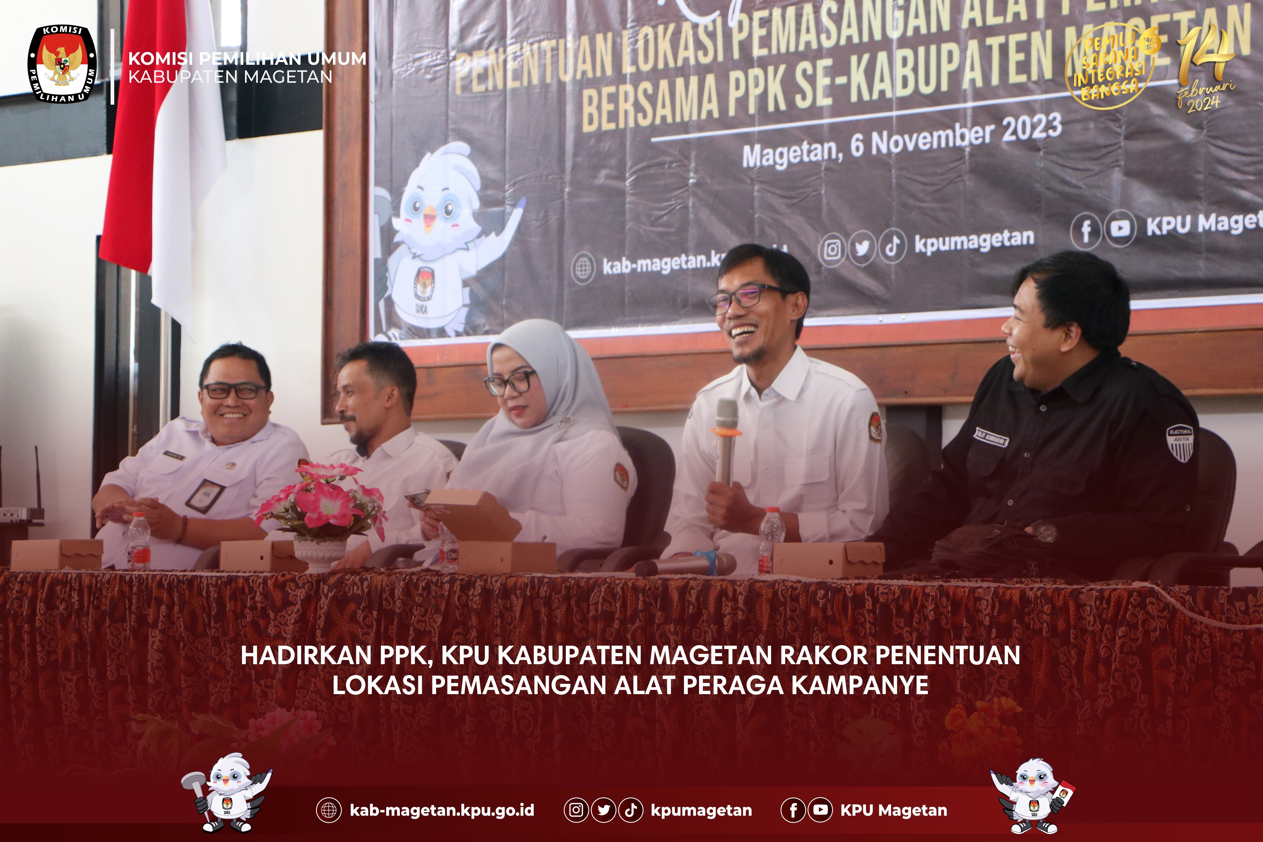kab-magetan.kpu.go.id - Senin, (6/11) KPU Kabupaten Magetan menggelar Rapat Koordinasi Penentuan Lokasi Pemasangan Alat Peraga Kampanye bersama Panitia Pemilihan Kecamatan (PPK) se-Kabupaten Magetan. Anggota KPU Magetan Divisi Perencanaan Data dan Informasi Nanik Yasiroh menyampaikan output dari Rapat Koordinasi ini adalah Surat Keputusan terkait titik lokasi Pemasangan Alat Peraga Kampanye/ APK. “Setelah PPK dan PPS berkoordinasi dengan Pemerintah sesuai tingkatannya terkait Titik Lokasi Pemasangan APK maka segera ditindaklanjuti dengan memerbitkan Berita Acara terkait hal tersebut,” Demikian disampaikan Perempuan yang pernah menjadi Anggota PPK Kecamatan Bendo ini. Anggota KPU Magetan Divisi Sosialisasi,Pendidikan Pemilih dan SDM Nur Salam Menambahkan terkait Metode Kampanye Pertemuan terbatas, Pertemuan tatap muka, Penyebaran bahan Kampanye Pemilu kepada umum; Pemasangan alat peraga Kampanye Pemilu di tempat umum, Media Sosial, Iklan media massa cetak, media massa elektronik, dan Media Daring, Rapat umum, Debat Pasangan Calon tentang materi Kampanye Pemilu Pasangan Calon, Serta Kegiatan lain yang tidak melanggar larangan Kampanye Pemilu dan ketentuan peraturan perundang-undangan. “PPK segera melakukan Rapat Koordinasi dengan Pihak Pemerintah sesuai tingkatannya memastikan Titik Lokasi Pemasangan Alat Peraga Kampanye, daerah sepanjang jalan mana yang diperbolehkan terpasang APK harus dikoordinasikan dengan pihak terkait,”Tutur Pria Kelahiran Kediri ini. Kegiatan Rapat Koordinasi Penentuan Lokasi Pemasangan Alat Peraga Kampanye ini diikuti Seluruh Anggota Panitia Pemilihan Kecamatan dilanjutkan dengan Pemberian Apresiasi atas dukungan PPK se Kabupaten Magetan atas Suksesnya Pelaksanaan Kirab Pemilu 2024 berupa Piagam Penghargaan dengan beberapa Kategori . (sgt)