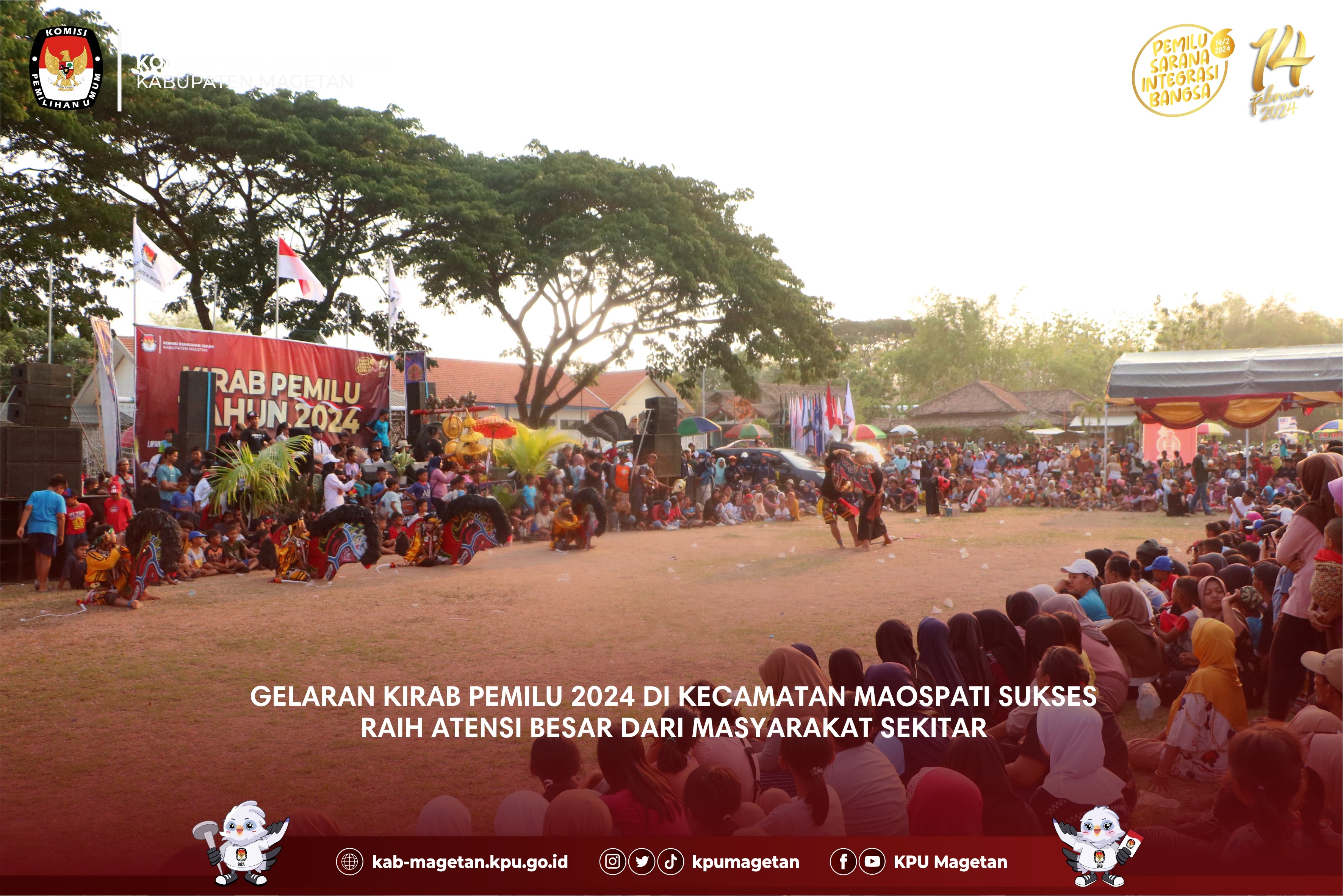 Turut hadir diantaranya Camat dan Forkopimca Kecamatan Sukomoro serta Divisi Teknis Penyelenggaraan Pemilu KPU Kabupaten Magetan, Istikah. Berbagai macam hiburan ditampilkan pada Kirab Pemilu 2024 di Kecamatan Maospati seperti electone, jaranan, dan ganongan serta special perfomance berupa flashmob dari PPK dan PPS dari Kecamatan Maospati, Bendo, Sukomoro dan Ngariboyo. Berbagai penampilan ini sukses membuat masyarakat tumpah ruah membaur menjadi satu dengan PPK dan PPS dari Kecamatan Maospati, Bendo, Sukomoro dan Ngariboyo.