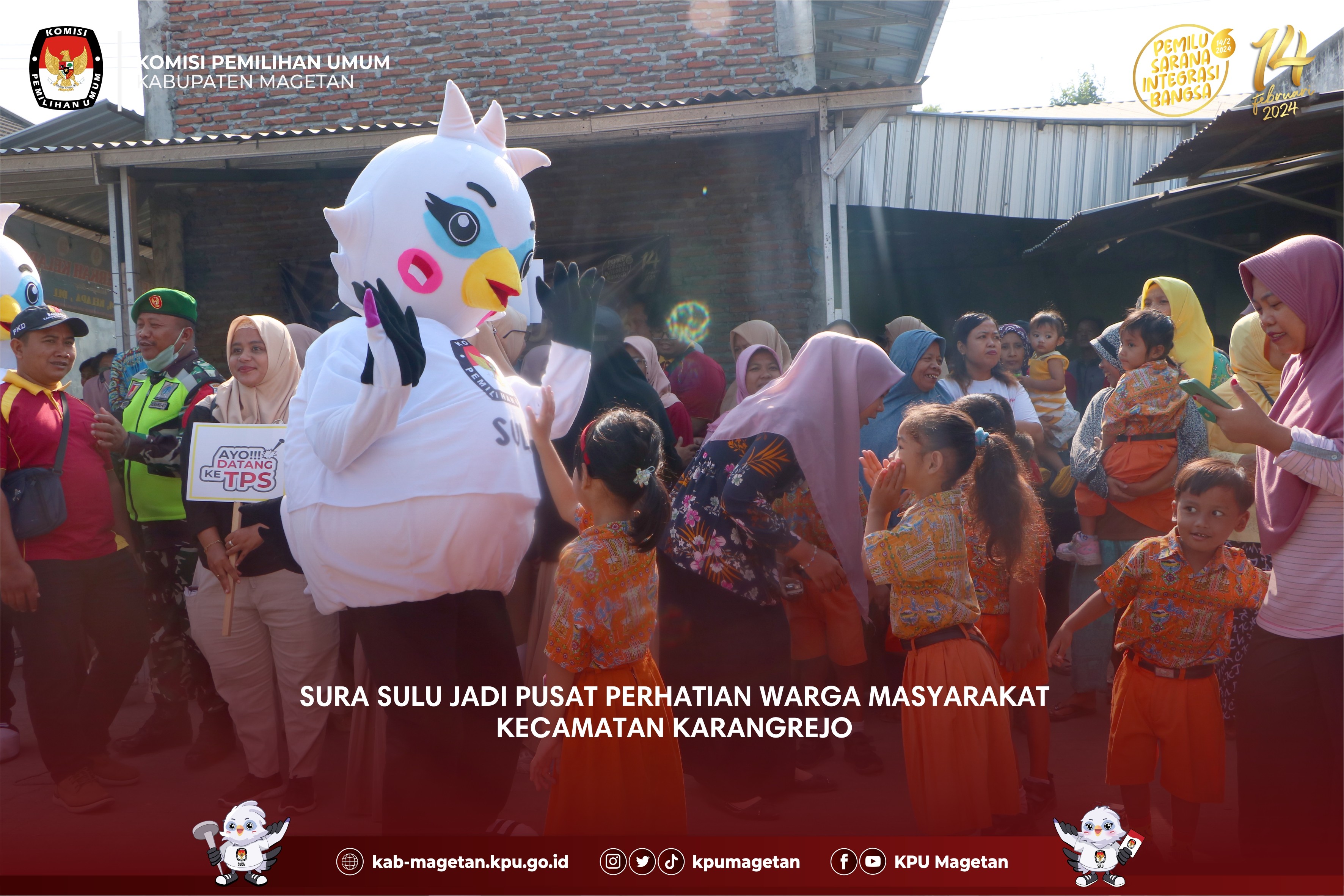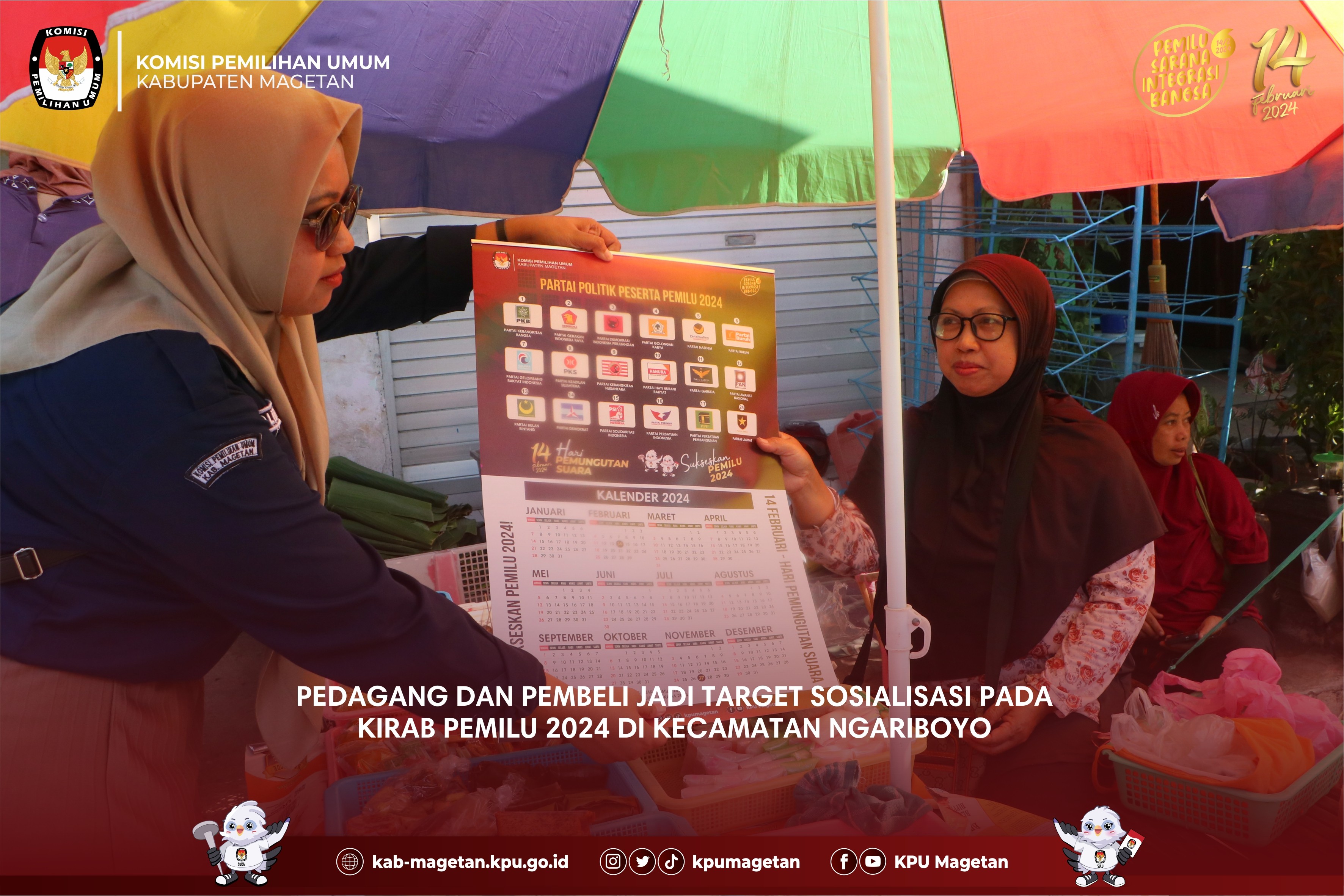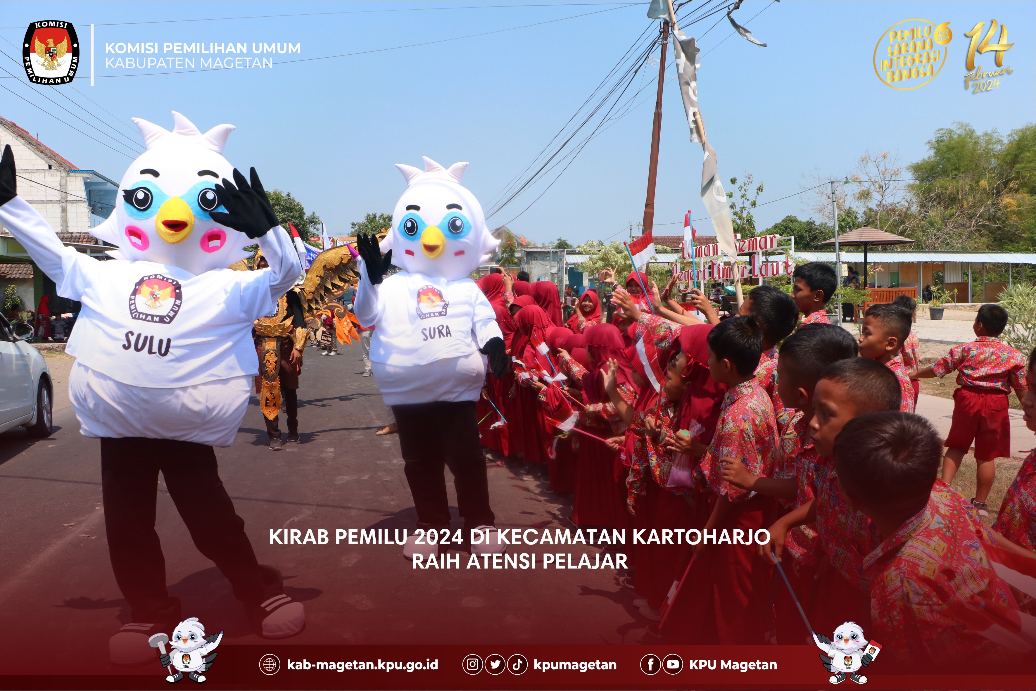 kab-magetan.kpu.go.id - Kecamatan Ngariboyo menjadi Kecamatan pertama dalam Kirab Pemilu 2024 di Kabupaten Magetan hari ketiga, Jumat (27/10). Seluruh PPK dan PPS serta Sekretariat di Kecamatam Ngariboyo berkumpul serentak di depan Pendopo Kecamatan Ngariboyo untuk melaksanakan apel pagi terlebih dahulu. Usai apel, rombongan Kirab diarak menuju Pasar Ngariboyo yang terletak tak jauh dari Kantor Kecamatan. Dalam perjalanan menuju Pasar Ngariboyo, nampak puluhan pelajar dari Taman Kanak-Kanak hingga Sekolah Dasar antusias melihat arak-arakan Kirab. Hal ini dikarenakan adanya maskot Pemilu 2024 yakni Sura dan Sulu. Selain itu PPK dan PPS Kecamatan Ngariboyo yang juga menghadirkan marching band juga cukup mendapatkan atensi masyarakat setempat. Usai sampai di Pasar Ngariboyo, PPK dan PPS langsung berpencar dan memberikan pamflet sosialisasi kepemiluan serta kalender kepada penjual dan pembeli serta pengendara yang tengah berhenti di lampu merah. Tak lupa, mereka juga mengajak untuk datang ke TPS pada Pemilu 2024 yang akan dilaksanakan pada 14 Februari 2024. (br)