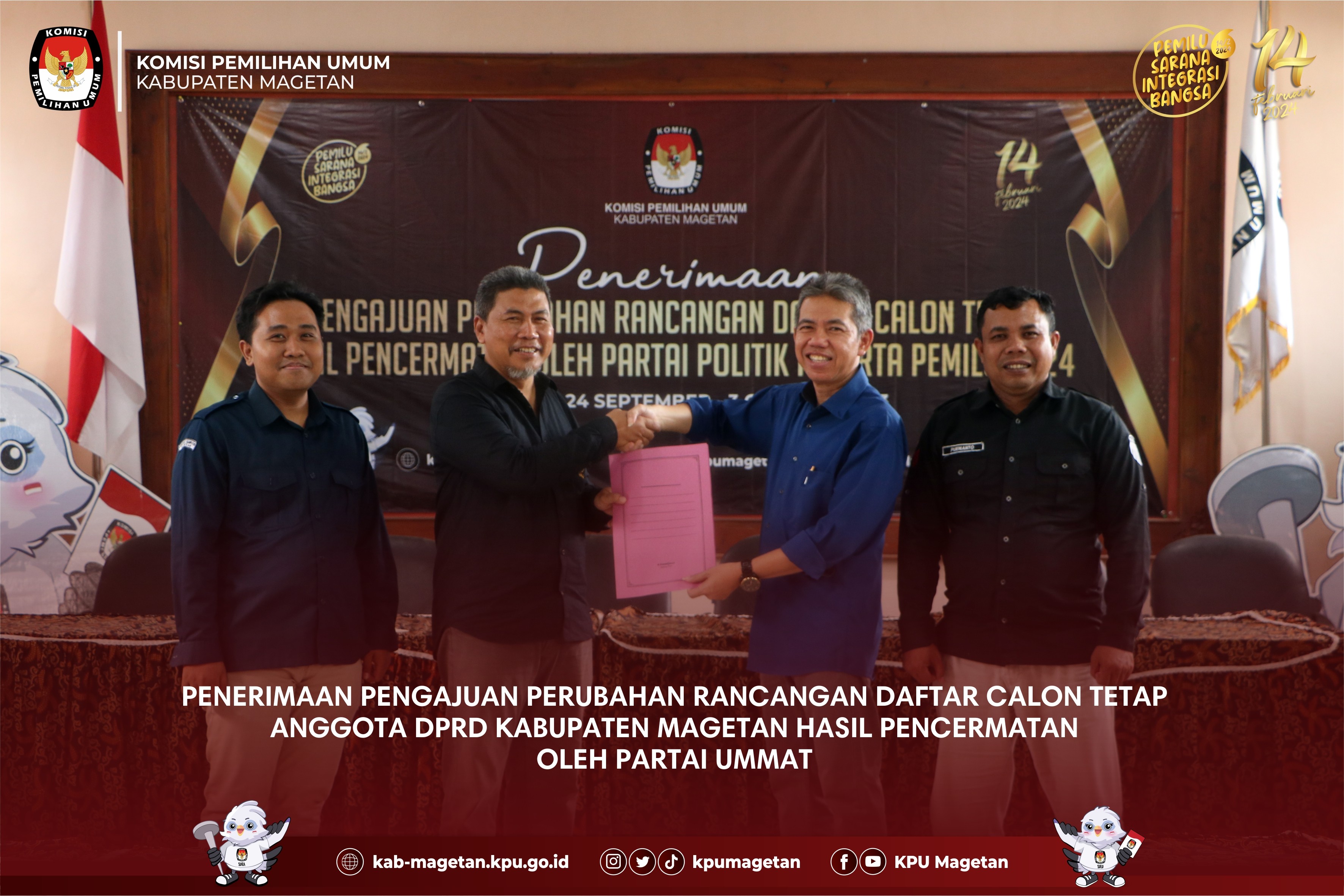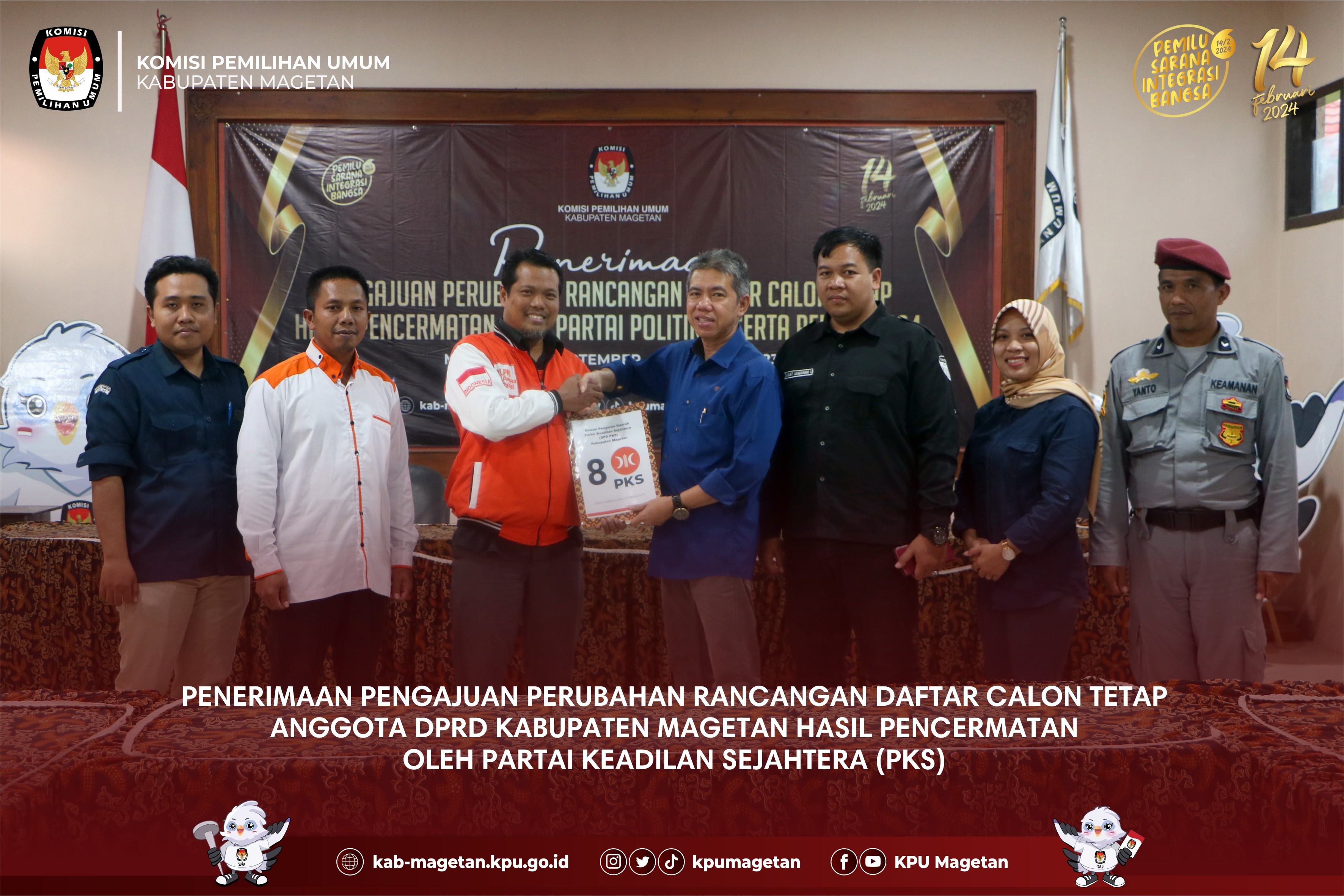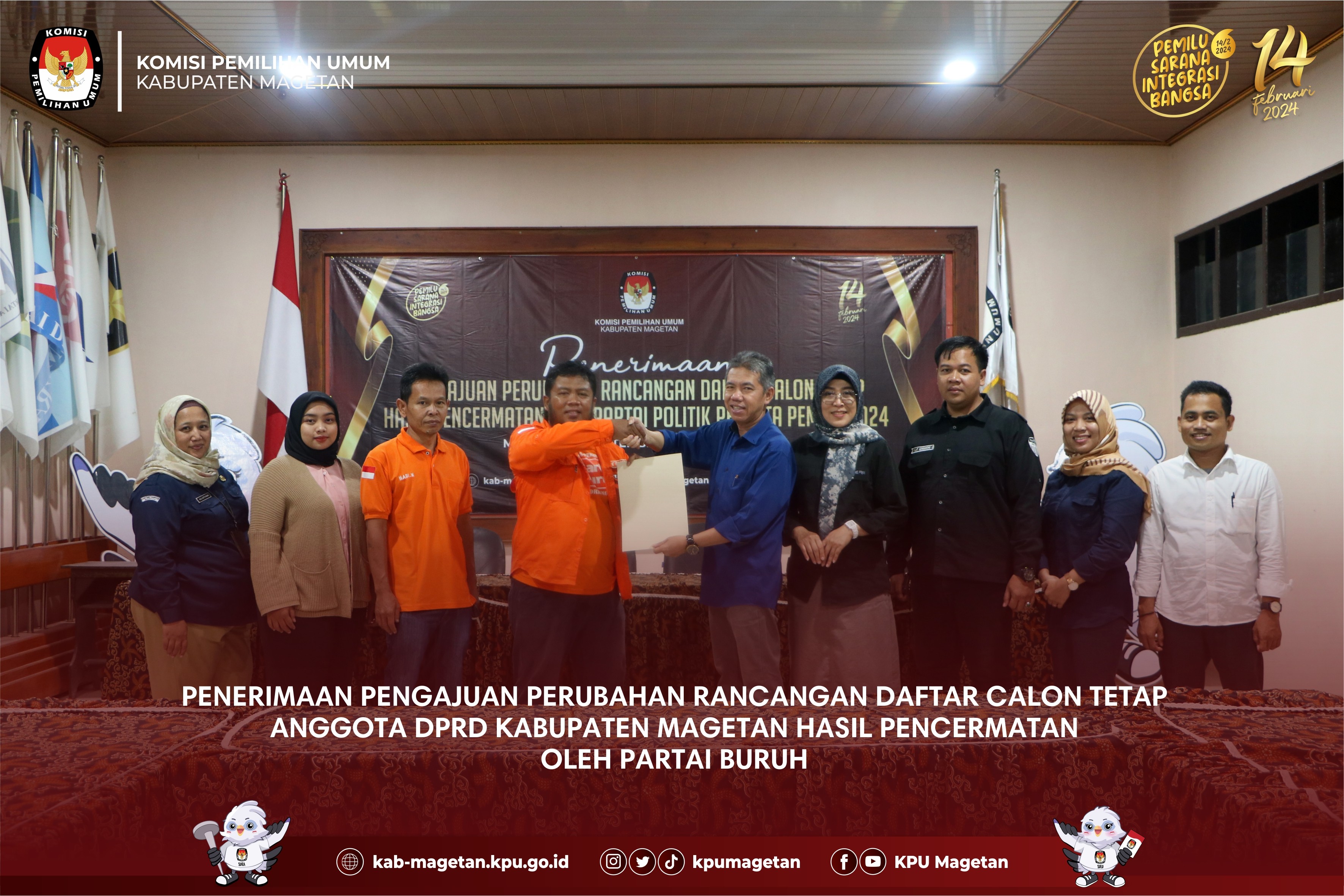 kab-magetan.kpu.go.id - KPU Kabupaten Magetan menerima pengajuan perubahan rancangan Daftar Calon Tetap Anggota DPRD Kabupaten Magetan hasil pencermatan oleh Partai Buruh, Selasa (3/10). Kedatangan Partai Buruh Magetan kali ini diwakili oleh Liaison Officer (LO) Hadi Warsito. "Adapun pada hari ini kedatangan kami adalah untuk mengajukan rancangan perubahan rancangan DCT hasil pencermatan kami kepada KPU Kabupaten Magetan." Ungkap Hadi . Selanjutnya, berkas dokumen pengajuan perubahan diperiksa kelengkapannya oleh komisioner, admin beserta operator SILON KPU Kabupaten Magetan. Ketua KPU Kabupaten Magetan, Fahrudin menuturkan bahwa KPU Kabupaten Magetan akan segera menindaklanjuti pasca pengajuan ini. "Setelah pengajuan dokumen perubahan telah selesai dilaksanakan, kami akan melaksanakan tahapan verifikasi administrasi." Jelasnya. Pada akhir prosesi pengajuan, diserahkan tanda terima kepada Partai Buruh Magetan oleh Ketua KPU Kabupaten Magetan dan didampingi oleh Anggota KPU Kabupaten Magetan.(sgt)
