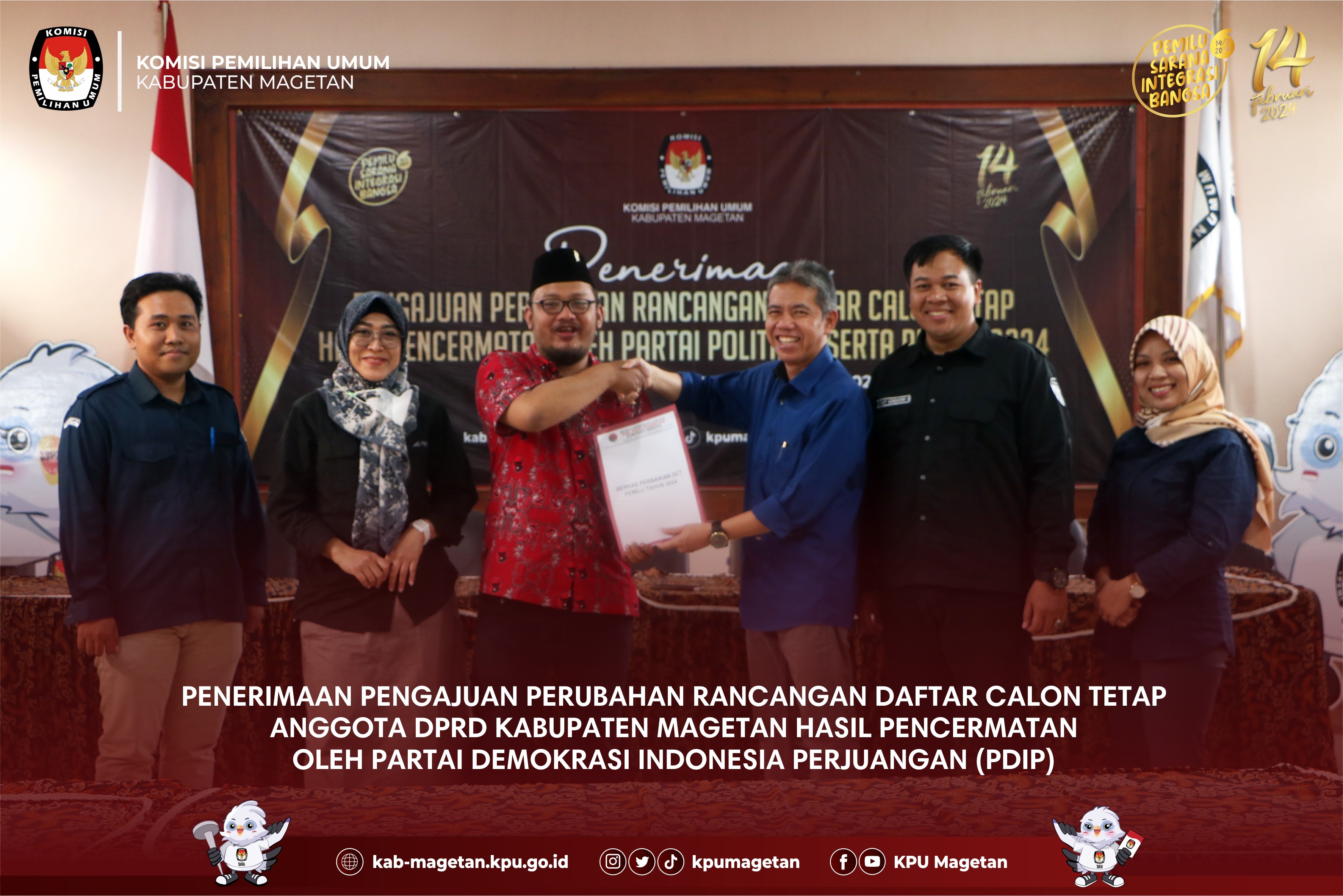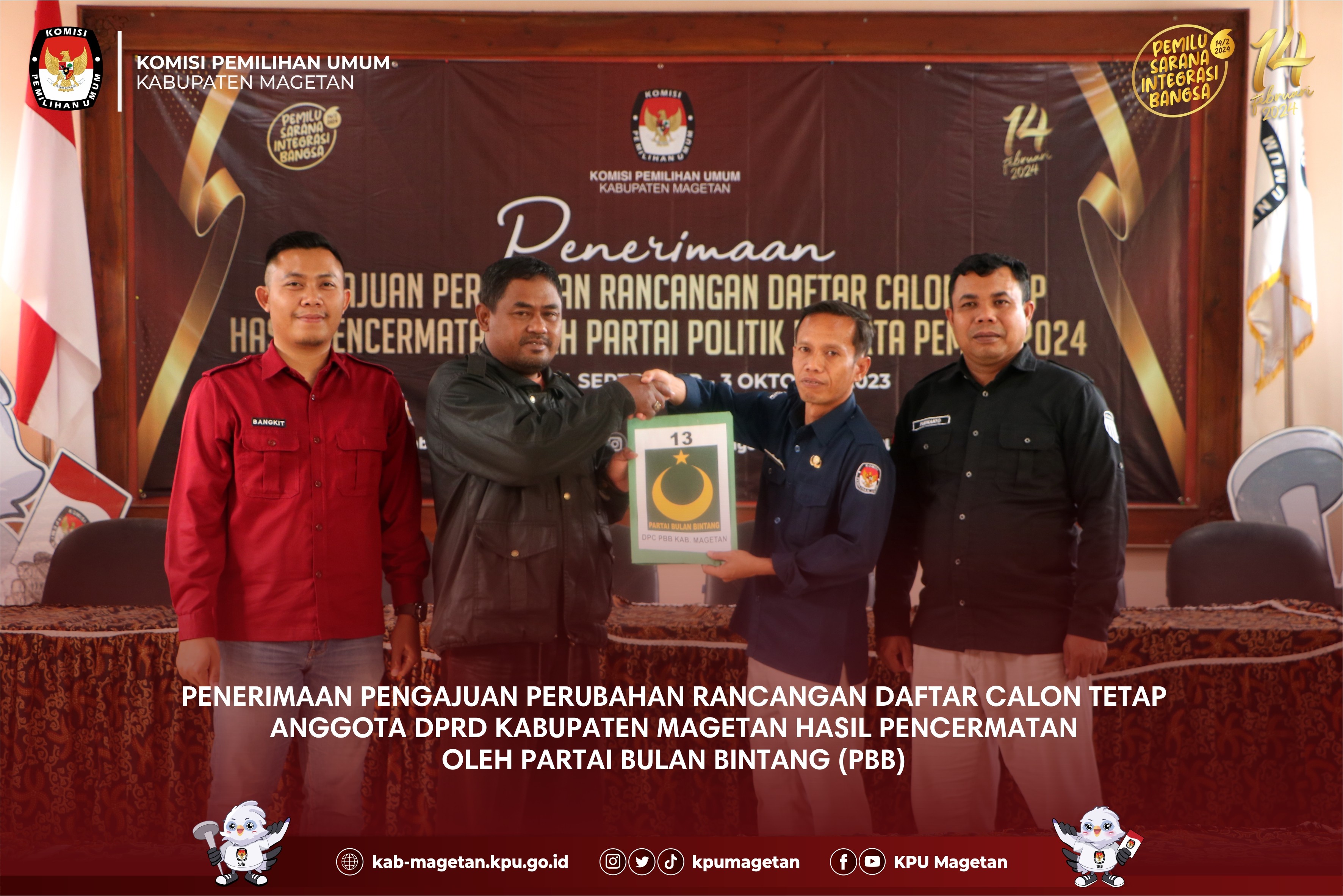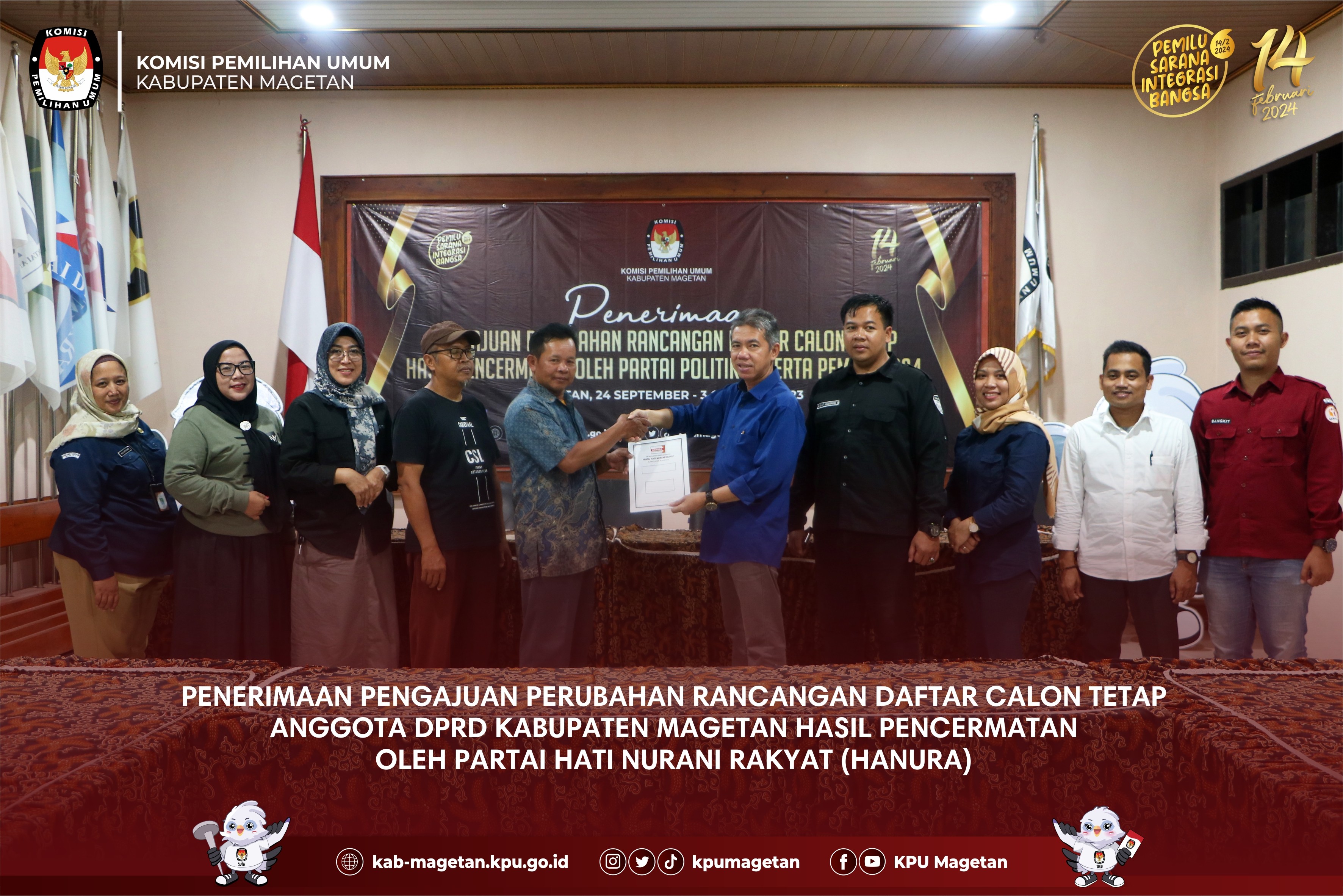 kab-magetan.kpu.go.id - KPU Kabupaten Magetan menerima pengajuan perubahan rancangan Daftar Calon Tetap Anggota DPRD Kabupaten Magetan hasil pencermatan oleh Partai Buruh, Selasa (3/10). Kedatangan Partai Buruh Magetan kali ini diwakili oleh Liaison Officer (LO) Hadi Warsito. "Adapun pada hari ini kedatangan kami adalah untuk mengajukan rancangan perubahan rancangan DCT hasil pencermatan kami kepada KPU Kabupaten Magetan." Ungkap Hadi . Selanjutnya, berkas dokumen pengajuan perubahan diperiksa kelengkapannya oleh komisioner, admin beserta operator SILON KPU Kabupaten Magetan. Ketua KPU Kabupaten Magetan, Fahrudin menuturkan bahwa KPU Kabupaten Magetan akan segera menindaklanjuti pasca pengajuan ini. "Setelah pengajuan dokumen perubahan telah selesai dilaksanakan, kami akan melaksanakan tahapan verifikasi administrasi." Jelasnya. Pada akhir prosesi pengajuan, diserahkan tanda terima kepada Partai Buruh Magetan oleh Ketua KPU Kabupaten Magetan dan didampingi oleh Anggota KPU Kabupaten Magetan.(sgt)