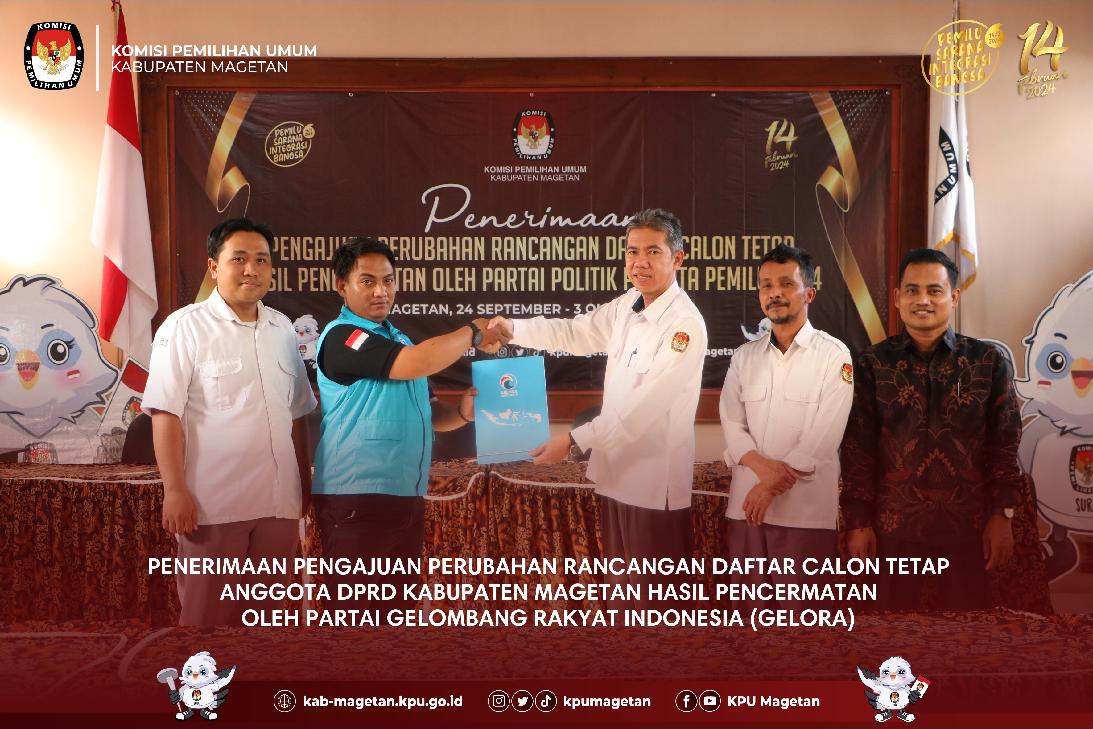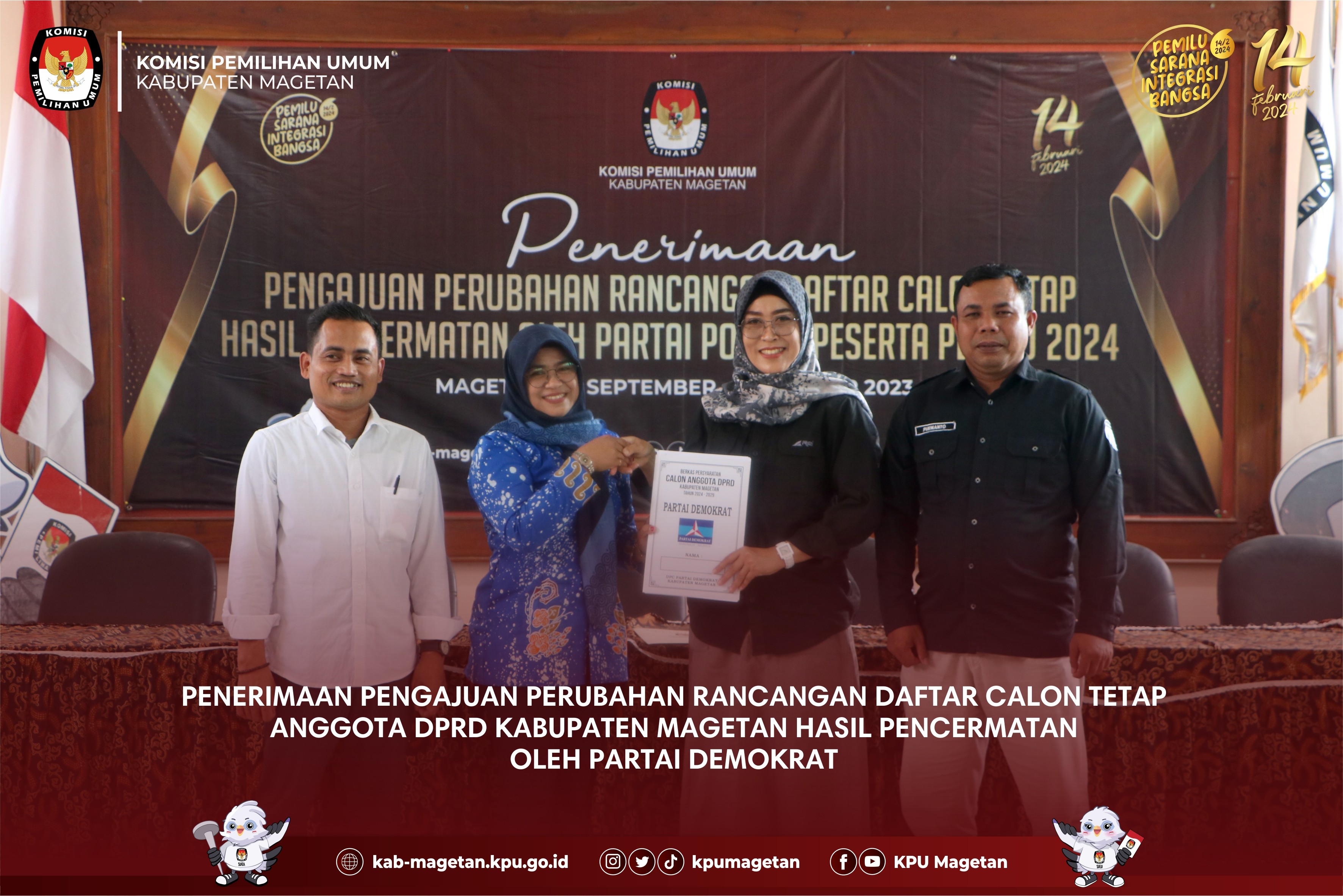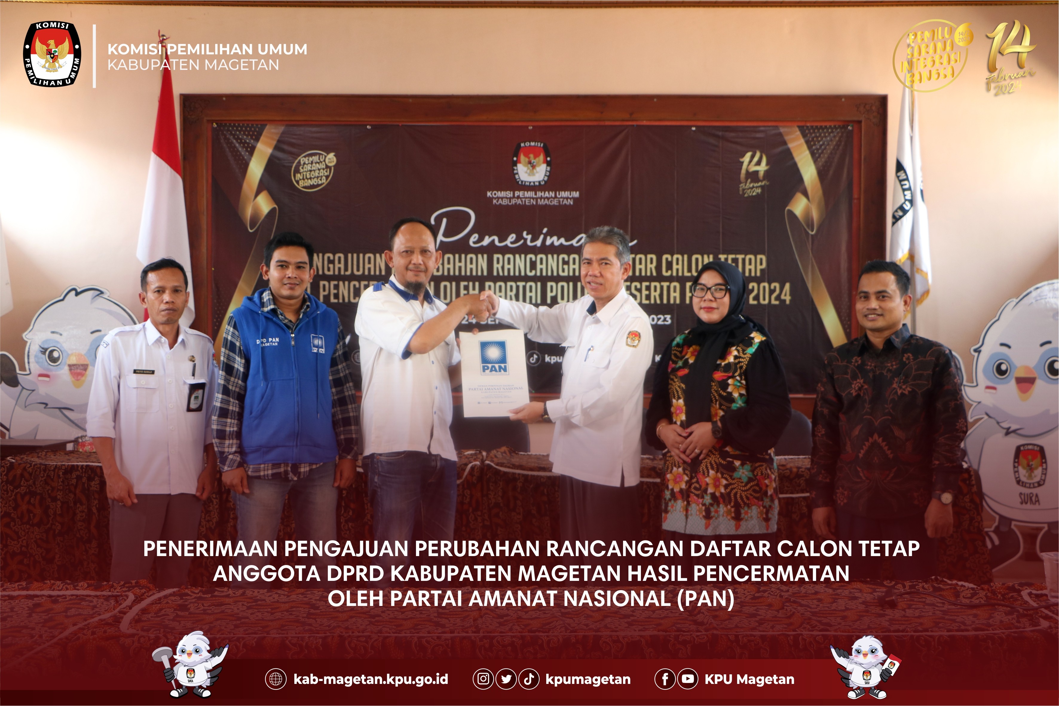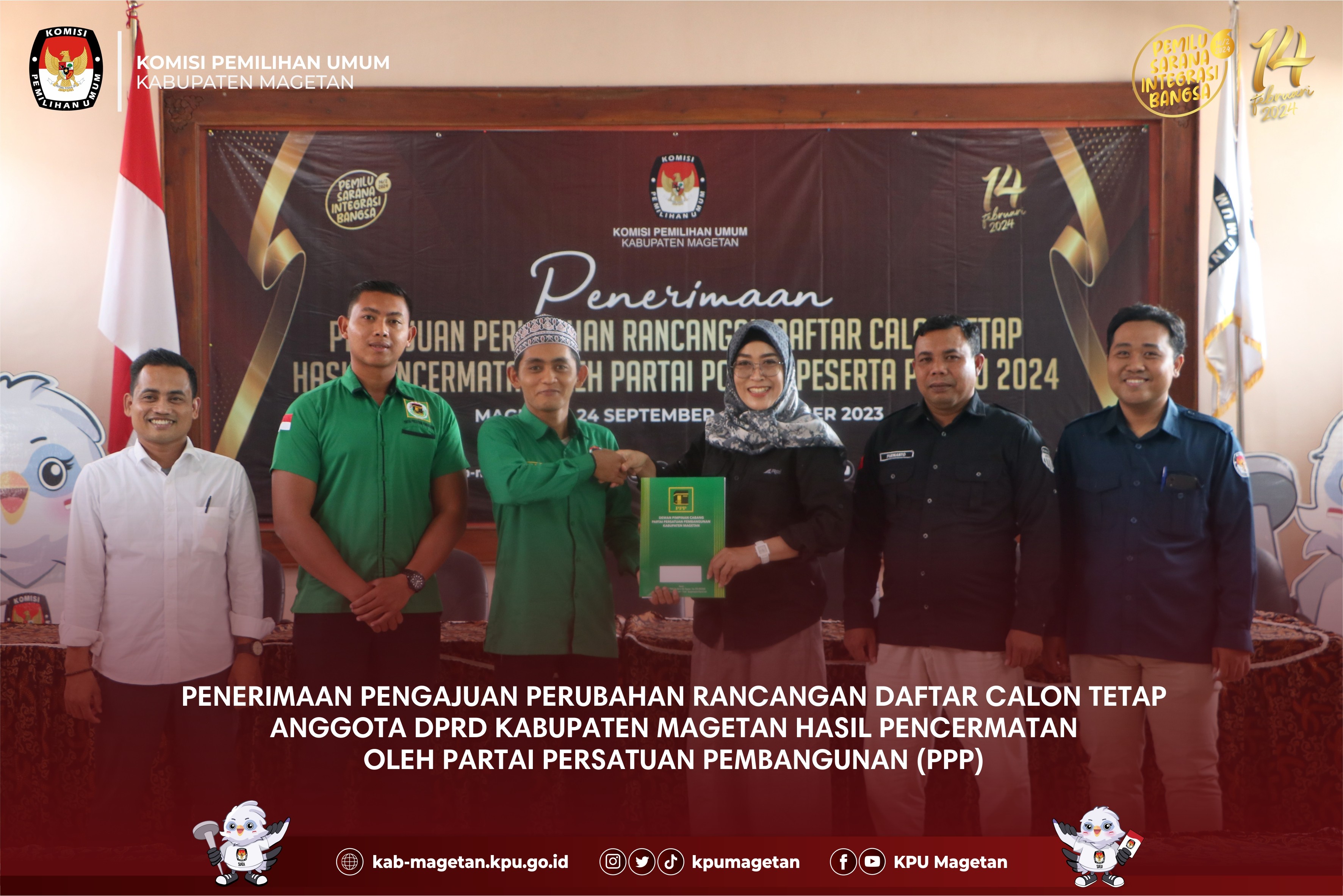 kab-magetan.kpu.go.id - KPU Kabupaten Magetan menerima pengajuan perubahan rancangan Daftar Calon Tetap Anggota DPRD Kabupaten Magetan hasil pencermatan oleh Partai Persatuan Pembangunan, Selasa (3/10). Kedatangan Partai Persatuan Pembangunan Magetan kali ini diwakili oleh Liaison Officer (LO) Memo Prasetyo. "Adapun pada hari ini kedatangan kami adalah untuk mengajukan rancangan perubahan rancangan DCT hasil pencermatan kami kepada KPU Kabupaten Magetan." Ungkap Memo . Selanjutnya, berkas dokumen pengajuan perubahan diperiksa kelengkapannya oleh komisioner, admin beserta operator SILON KPU Kabupaten Magetan. Ketua Divisi Teknis Penyelenggaraan KPU Kabupaten Magetan, Istikah menuturkan bahwa KPU Kabupaten Magetan akan segera menindaklanjuti pasca pengajuan ini. "Setelah pengajuan dokumen perubahan telah selesai dilaksanakan, kami akan melaksanakan tahapan verifikasi administrasi." Jelasnya. Pada akhir prosesi pengajuan, diserahkan tanda terima kepada Partai Persatuan Pembangunan Magetan oleh Ketua Divisi Teknis Penyelenggaraan KPU Kabupaten Magetan.(sgt)