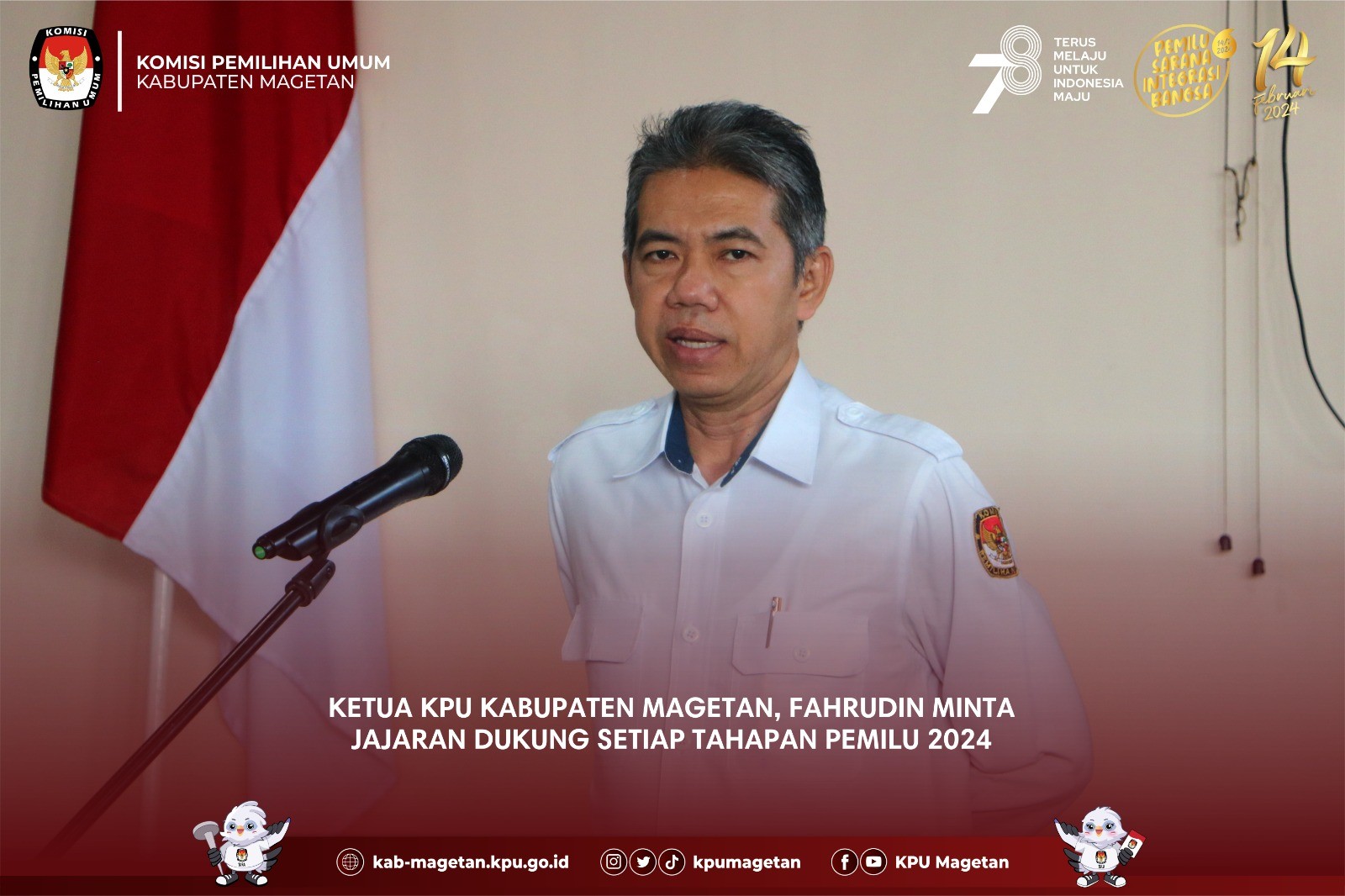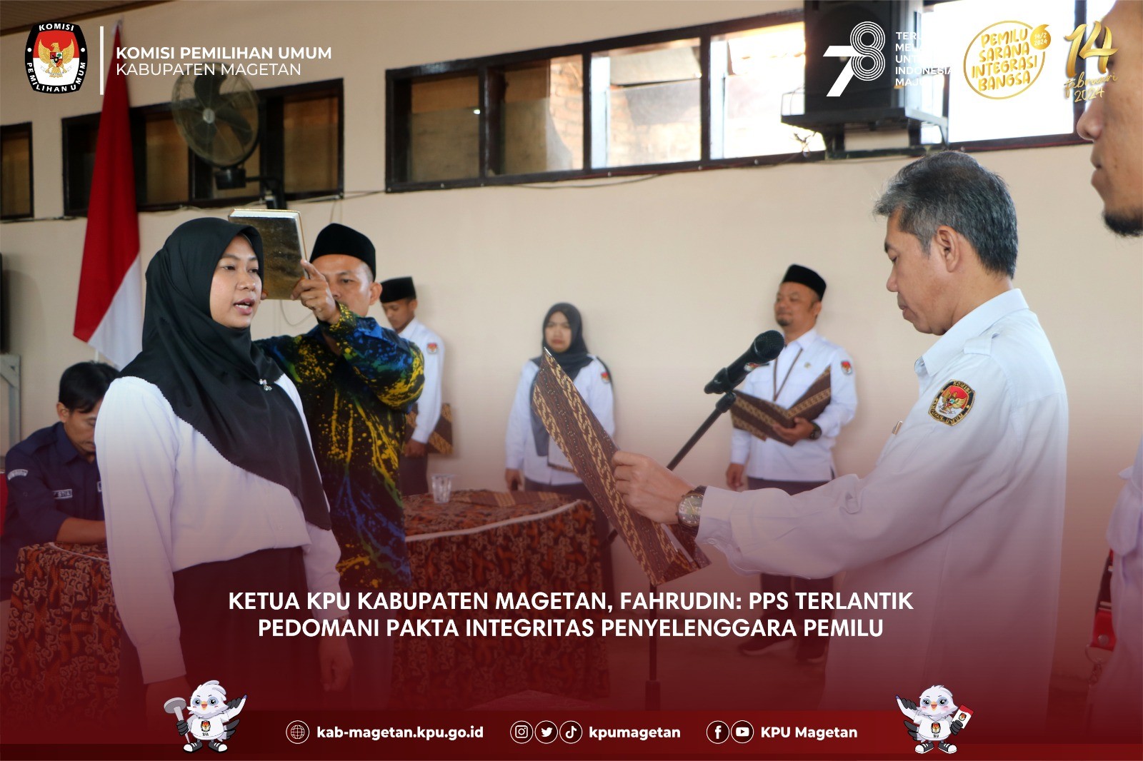 KPU Kabupaten Magetan melaksanakan pelantikan terhadap Pengganti Antar Waktu (PAW) Panitia Pemungutan Suara (PPS) Desa Klagen Gambiran, Senin (21/8) di Aula KPU Kabupaten Magetan. Ketua KPU Kabupaten Magetan, Fahrudin memebrikan penjelasan terkait dilaksanakannya pelantikan PAW PPS hari ini. “Adapun PPS Klagen Gambiran atas nama Daffa Pratamayudha Fahlevy Indrapraja mengundurkan diri dengan alasan tertentu yang diperbolehkan Undang-Undang dan harus kami lakukan PAW. Yang bersangkutan kami berhentikan dengan hormat dengan ucapan terima kasih atas dedikasinya selama menjalankan tugas sebagai PPS. Serta kami melantik Erni Susanti sebagai PAW PPS Klagen Gambiran Kecamatan Maospati.” Terangnya. Dalam sambutannya usai pelantikan, Fahrudin memberikan beberapa pesan kepada PAW PPS terlantik. “PPS terlantik saya harap agar segera menyesuaikan ritme tahapan Pemilu yang sudah berjalan ini, komunikasi dengan pihak terkait serta pahami pola kerja kerja kolektif kolegial antar PPS di Klagen Gambiran dan yang paling penting pedomani Pakta Integritas Anggota PPS Pemilu 2024 yang sudah diucapkan hari ini.” Pungkas Pria yang pernah menjadi Ketua PPK Bendo ini. Adapun acara Pelantikan PPS Klagen Gambiran ini dihadiri oleh Anggota KPU Kabupaten Magetan beserta Sekretariat, serta perwakilan dari PPS Klagen Gambiran dan PPK Maospati. (sgt)