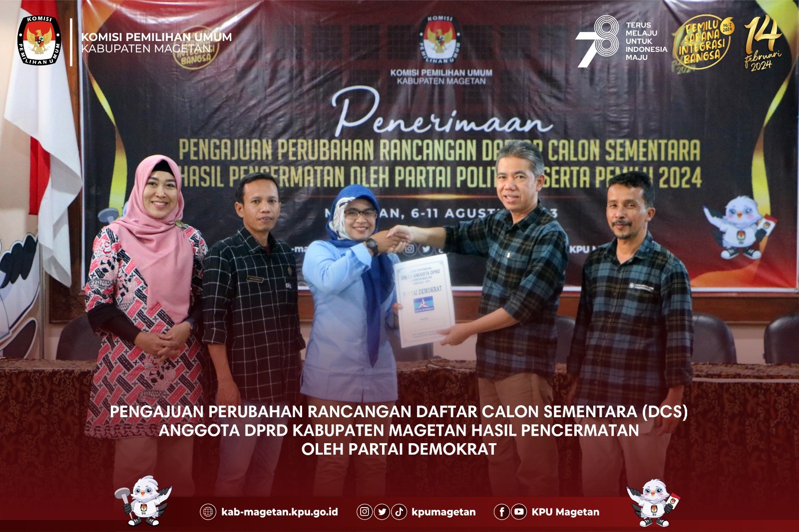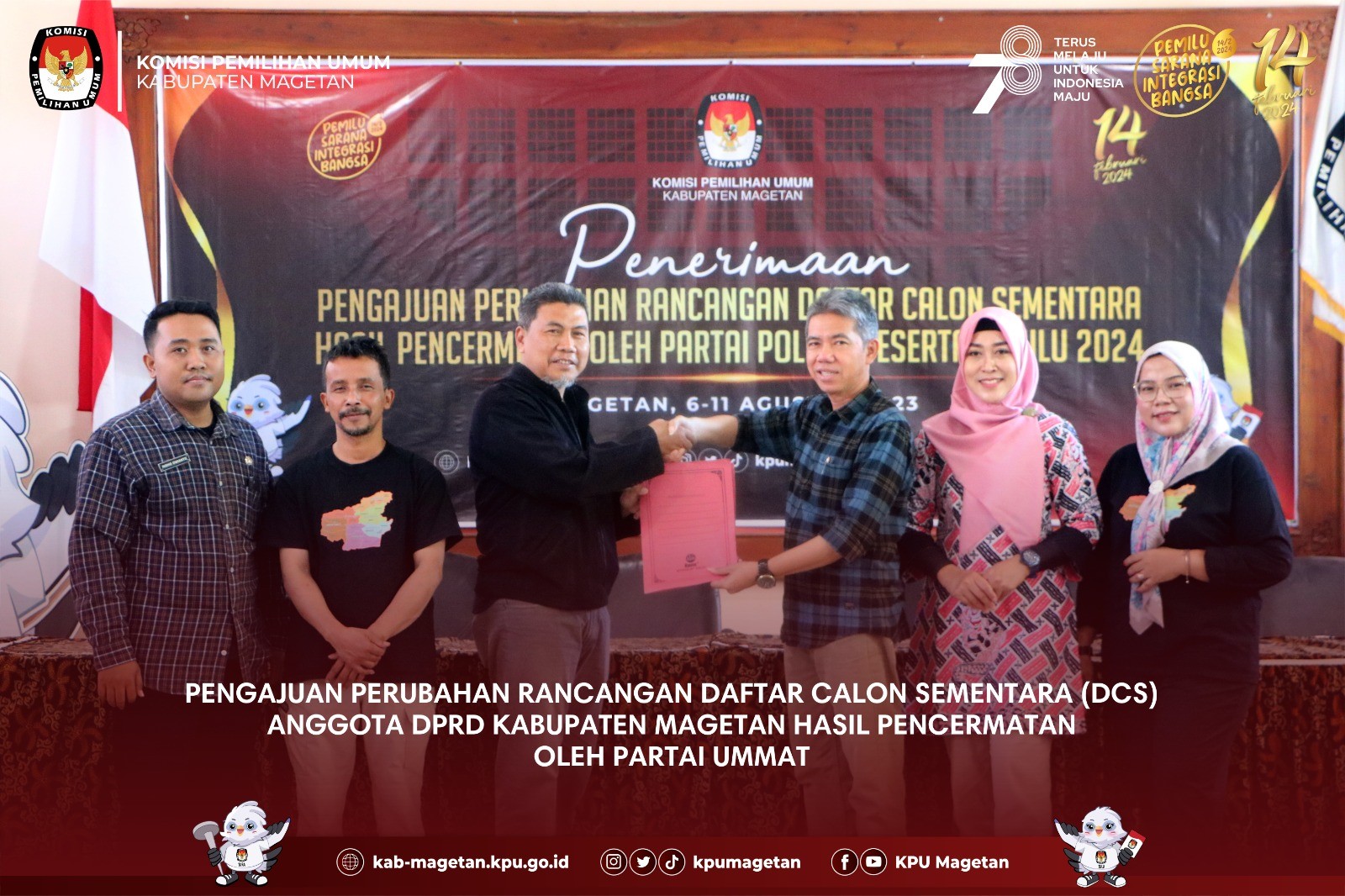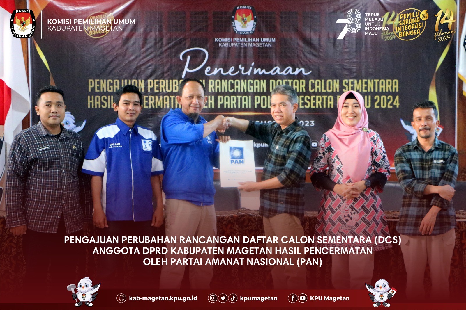 kab-magetan.kpu.go.id - KPU Kabupaten Magetan menerima pengajuan perubahan rancangan Daftar Calon Sementara (DCS) Anggota DPRD Kabupaten Magetan oleh Partai Amanat Nasional (PAN), Jumat (11/8). Kedatangan Partai Amanat Nasional Magetan kali ini diwakili oleh Liaison Officer (LO) Saifuddin beserta operator. "Adapun pada hari ini kedatangan kami adalah untuk mengajukan rancangan perubahan rancangan DCS hasil pencermatan kami kepada KPU Kabupaten Magetan." Ungkap Saifuddin. Selanjutnya, berkas dokumen pengajuan perubahan diperiksa kelengkapannya oleh komisioner, admin beserta operator SILON KPU Kabupaten Magetan. Ketua KPU Kabupaten Magetan, Fahrudin menuturkan bahwa KPU Kabupaten Magetan akan segera menindaklanjuti pasca pengajuan ini. "Setelah pengajuan dokumen perubahan telah selesai dilaksanakan, kami akan melaksanakan penyusunan dan penetapan Daftar Calon Sementara mulai 12 hingga 18 Agustus mendatang." Jelasnya. Pada akhir prosesi pengajuan, diserahkan tanda terima kepada PAN Magetan oleh Ketua KPU Kabupaten Magetan dan didampingi oleh Anggota KPU Kabupaten Magetan. (br)