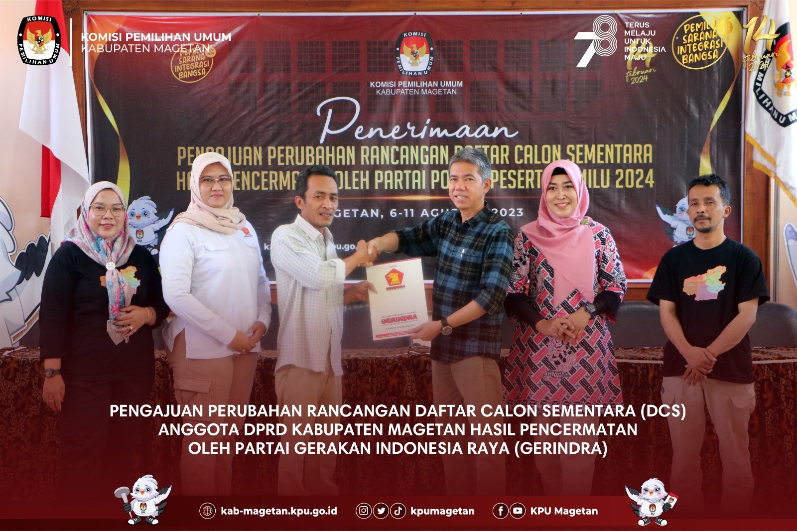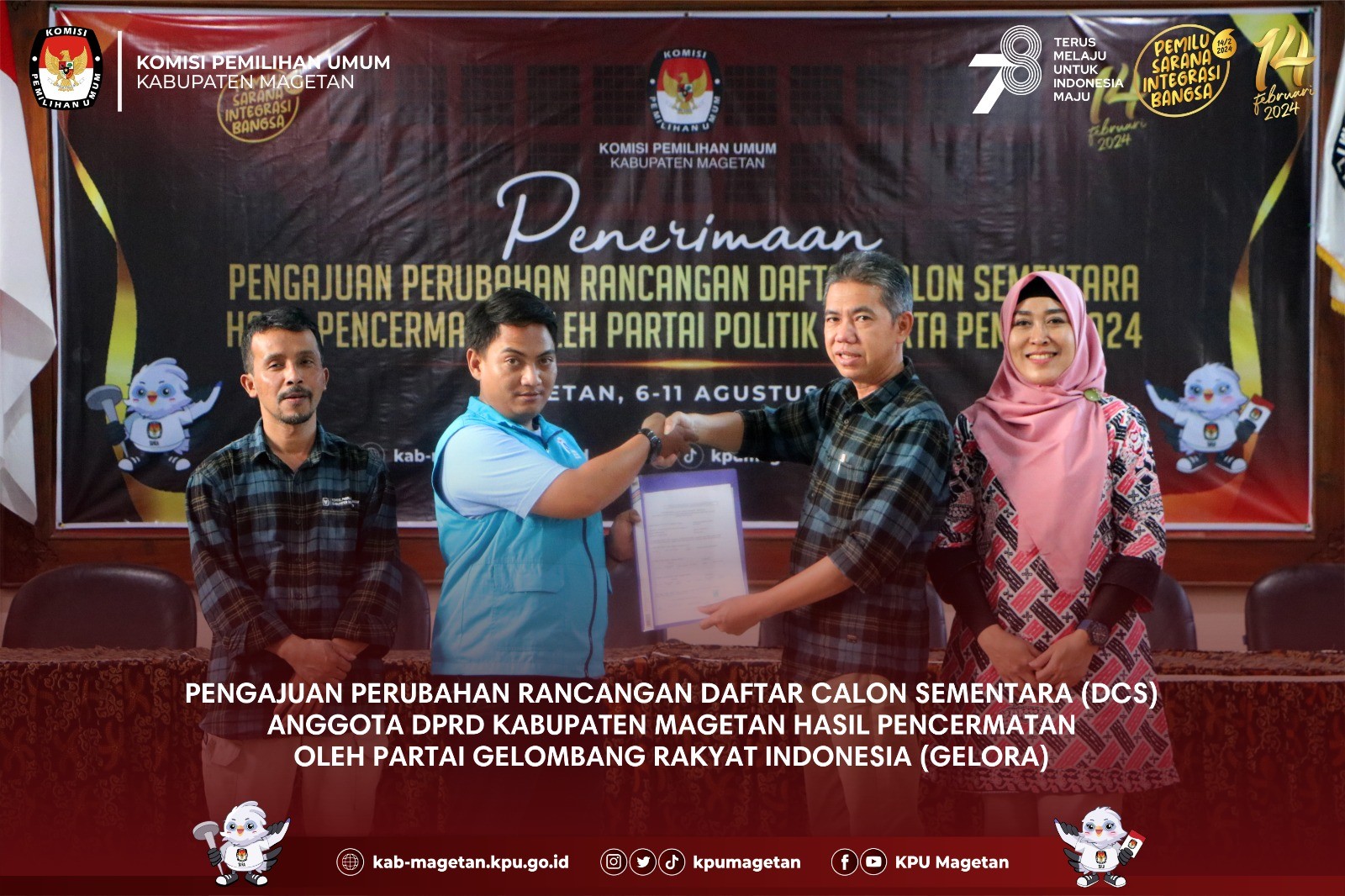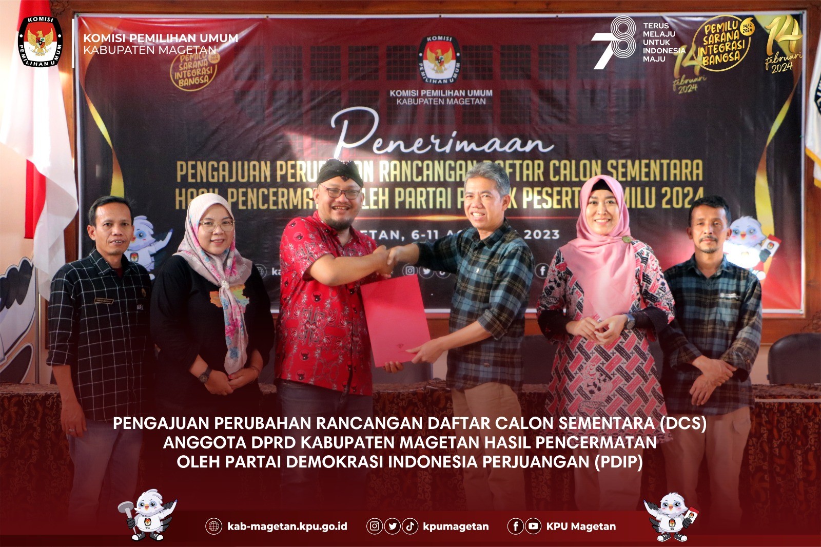 kab-magetan.kpu.go.id - KPU Kabupaten Magetan menerima pengajuan perubahan rancangan Daftar Calon Sementara (DCS) Anggota DPRD Kabupaten Magetan oleh Partai Amanat Nasional (PAN), Jumat (11/8). Kedatangan Partai Amanat Nasional Magetan kali ini diwakili oleh Liaison Officer (LO) Saifuddin beserta operator. "Adapun pada hari ini kedatangan kami adalah untuk mengajukan rancangan perubahan rancangan DCS hasil pencermatan kami kepada KPU Kabupaten Magetan." Ungkap Saifuddin. Selanjutnya, berkas dokumen pengajuan perubahan diperiksa kelengkapannya oleh komisioner, admin beserta operator SILON KPU Kabupaten Magetan. Ketua KPU Kabupaten Magetan, Fahrudin menuturkan bahwa KPU Kabupaten Magetan akan segera menindaklanjuti pasca pengajuan ini. "Setelah pengajuan dokumen perubahan telah selesai dilaksanakan, kami akan melaksanakan penyusunan dan penetapan Daftar Calon Sementara mulai 12 hingga 18 Agustus mendatang." Jelasnya. Pada akhir prosesi pengajuan, diserahkan tanda terima kepada PAN Magetan oleh Ketua KPU Kabupaten Magetan dan didampingi oleh Anggota KPU Kabupaten Magetan. (br)