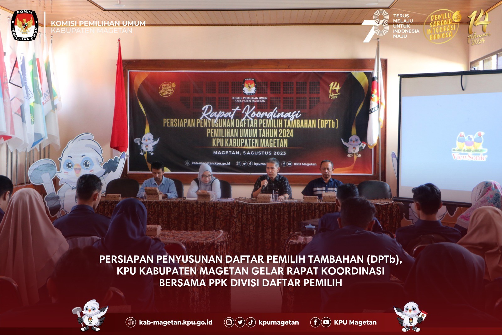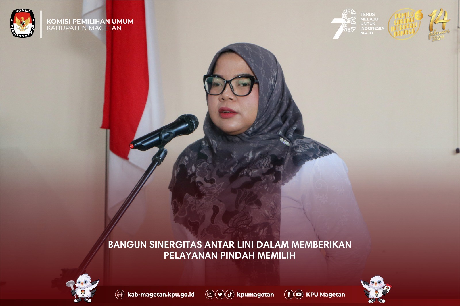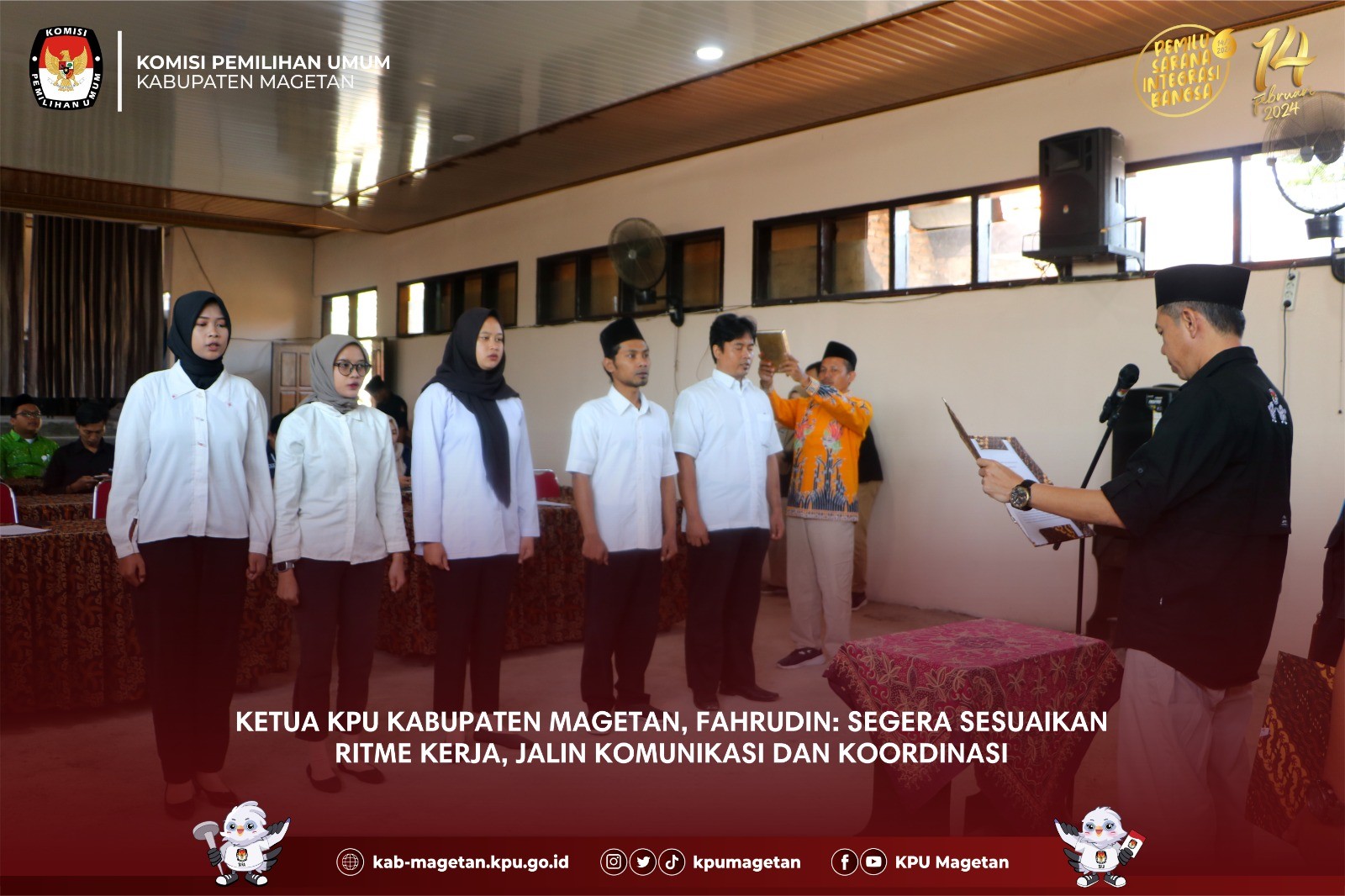 kab-magetan.kpu.go.id - KPU Kabupaten Magetan melaksanakan apel pagi rutin yang dilaksanakan di Aula KPU Kabupaten Magetan, Senin (7/8). Divisi Perencanaan Data dan Informasi KPU Kabupaten Magetan, Nanik Yasiroh hadir sebagai pembina apel kali ini. Dalam amanatnya, Nanik Yasiroh memberikan update terkait tahapan Pemilu 2024 yang tengah berjalan maupun sudah berjalan. "Kemarin kita sudah melaksanakan penyampaian hasil verifikasi administrasi perbaikan dokumen bacalon anggota DPRD Kabupaten Magetan dan kini kita juga mulai melayani masyarakat yang hendak pindah memilih." Ungkapnya. Untuk itu, Nanik Yasiroh meminta sinergitas antar Divisi dalam memberikan pelayanan terbaik dalam melayani pindah memilih. "Saya harap teman-teman sekretariat dapat memberikan pelayanan terbaik apabila terdapat masyarakat yang datang ke KPU Kabupaten Magetan dan hendak mengajukan pindah memilih. Saya juga meminta agar teman-teman dapat mensosialisasikan terkait pindah memilih ini." Tutupnya. Adapun apel pagi kali ini diikuti oleh seluruh jajaran sekretariat KPU Kabupaten Magetan dan dipimpin oleh Kasubbag Keuangan Umu dan Logistik KPU Kabupaten Magetan, Sundarso. (br)