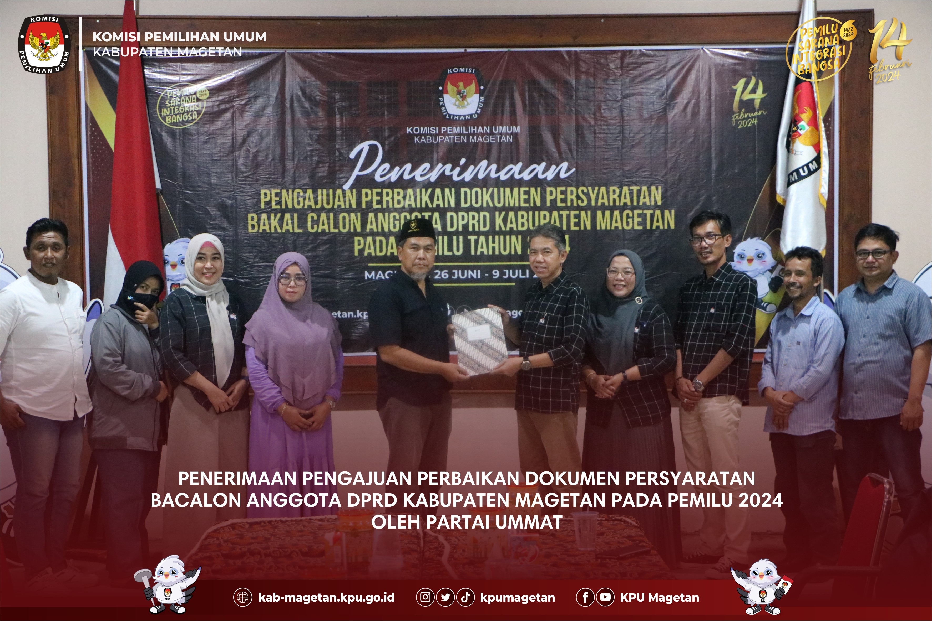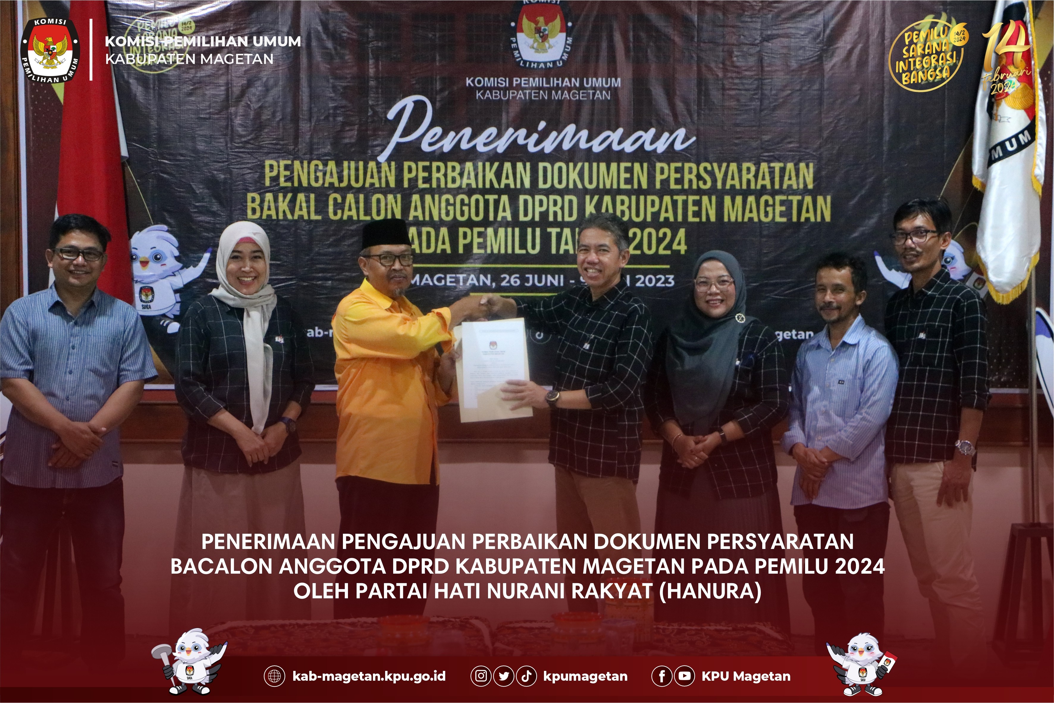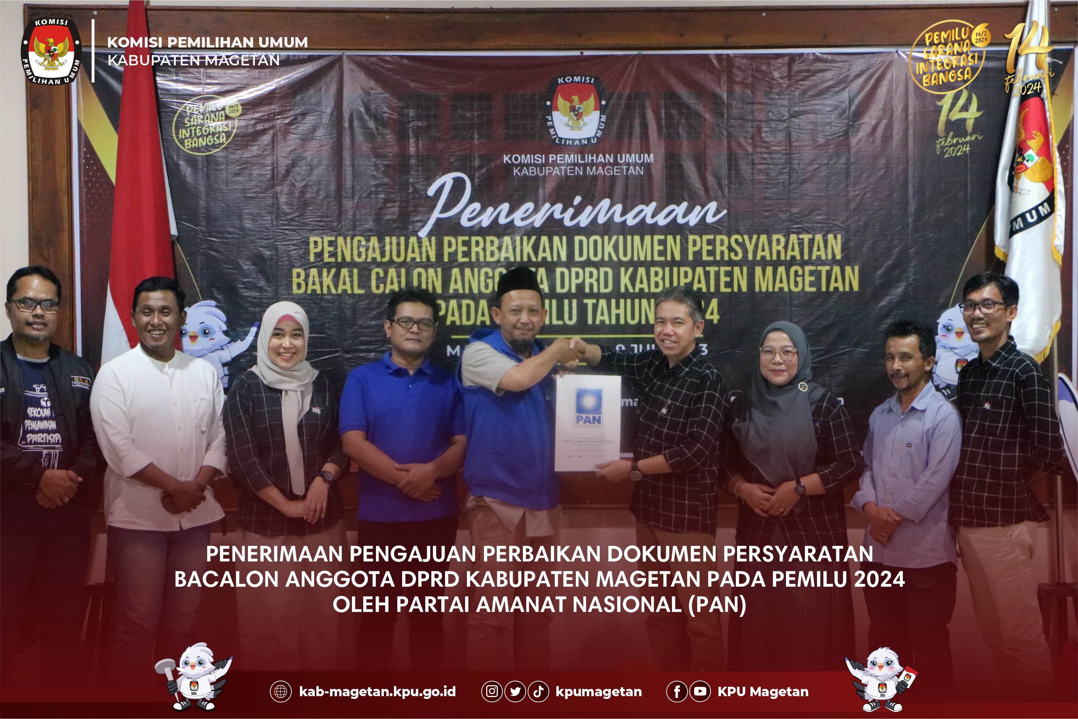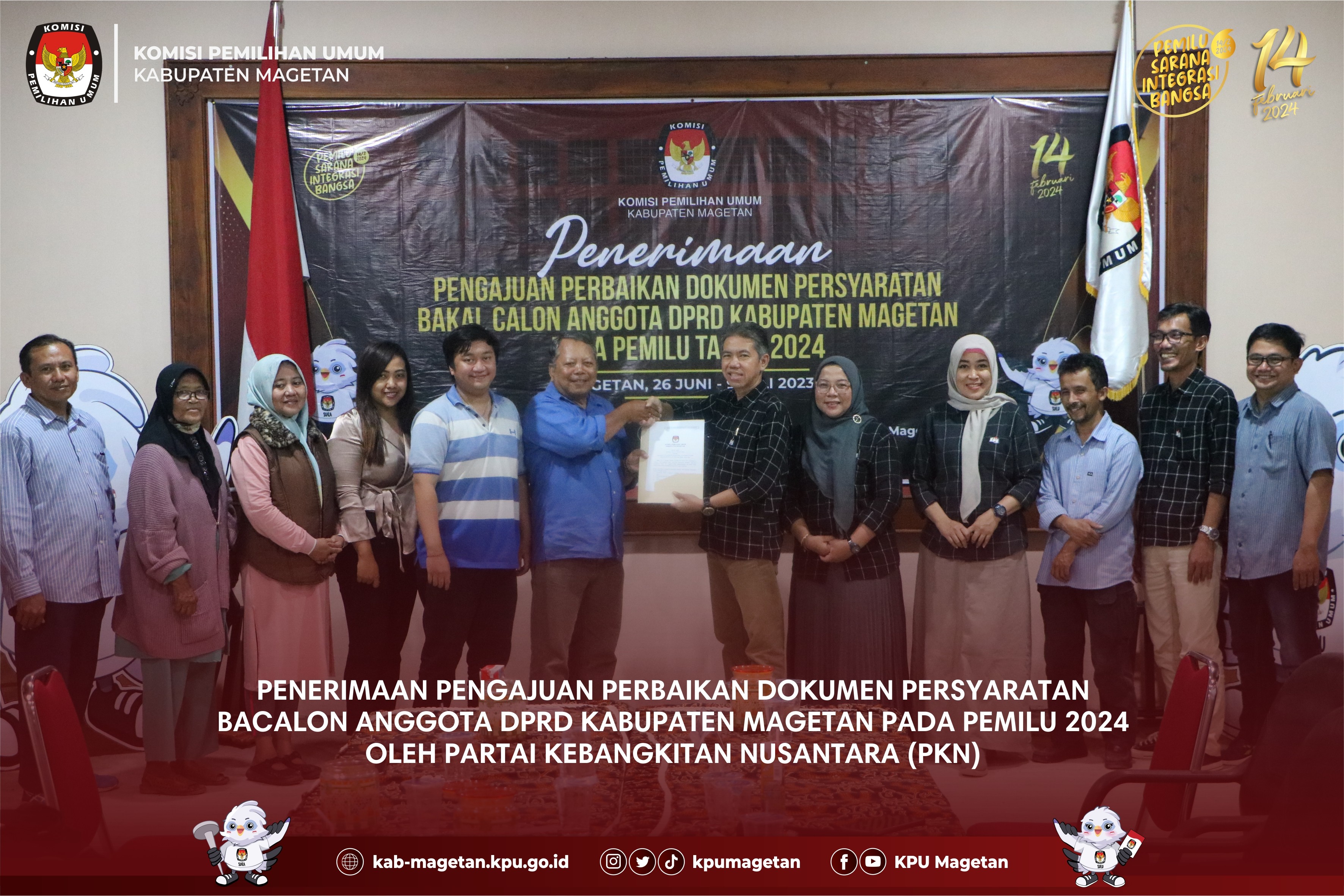 kab-magetan.kpu.go.id - KPU Kabupaten Magetan menerima pengajuan perbaikan dokumen persyaratan bacalon anggota DPRD Kabupaten Magetan pada Pemilu 2024 oleh Partai Kebangkitan Nusantara (PKN), Minggu (9/7). Kedatangan PKN Magetan kali ini dipimpin langsung oleh Ketua PKN Magetan, Wagiyo. "Adapun dokumen persyaratan yang masih memerlukan perbaikan sudah selesai kami perbaiki dan lengkapi dan selanjutnya pada hari ini dapat kami ajukan kepada KPU Kabupaten Magetan." Ungkap Wagiyo. Selanjutnya, berkas dokumen perbaikan diperiksa kelengkapannya oleh admin beserta operator SILON KPU Kabupaten Magetan. Ketua KPU Kabupaten Magetan, Fahrudin menuturkan bahwa KPU Kabupaten Magetan akan segera menindaklanjuti pasca penyerahan ini. "Setelah penyerahan dokumen perbaikan telah selesai dilaksanakan, kami akan melakukan verifikasi administrasi dokumen perbaikan mulai 10 Juli - 6 Agustus mendatang" Jelasnya. Pada akhir prosesi penyerahan, diserahkan berita acara kepada PKN Magetan oleh Ketua KPU Kabupaten Magetan dan didampingi oleh Anggota KPU Kabupaten Magetan beserta Bawaslu Magetan. (br)