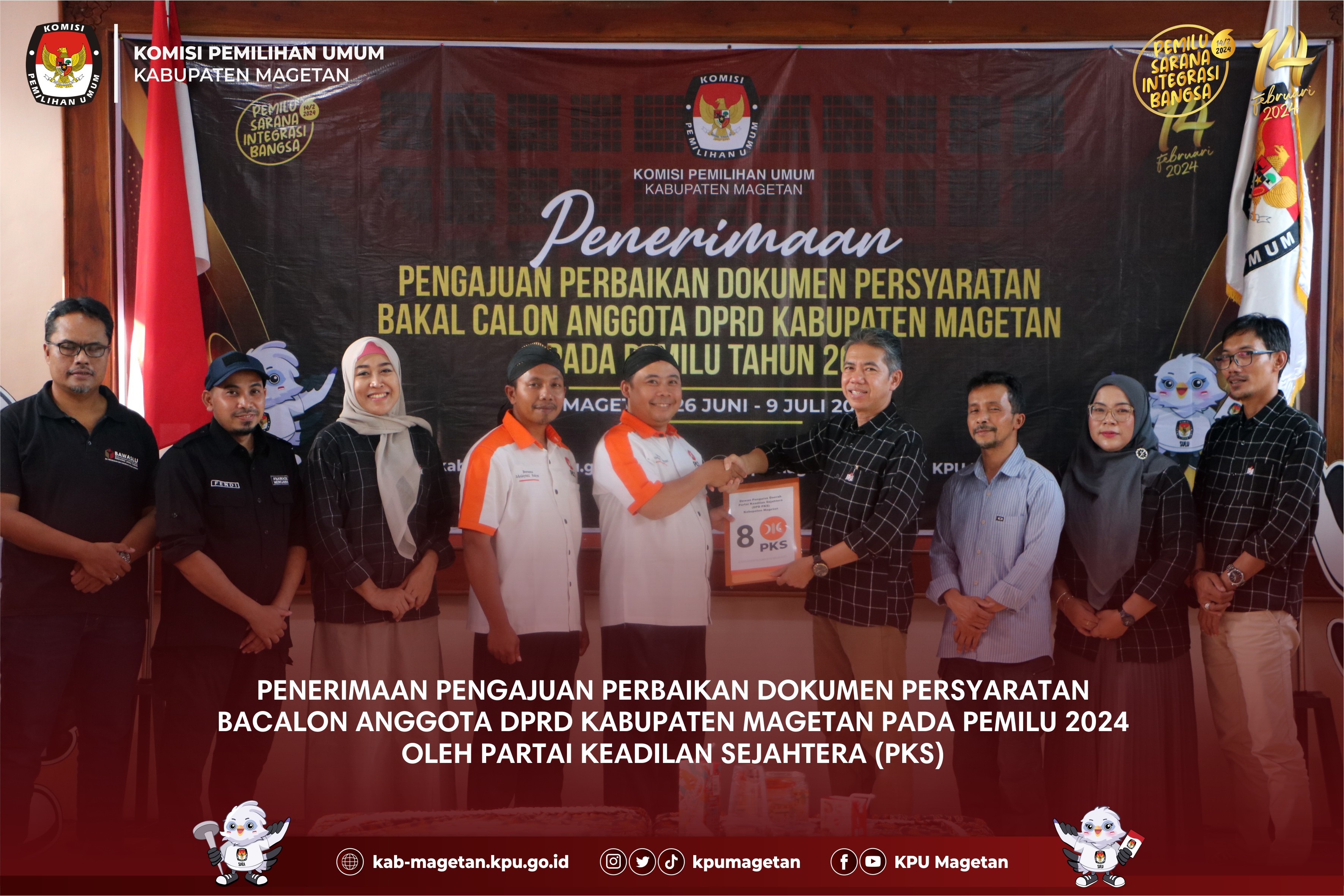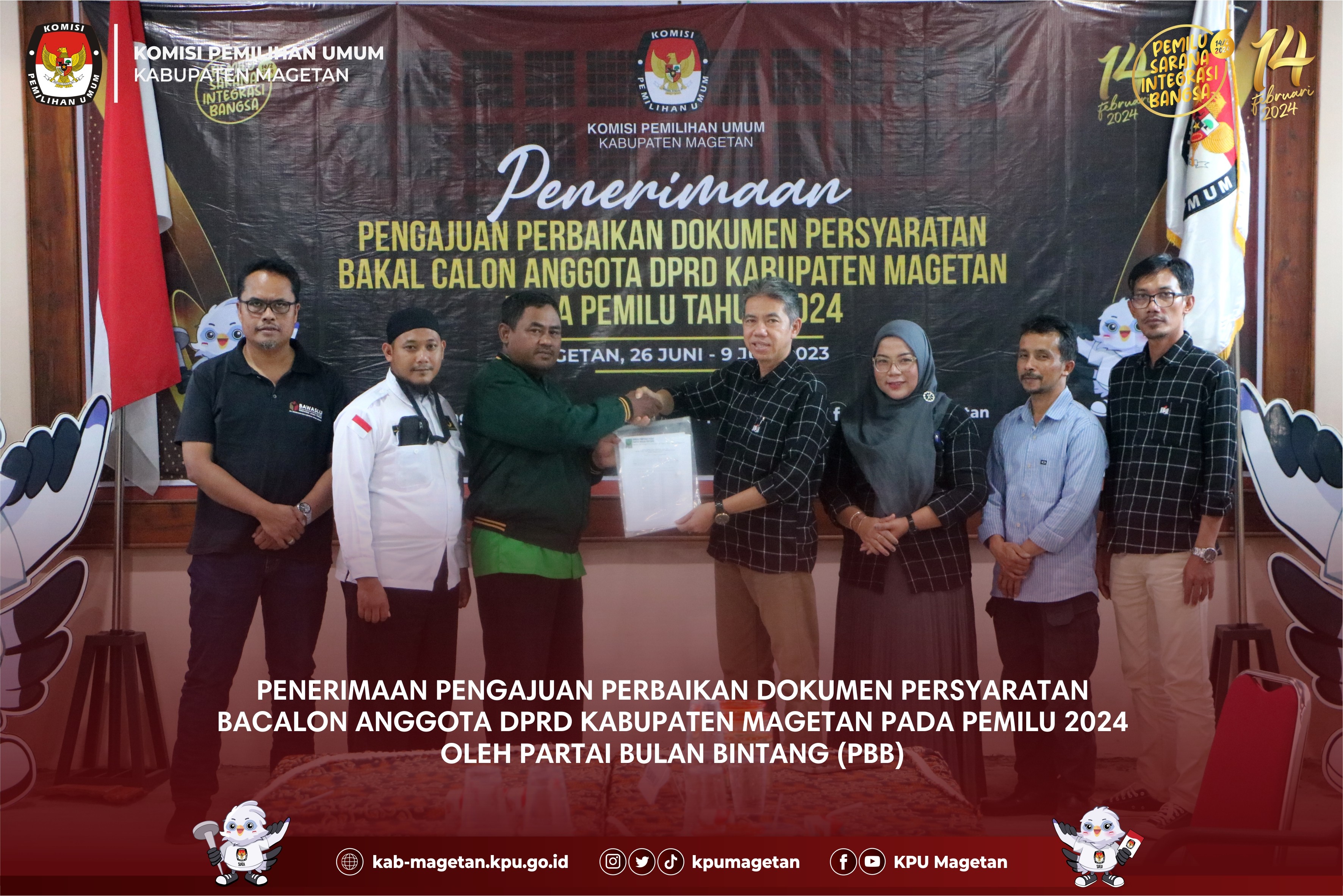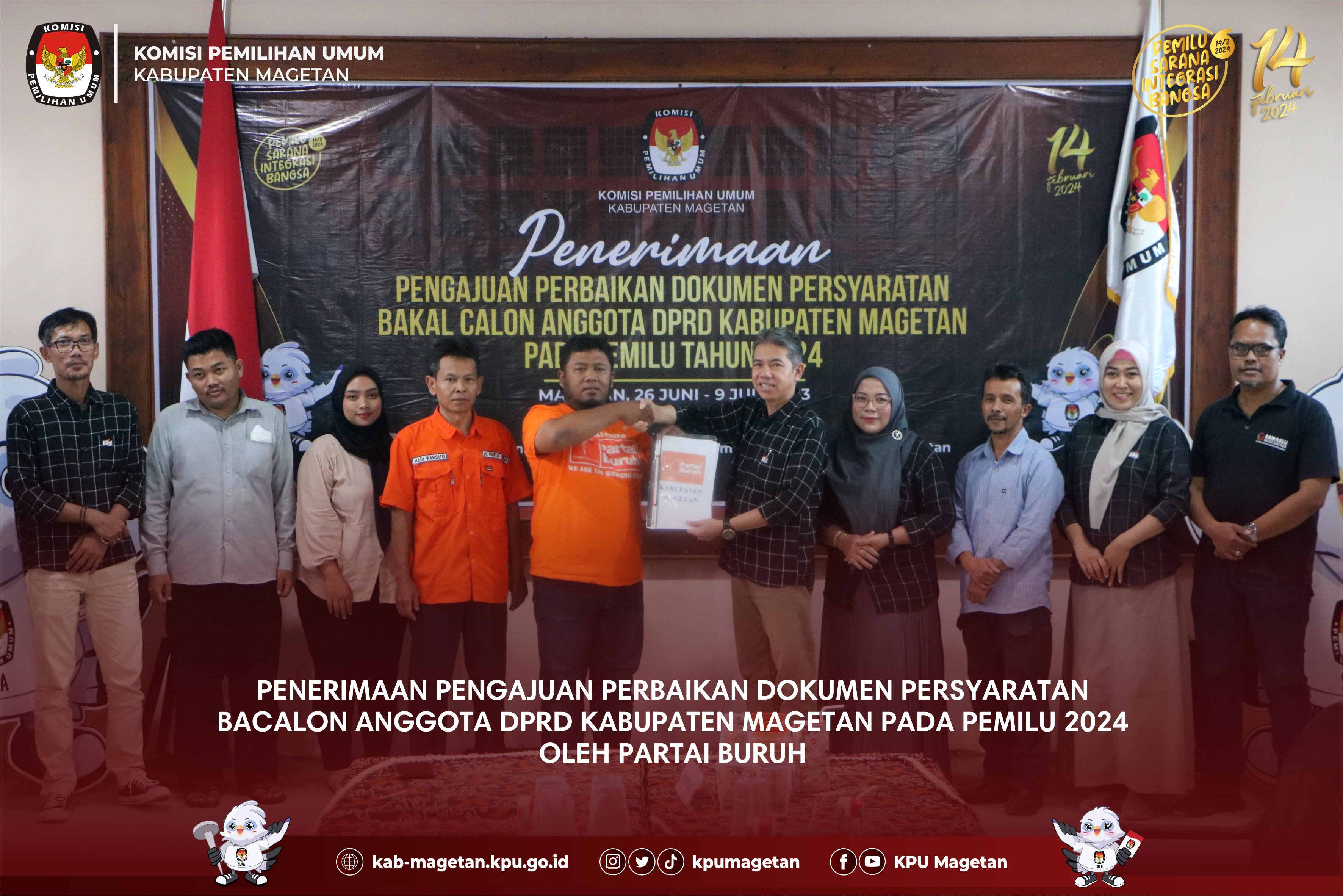 kab-magetan.kpu.go.id - KPU Kabupaten Magetan menerima pengajuan perbaikan dokumen persyaratan bacalon anggota DPRD Kabupaten Magetan pada Pemilu 2024 oleh Partai Buruh, Minggu (9/7). Kedatangan Partai Buruh Magetan kali ini dipimpin langsung oleh Exco Partai Buruh Magetan, Sulistyono. "Adapun dokumen persyaratan yang masih memerlukan perbaikan sudah selesai kami perbaiki dan lengkapi dan selanjutnya pada hari ini dapat kami ajukan kepada KPU Kabupaten Magetan." Ungkap Sulistyono. Selanjutnya, berkas dokumen perbaikan diperiksa kelengkapannya oleh admin beserta operator SILON KPU Kabupaten Magetan. Ketua KPU Kabupaten Magetan, Fahrudin menuturkan bahwa KPU Kabupaten Magetan akan segera menindaklanjuti pasca penyerahan ini. "Setelah penyerahan dokumen perbaikan telah selesai dilaksanakan, kami akan melakukan verifikasi administrasi dokumen perbaikan mulai 10 Juli - 6 Agustus mendatang" Jelasnya. Pada akhir prosesi penyerahan, diserahkan berita acara kepada Partai Buruh Magetan oleh Ketua KPU Kabupaten Magetan dan didampingi oleh Anggota KPU Kabupaten Magetan beserta Bawaslu Magetan. (br)