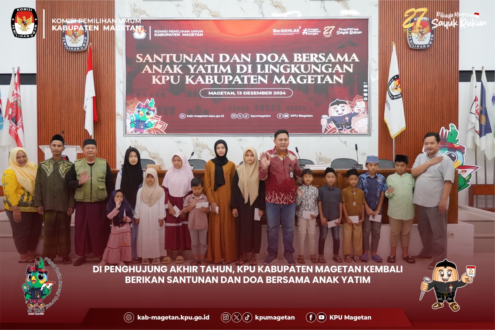 Magetan, kab-magetan.kpu.go.id - KPU Kabupaten Magetan kembali menggelar santunan dan doa bersama anak yatim di penghujung tahun 2024. Kegiatan yang dilaksanakan di Aula KPU Magetan pada Jumat (13/12) ini bertujuan untuk mempererat silaturahmi, meningkatkan kepedulian, serta solidaritas antarsesama. Ketua KPU Magetan, Noviano Suyide, menyampaikan harapannya agar kegiatan ini memberikan keberkahan dan kelancaran dalam pelaksanaan seluruh tahapan Pilkada, mulai dari awal hingga akhir. "Santunan dan doa bersama anak yatim ini merupakan wujud kepedulian kami untuk mempererat silaturahmi dan membangun solidaritas. Kami sangat meyakini bahwa doa anak-anak yatim memiliki kekuatan yang besar. Menyantuni dan menjaga anak yatim adalah perbuatan yang sangat dicintai Allah SWT. Semoga seluruh tahapan Pilkada dapat berjalan lancar," ujar Noviano. Pengasuh anak yatim dari Desa Ringinagung, Triyana, turut memberikan apresiasinya kepada KPU Magetan yang senantiasa menunjukkan kepedulian kepada anak-anak yatim di sekitarnya. "Kami mengapresiasi dan mengucapkan terima kasih kepada KPU Magetan yang sering melibatkan anak yatim Desa Ringinagung dalam kegiatan santunan. Kedekatan ini semoga membawa berkah dan kelancaran bagi seluruh kegiatan KPU," terang Triyana, yang juga Kepala Desa Ringinagung. (sgt)