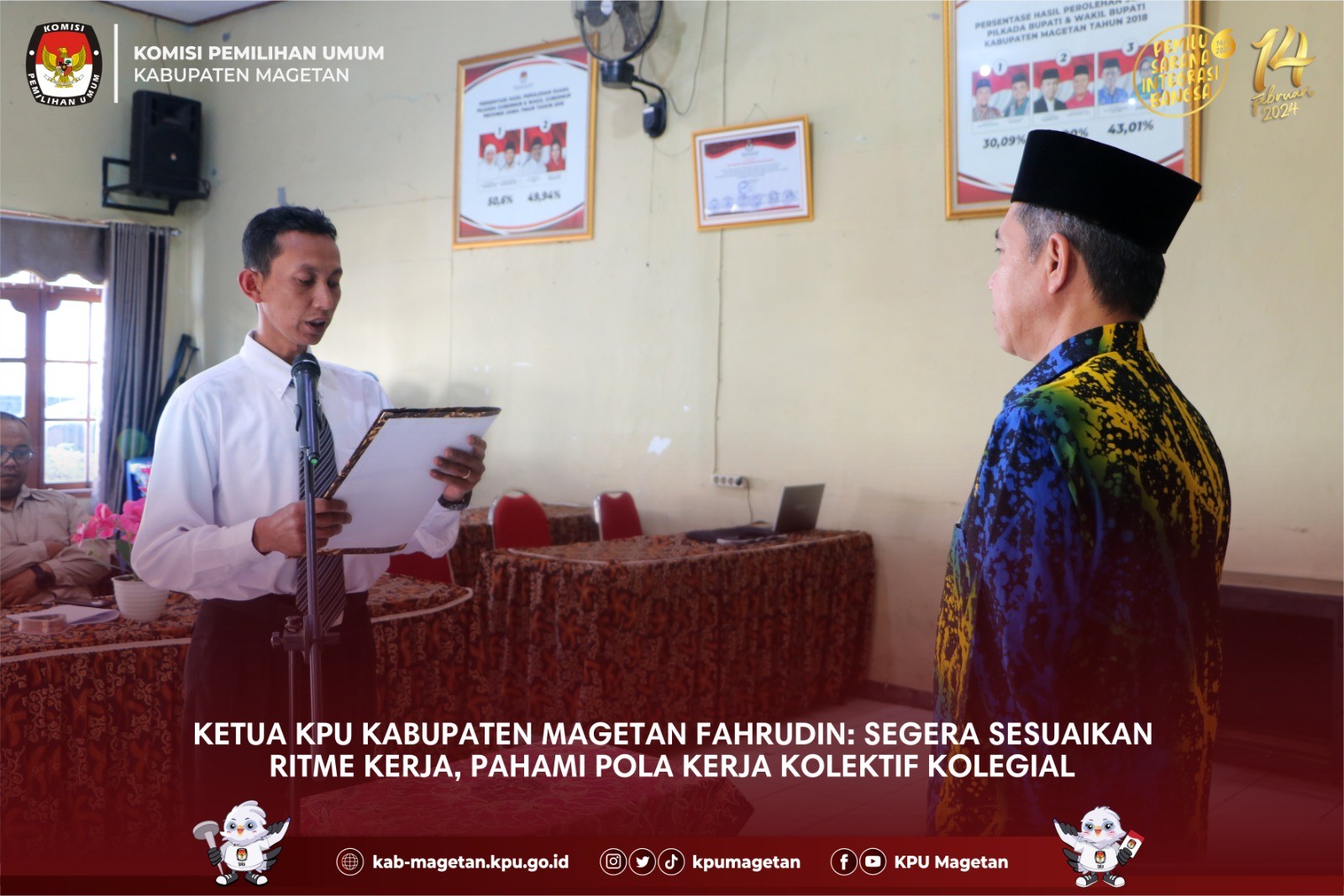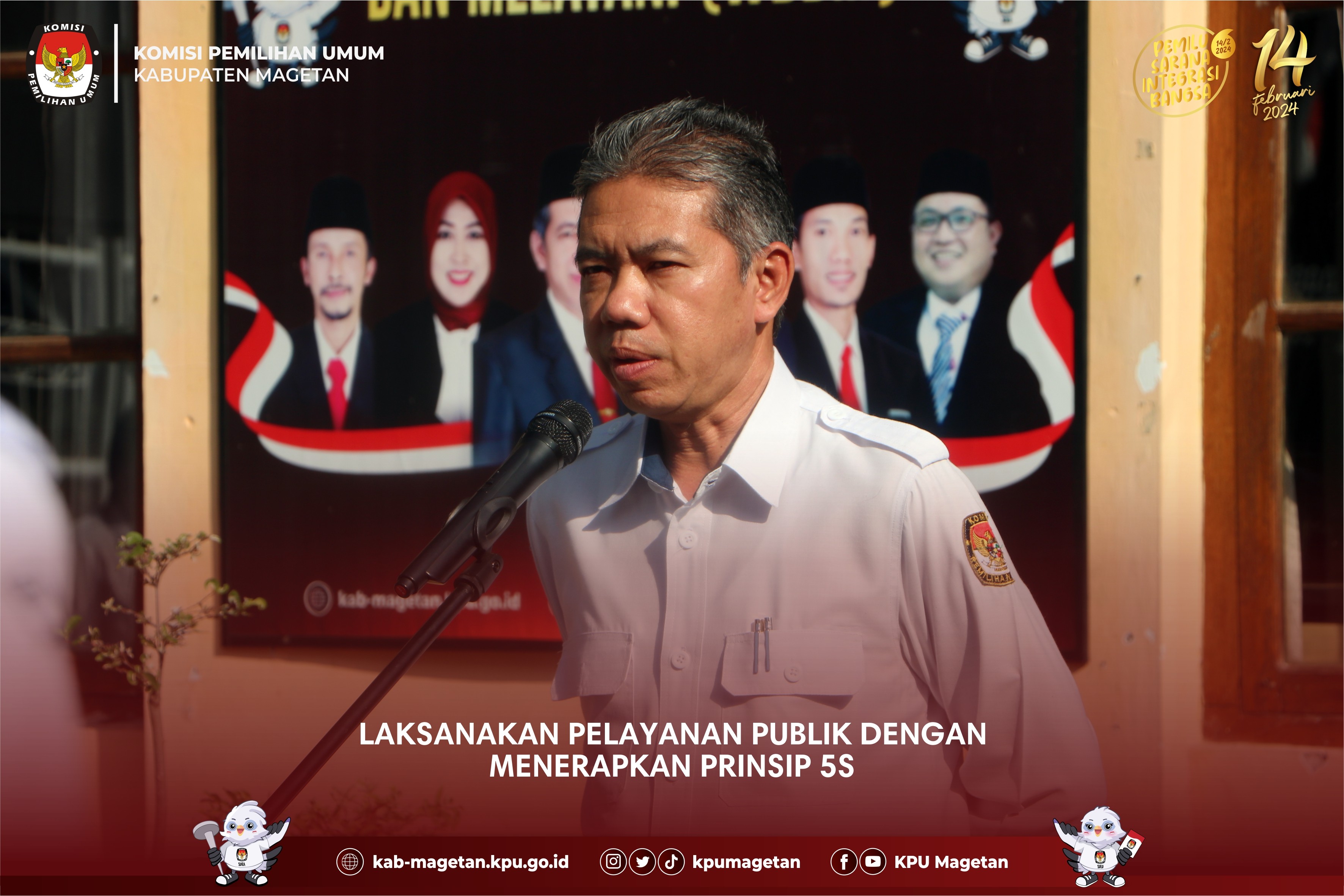 kab-magetan.kpu.go.id - Ketua KPU Kabupaten Magetan, Fahrudin memimpin apel pagi rutin yang dilaksanakan oleh KPU Kabupaten Magetan, Senin (12/6). Bertempat di halaman depan kantor KPU Kabupaten Magetan, Fahrudin dalam amanatnya mengingatkan kepada seluruh jajaran KPU Kabupaten Magetan untuk selalu memberikan pelayanan publik dengan menerapkan prinsip 5S. "Apa saja 5S itu? Yaitu Senyum, Salam, Sapa, Sopan, dan Santun. Pelayan publik yang diberikan oleh KPU Kabupaten Magetan baik kepada Partai Politik maupun masyarakat pada umumnya wajib menjunjung tinggi nilai-nilai etika dalam penyelenggaraan pelayanan publik tersebut." Ungkapnya. Fahrudin berharap, prinsip pelayanan publik ini dapat diterapkan oleh seluruh jajaran. "Bukan hanya staf saja namun saya harap semua dari Anggota, Plt Sekretaris, Kasubbag, hingga Staf ASN dan PPNPN dapat memberikan pelayanan prima kepada publik yang datang ke KPU Kabupaten Magetan. Semoga dapat diterapkan dengan baik." Tutupnya. Adapun dalam apel pagi kali ini, Kasubbag Keuangan Umum dan Logistik Sundarso bertindak sebagai Komandan Apel dan turut hadir seluruh jajaran KPU Kabupaten Magetan mulai dari Anggota, Plt Sekretaris, Kasubbag, hingga Staf ASN dan PPNPN sebagai peserta apel. (br)