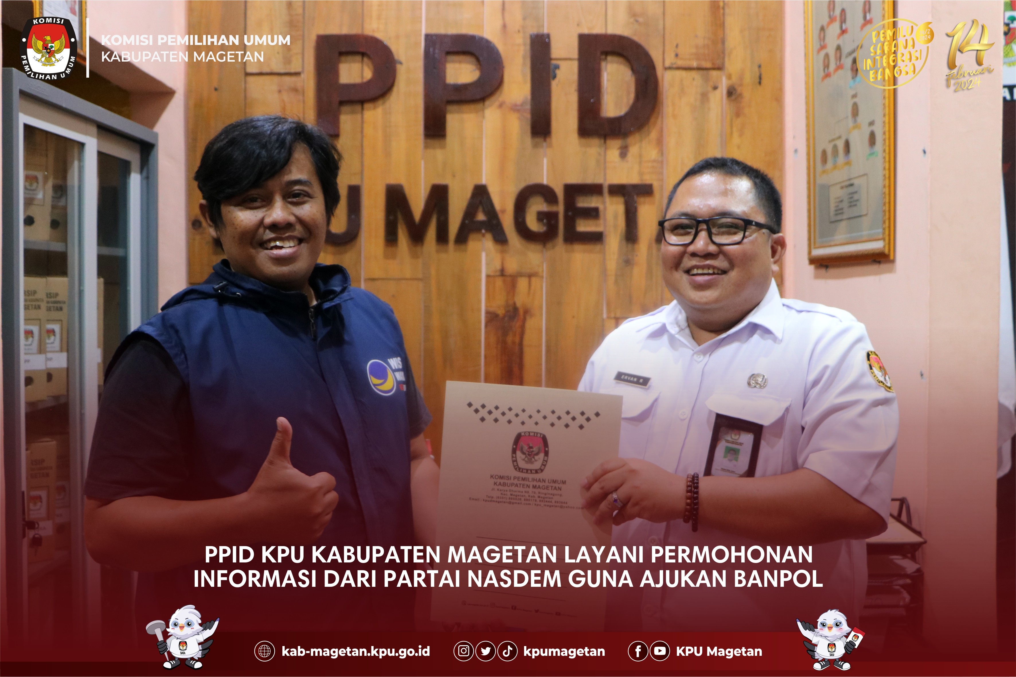 kab-magetan.kpu.go.id - PPID KPU Kabupaten Magetan berikan pemenuhan permohonan informasi kepada Partai NasDem, Senin (5/6). M. Agung Hermawan, Liaison Officer (LO) dari Partai NasDem Magetan hadir langsung guna mengajukan permohonan informasi kepada PPID KPU Kabupaten Magetan. "Adapun maksud kedatangan saya sebagai perwakilan dari Partai NasDem Magetan kali ini adalah untuk meminta data autentifikasi hasil Pemilu 2019 di Kabupaten Magetan yang nantinya akan kami gunakan untuk mengajukan bantuan parpol ke Bakesbangpol Magetan." Ungkapnya. Permohonan informasi tersebut langsung diproses oleh petugas PPID KPU Kabupaten Magetan yang sedang bertugas, Bakri Siminggus. Tak butuh waktu lama, permohonan informasi diproses sesuai dengan SOP diantaranya mengisi formulir permohonan disertai foto copy KTP pemohon. Dokumen langsung diserahkan setelah melalui proses legalisasi oleh sekretariat dan Pimpinan KPU Kabupaten Magetan. Proses pemenuhan permohonan informasi ini juga didampingi langsung oleh Pelaksana Tugas (Plt) Sekretaris KPU Kabupaten Magetan, Ervan Rifai. Ia menyampaikan bahwa pelayanan informasi di PPID KPU Kabupaten Magetan yang diajukan oleh Partai NasDem Magetan dapat langsung dipenuhi pada hari yang sama disaat permohonan informasi tersebut tersampaikan ke PPID KPU Kabupaten Magetan. "Permohonan informasi dari Partai NasDem dapat kami selesaikan tanpa membutuhkan waktu yang lama karena begitu permohonan informasi ini kami terima, maka petugas PPID KPU Kabupaten Magetan langsung memprosesnya sesuai dengan SOP yang berlaku." Jelasnya. (br)