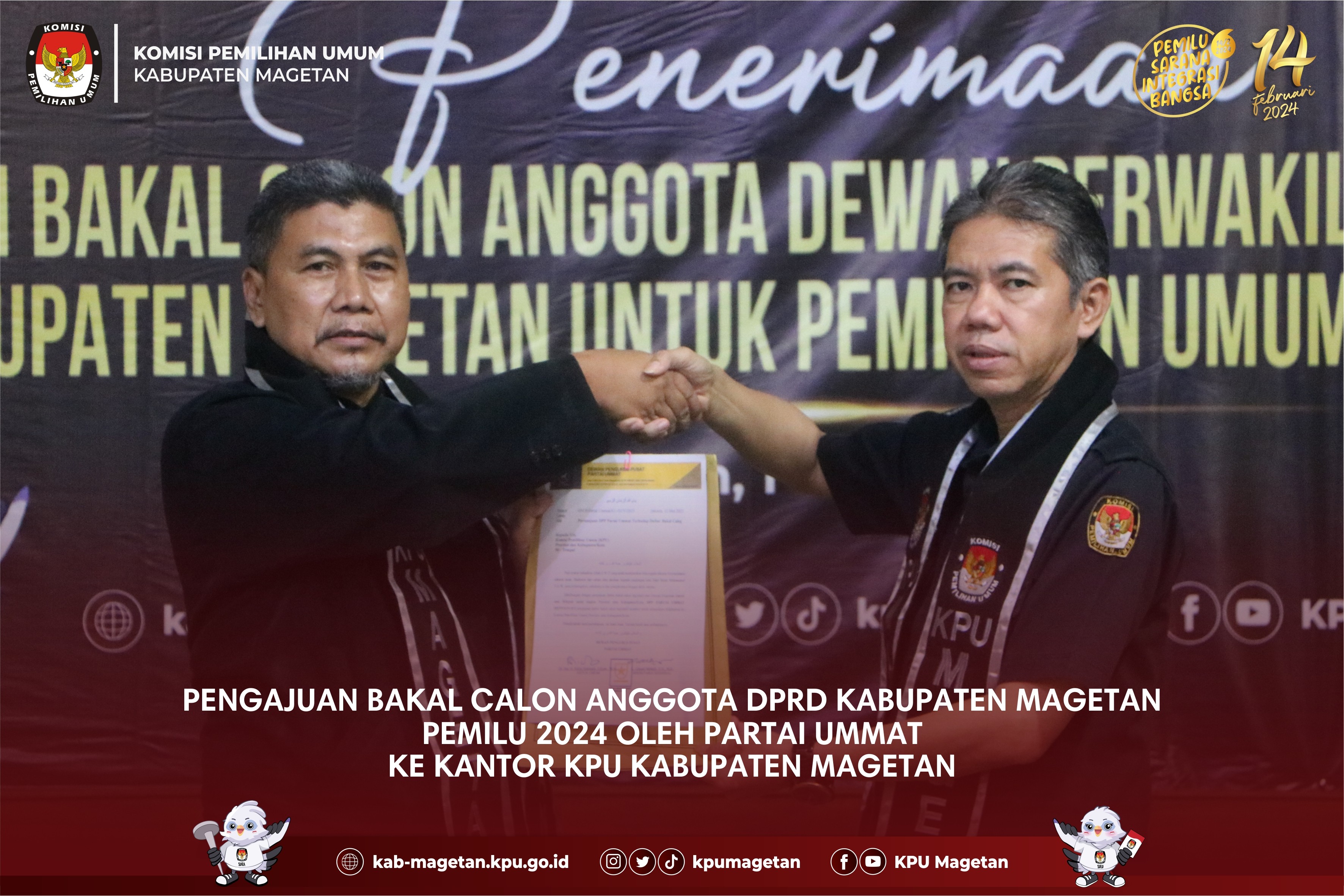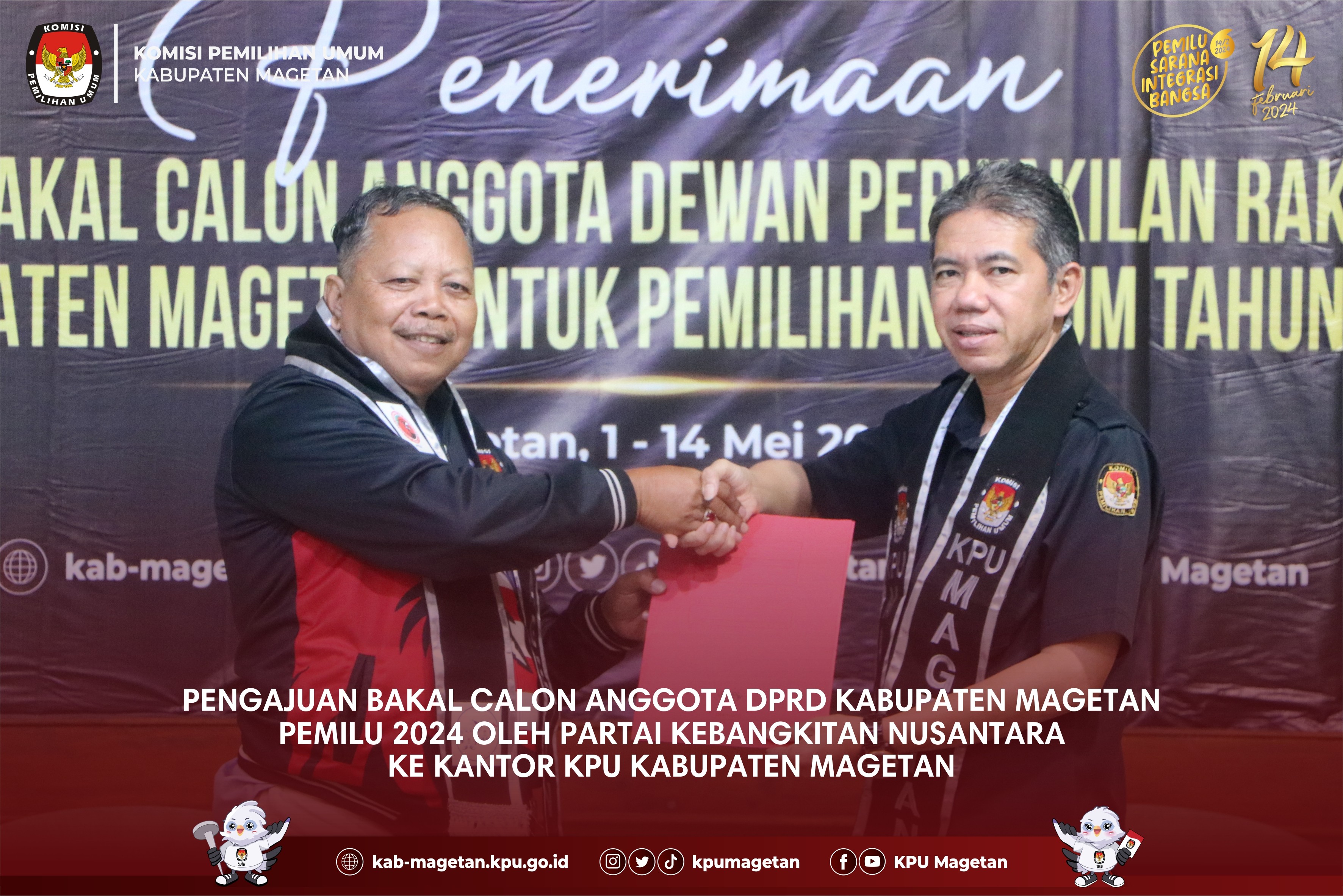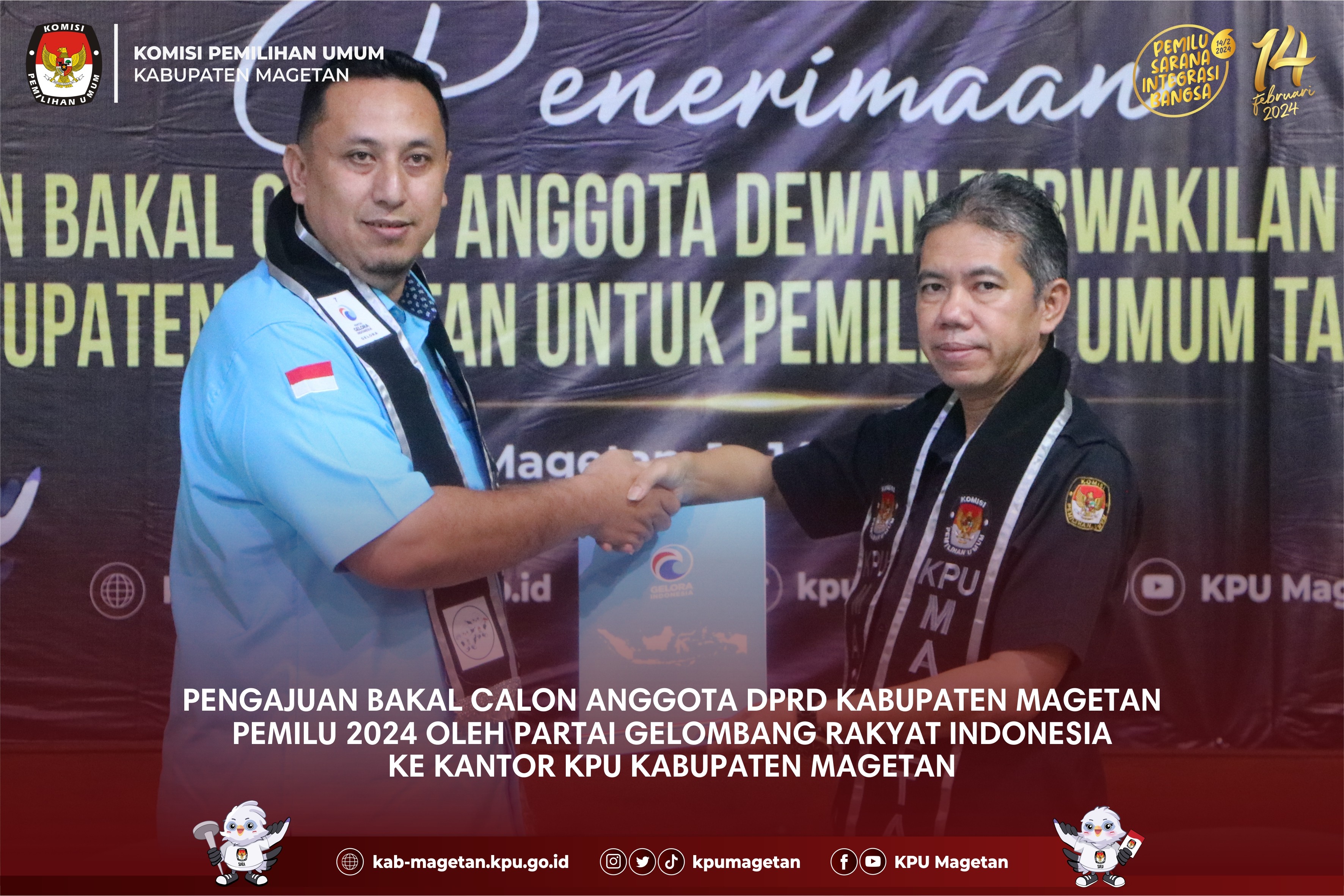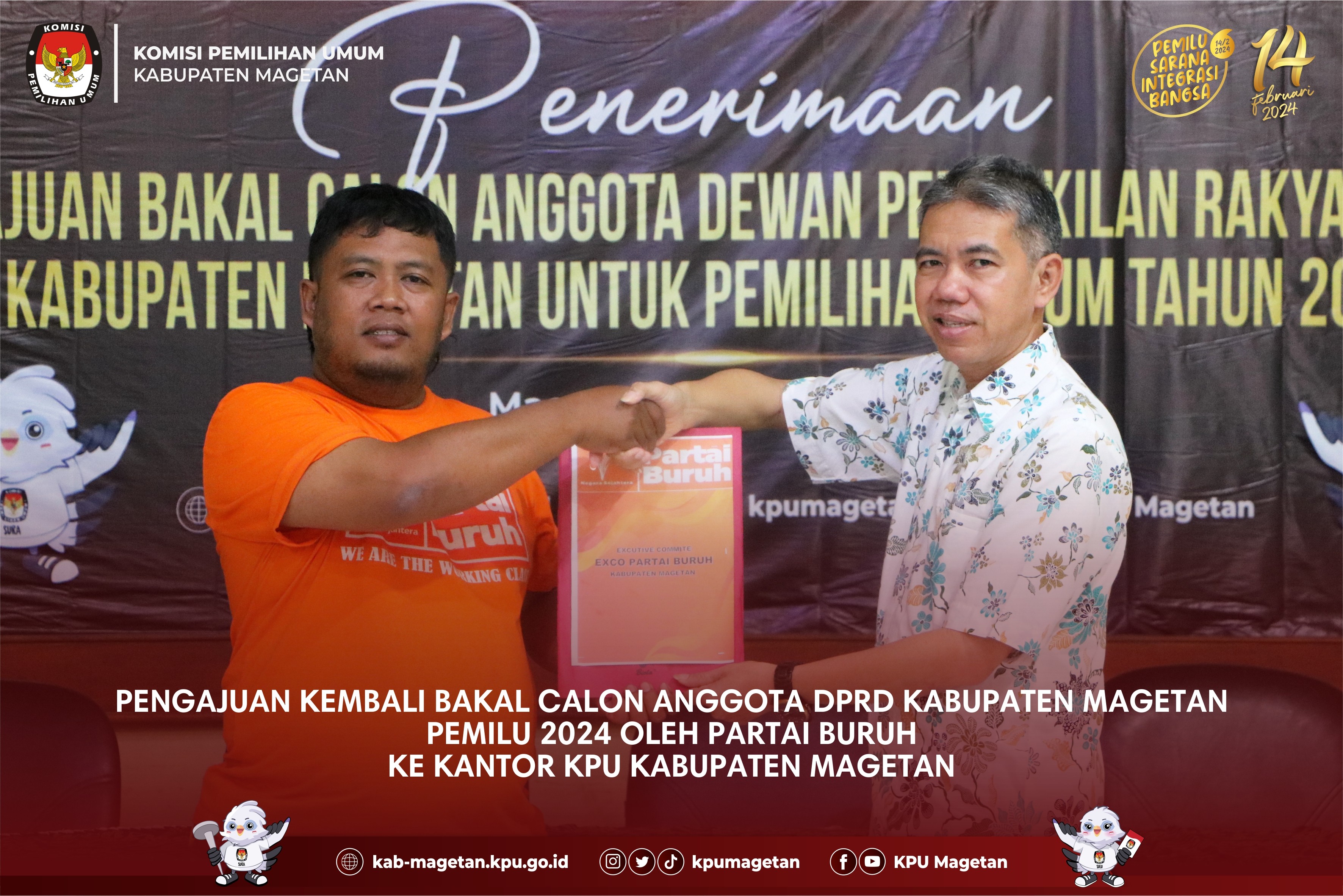 kab-magetan.kpu.go.id –Partai Buruh mengajukan bakal calon anggota DPRD Kabupaten Magetan Pemilu 2024 ke KPU Kabupaten Magetan, Kamis (18/5). Ketua Buruh melakukan prosesi penyerahan dokumen persyaratan pengajuan Bacalon. Ketua KPU Magetan Fahrudin Menjelaskan pengajuan kembali bakal calon DPRD Kabupaten Magetan untuk Pemilu 2024 ini merujuk Surat KPU Nomor 495/PL.014-SD/05/2023 Perihal Pengajuan Kembali Calon Anggota DPRD Provinsi dan DPRD Kabupaten/Kota akibat kendala Silon. “Terhadap Partai yang rentang waktu Pengajuan bakal calon tanggal 1-14 Mei 2023 telah melakukan Pengajuan bakal calon Anggota DPRD akibat kendala Silon, KPU Magetan menerima kembali pengajuan bakal calon dan memproses pengajuan bakal calon yang diajukan, Partai yang dimaksud yang dalam rentang waktu Pengajuan bakal calon tanggal 1-14 Mei 2023 telah melakukan Pengajuan bakal calon Anggota DPRD di Magetan yaitu Partai Buruh,”Terang Pria Lulusan IAIN Walisongo Semarang ini. “Adapun berkas dokumen kelengkapan administrasi, berupa formulir model B Pengajuan Parpol dalam bentuk fisik yang disampaikan langsung dan digital diunggah di Silon dan formulir Model B-Daftar.Bakal.Calon disertai foto diri terbaru bakal calon, dan dilampiri dengan dokumen persetujuan pengajuan bakal calon yang ditanda tangani oleh Ketua Umum Partai Politik Peserta Pemilu atau nama lain dan Sekretaris Jenderal Partai Politik Peserta Pemilu atau nama lain yang sah, sesuai dengan Keputusan Menteri yang menyelenggarakan urusan pemerintahan di bidang Hukum dan Hak Asasi Manusia tentang pengesahan susunan pengurus partai politik tingkat pusat dalam bentuk fisik disampaikan langsung dan digitalnya diunggah di Silon.” Tambahnya. Adapun Ketua Exco Partai Buruh Kabupaten Magetan, Sulistiono menyampaikan bahwa Partai Buruh Magetan menyerahkan sebanyak 19 Bakal Calon Anggota DPRD Magetan. (sgt)