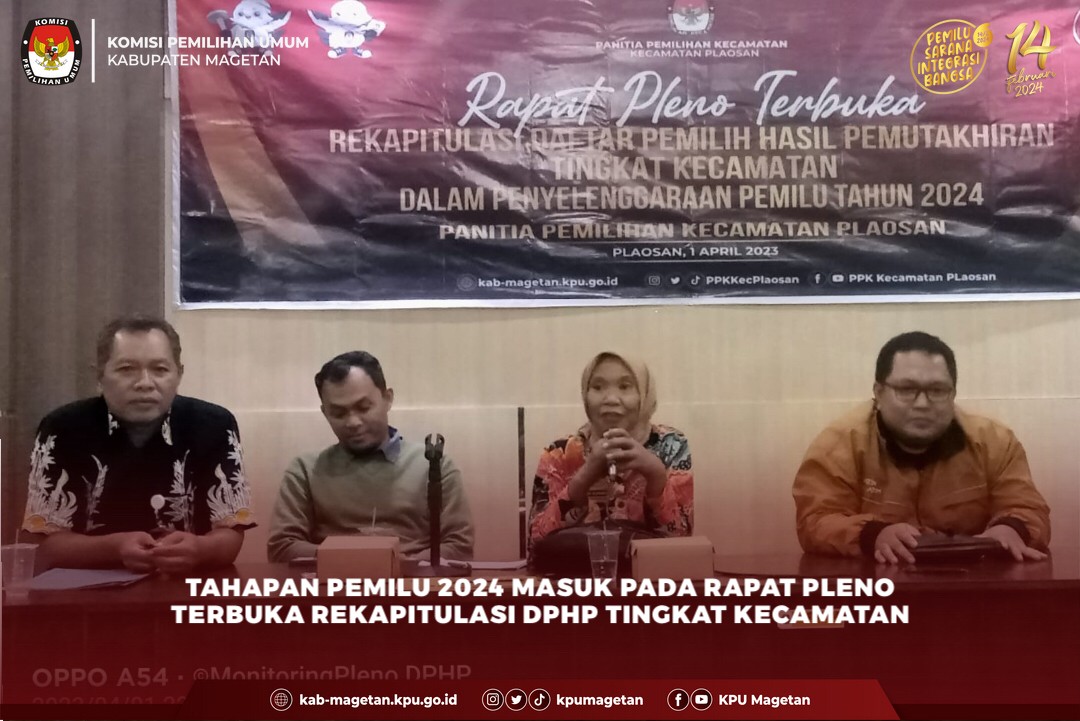 kab-magetan.kpu.go.id - KPU Kabupaten Magetan melakukan monitoring Rapat Pleno Terbuka Rekapitulasi Daftar Pemilih Hasil Pemutakhiran (DPHP) yang berlangsung serentak di 235 desa/ kelurahan di Kabupaten Magetan Kamis (30/03). Ketua KPU Magetan Fahrudin menjelaskan terkait Rapat Pleno Terbuka Rekapitulasi Daftar Pemilih Hasil Pemutakhiran dilakukan di 235 PPS, KPU Magetan Monitoring ke sejumlah wilayah tersebut . “Kami ingin memastikan pelaksanaan Rapat Pleno Terbuka Rekapitulasi Daftar Pemilih Hasil Pemutakhiran berjalan sesuai dengan petunjuk dalam Peraturan KPU, Kami menurunkan Tim Monitoring untuk kegiatan dimaksud,”Terang Pria yang biasa dipanggil Dino ini. Ditambahkan Yatmini Ketua PPS Desa Gonggang saat melakukan kegiatan pleno, dalam proses Rapat Pleno Terbuka DPHP ini pihak PPS secara terbuka mengundang pihak terkait seperti Kepala Desa, Pengawas Pemilu Kelurahan Desa, Pantarlih, Tokoh Masyarakat, Perangkat desa, Perwakilan Partai Politik. “Kami sampaikan dalam rapat pleno beberapa variable daftar pemilih diantara nya Jumlah Pemilih baru, Pemilih tidak memenuhi syarat, Perbaikan data ,Pemilih potensi non KTP-EL,”Jelas Mini. Pasca penyampaian dalam pleno terkait daftar Pemilih DPHP kami lanjutkan Penandatanganan Berita Acara Rekapitulasi Daftar Perubahan Pemilih Hasil Pemutakhiran oleh Panitia Pemungutan Suara ( PPS ) yang Kami tuangkan dalam Berita Acara,”Pungkasnya perempuan alumni Universitas Muhammadiyah Ponorogo ini. (sgt).