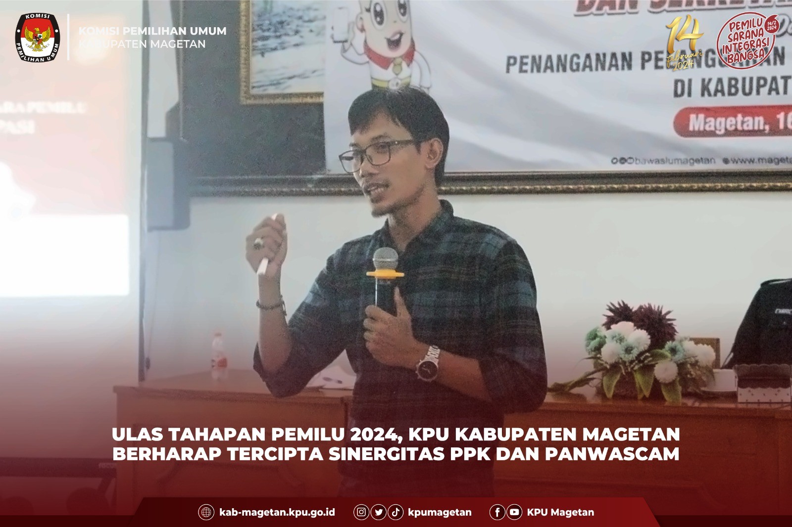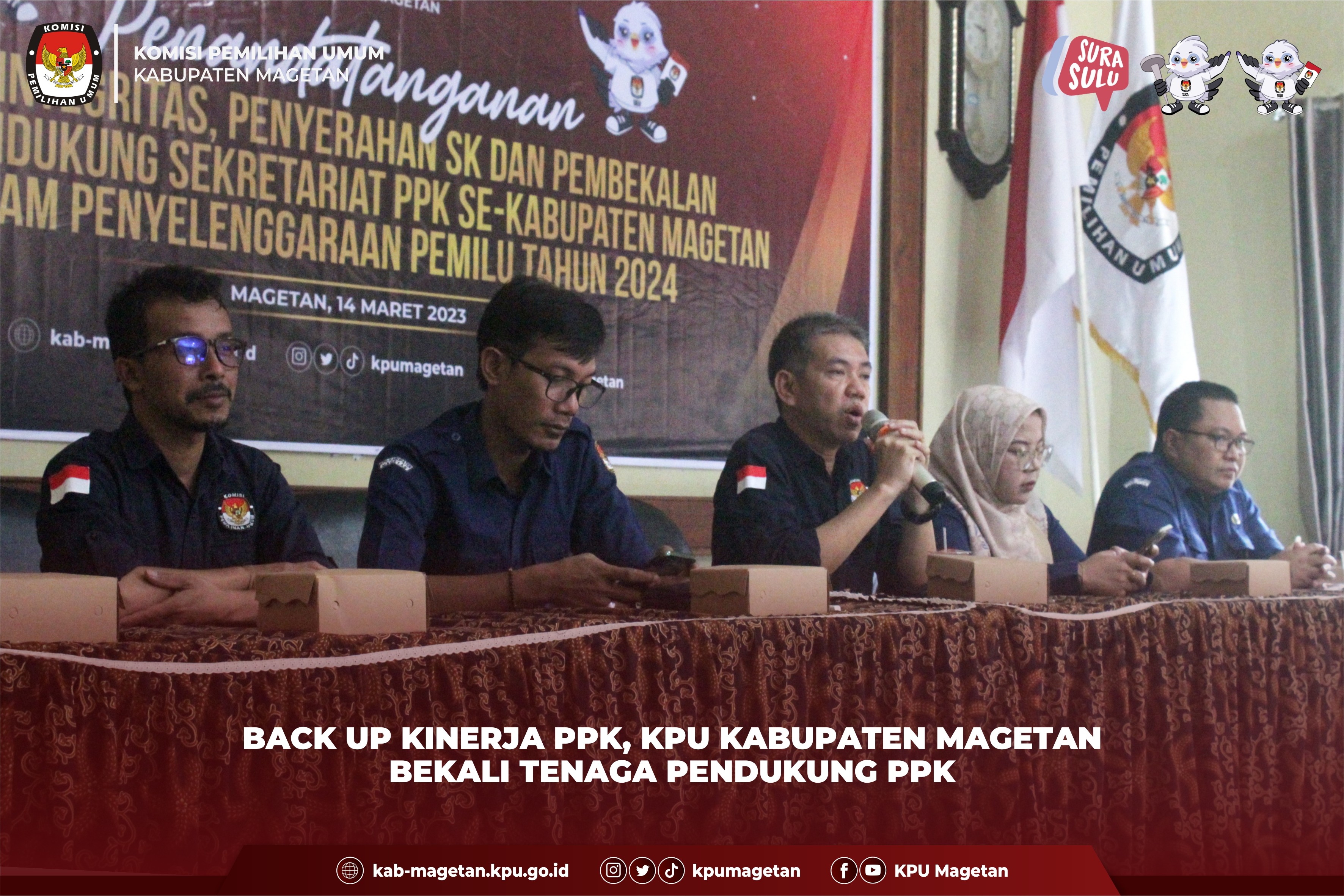 kab-magetan.kpu.go.id - Dalam mendukung Kinerja Panitia Pemilihan Kecamatan (PPK) Komisi Pemilihan Umum Kabupaten Magetan (KPU Magetan) memberikan pembekalan bagi tenaga pendukung Panitia Pemilihan Kecamatan terpilih Selasa (14/3). Pembekalan ini dihadiri oleh 2 Tenaga Pendukung Sekretariat PPK di setiap kecamatan di Kabupaten Magetan. ketua KPU Kabupaten Magetan, Fahrudin berpesan agar Tenaga Pendukung PPK dapat menyesuaikan ritme kerja yang ada di PPK masing-masing. "Untuk itu saya juga meminta kepada teman-teman PPK untuk menuntun dan memberikan pendampingan kepada Tenaga Pendukung agar dapat mengetahui tupoksi mereka dan dapat menyesuaikan ritme kerja dengan PPK dan Sekretariat PPK." Ujarnya. Anggota KPU Magetan Divisi Sosialisasi Pendidikan Pemilih dan SDM, Nur Salam memberikan pembekalan terkait Regulasi yang harus dipahami semua tenaga pendukung, Tata kerja Penyelenggara Pemilu, Tugas wewenang dan kewajiban PPK, dukungan sekretariat PPK. “Sekretariat PPK sebagai Supporting Sistem mempunyai tugas menyiapkan urusan teknis penyelenggaraan Pemilu dan Pemilihan, partisipasi hubungan masyarakat, dan hukum, menyiapkan urusan tata usaha, pembiayaan, administrasi PPK dan pertanggungjawaban keuangan, dan menyimpan bukti kas pembiayaan Pemilu dan Pemilihan untuk kegiatan PPK, serta menyiapkan perlengkapan Pemilu dan Pemilihan beserta kelengkapan administrasi,” Terangnya. “Sekretaris PPK membantu pelaksanaan tugas PPK, memimpin dan mengawasi kegiatan sekretariat PPK, melaksanakan tugas yang ditentukan oleh PPK, memberikan pendapat dan saran kepada PPK dalam rapat, dan melaksanakan tugas lain yang diberikan oleh KPU Kabupaten dan PPK dan/atau sesuai dengan ketentuan peraturan perundang-undangan, tenaga pendukung PPK harus memahami secara utuh terkait tugas tugas PPK sehingga bisa maksimal memberikan Supporting Sistem,”Imbuhnya. Ketua PPK Kecamatan Panekan Suwono menambahkan prinsipnya PPK sangat terbantu dengan adanya penambahan tenaga pendukung di Kecamatan. “Tahapan Pemilu serentak yang begitu padat dan beririsan membuat distribusi pekerjaan sangat padat, tentu Kami sangat terbantu dengan adanya penambahan 2 staf pendukung di PPK ini,” Pungkasnya. (sgt).