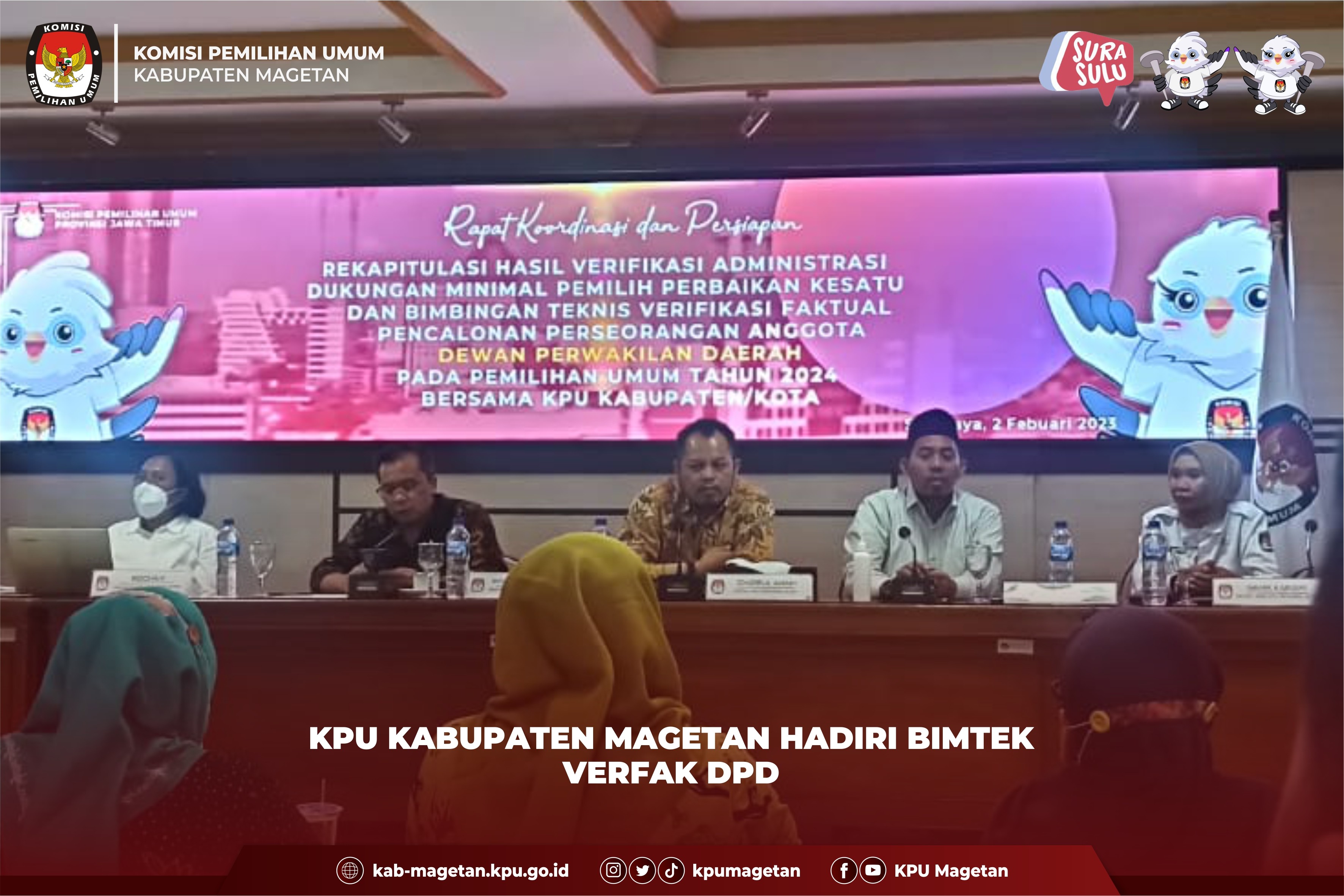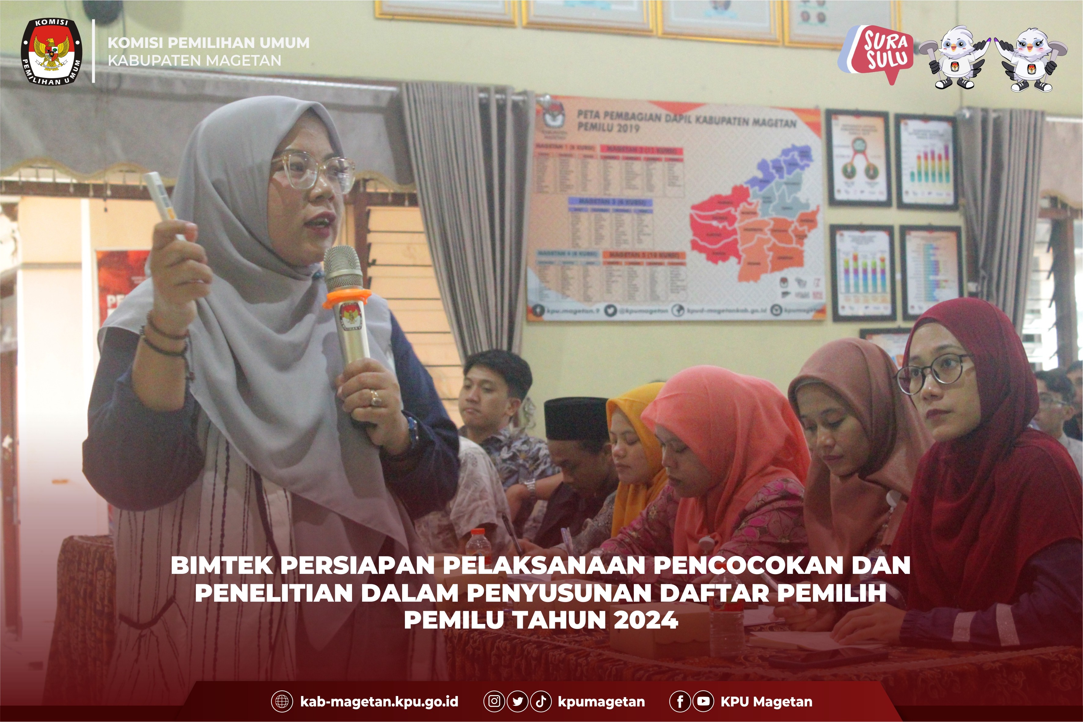 kab-magetan.kpu.go.id - Persiapan menjelang penyusunan daftar pemilih untuk Pemilu 2024, KPU Kabupaten Magetan gelar bimbingan teknis, Jumat (3/2). Bimbingan teknis yang dilaksanakan di Aula Jalak Lawu KPU Kabupaten Magetan ini diikuti oleh seluruh Panitia Pemilihan Kecamatan (PPK) Pemilu 2024 Kabupaten Magetan. Ketua KPU Kabupaten Magetan, Fahrudin membuka dan memberikan sambutan pada bimtek ini menuturkan bahwa diperlukan soliditas antar divisi yang ada di PPK. “Tiap divisi atau anggota PPK saya harapkan dapat bisa mem-back up satu sama lain, agar suatu pekerjaan atau tahapan dapat segera diselesaikan dengan baik.” Ungkapnya. Divisi Hukum dan Pengawasan KPU Kabupaten Magetan, Ismangil yang juga hadir dalam bimtek ini memberikan materi terkait keamanan data pribadi. “Kita sebagai penyelenggara Pemilu wajib hukumnya untuk menjaga kerahasiaan data pribadi para pemilih. Jangan sampai kita berbagi data yang harusnya rahasia walaupun kepada orang terdekat kita.” Ujar Ismangil. Divisi Perencanaan Data dan Informasi KPU Kabupaten Magetan, Nanik Yasiroh mengingatkan untuk memusatkan kembali niat para penyelenggara Pemilu dalam usaha mensukseskan penyelenggaraan setiap tahapan yang ada di Pemilu 2024. Dalam kesempatan kali ini pula Nanik Yasiroh menyampaikan terkait persiapan coklit seperti menyusun rencana kerja coklit. "Rencana kerja pada tahapan coklit ini sangatlah penting untuk disusun supaya dalam pelaksanaannya nanti dapat berjalan lancar." Tambah Nanik Yasiroh. Dalam bimtek ini juga turut mengundang Suhariyati, Bidang P2P Dinas Kesehatan Kabupaten Magetan yang menyampaikan materi terkait jenis-jenis disabilitas yang akan menjadi bahan informasi yang akan disampaikan ke PPS dan Pantarlih. Ia berkata bahwa kaum disabilitas juga mempunyai hak untuk memilih sehingga perlu adanya perhatian khusus dari KPU. "KPU sebagai penyelenggara Pemilu bersama PPK dan PPS saya harapkan dapat memberikan perhatian lebih kepada teman-teman kita yang disabilitas supaya dapat menyalurkan hak suara nya dalam Pemilu 2024 nanti." Ungkapnya saat pemberian materi. (br)