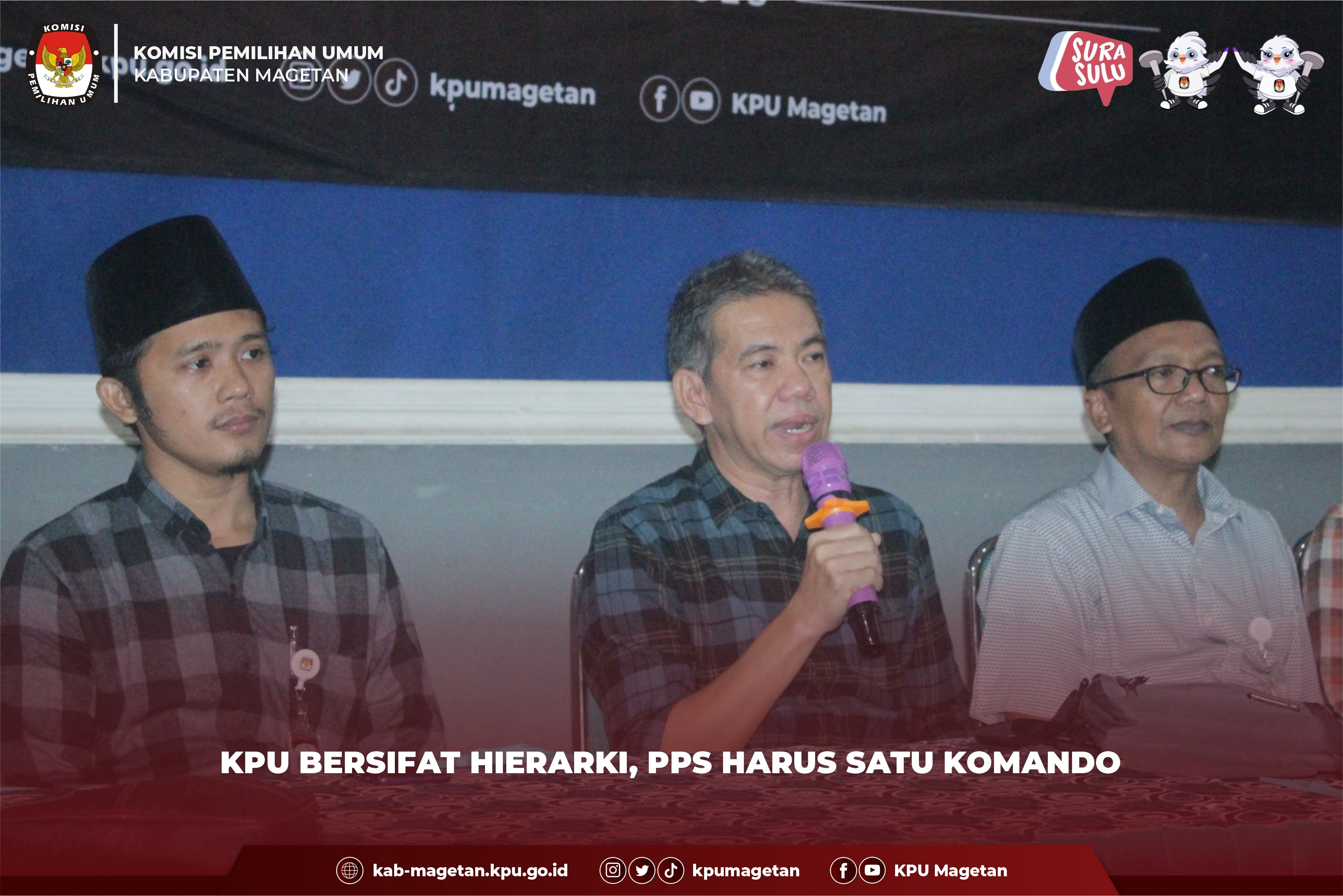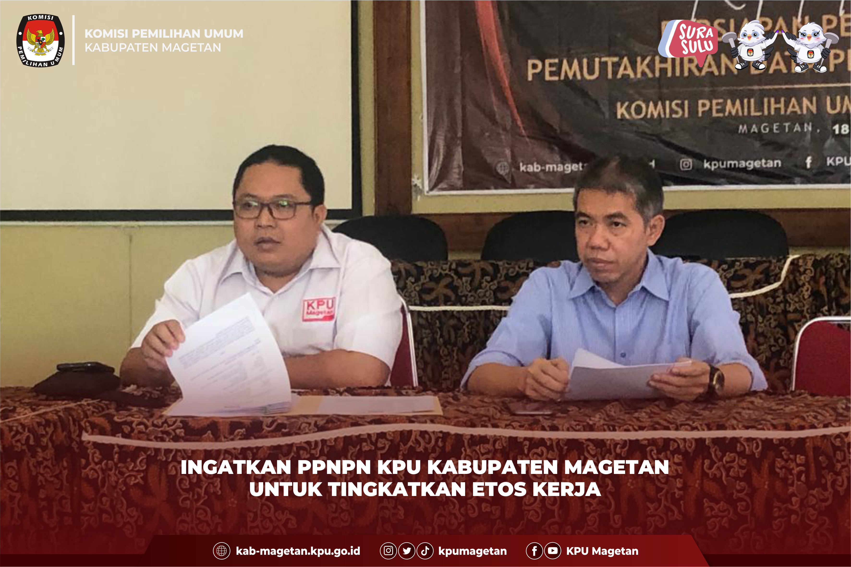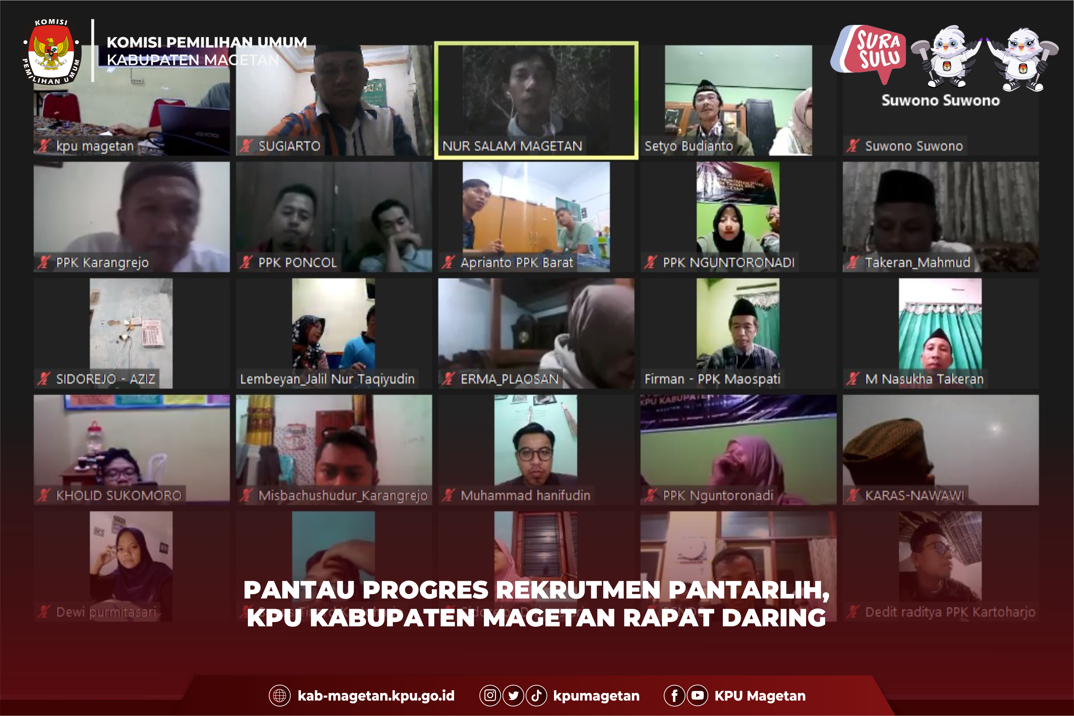 kab-magetan.kpu.go.id - Pastikan Proges Tahapan Pemilu berjalan sesuai Tahapan KPU Magetan rapat via daring dengan seluruh Panitia Pemilihan Kecamatan Sabtu (28/1). Tahapan Pemilu 2024 hari ini sedang berjalan memasuki Tahapan Seleksi Petugas Pemutakhiran Data Pemilih (Pantarlih), Kami ingin memastikan Progres Rekrutmen Pantarlih berjalan sesuai mekanisme regulasi, Terang Nur Salam Anggota KPU Magetan Divisi Sosialisasi Pendidikan Pemilih dan SDM ini. Pendaftaran Pantarlih dilakukan di masing masing Desa/ Kelurahan akan berakhir tiga hari lagi ( red 31/1), Malam ini Kami sedang melakukan koordinasi virtual dengan seluruh PPK terkait Progres Seleksi Pantarlih, terhadap kendala dilapangan segera terinventarisir dan terinformasikan, termasuk progres jumlah pendaftar di masing masing PPS, proses pengajuan Sekretariat PPS, imbuh Nur Salam. Divisi Perencanaan dan Data Nanik Yasiroh Menegaskan kembali terkait komitmen penyelengara Pemilu di semua tingkatan terkait prinsip melindungi kerahasiaan data pribadi pemilih seperti yang diamanatkan dalam UU 27/2022 tentang Perlindungan Data Pribadi dengan meneguhkan komitmen tersebut dalam fakta integritas . Ditambahkan Plt.Sekretaris KPU Magetan Ervan Rivai terkait masa kerja Pantarlih 6 februari hingga 15 Maret 2023 terhitung dua bulan. Pada kesempatan lain kami akan segera mengundang Anggota dan Sekretariat PPK dalam Penguatan Tata Kerja Penyelenggara Pemilu tingkat Kecamatan, tambah Ervan .