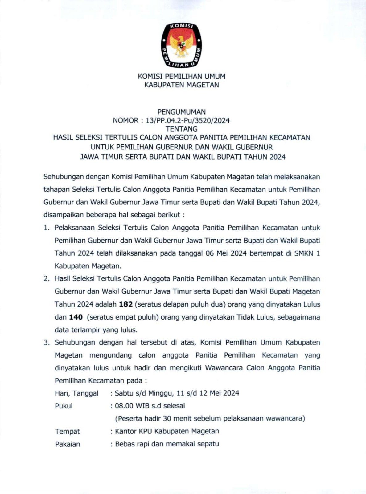 PENGUMUMAN HASIL TES TERTULIS PPS PILKADA 2024 Senin, 20 Mei 2024 17:00 703 Pengumuman selengkapnya klik disini Baca Selengkapnya