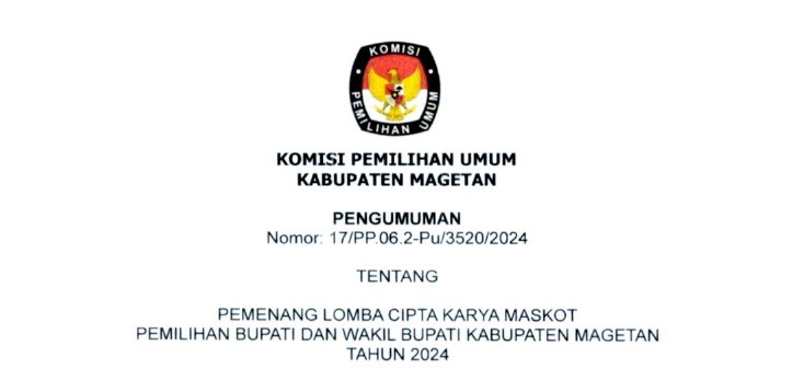 PENGUMUMAN PEMENANG LOMBA CIPTA KARYA MASKOT PEMILIHAN BUPATI DAN WAKIL BUPATI KABUPATEN MAGETAN TAHUN 2024 Jumat, 24 Mei 2024 10:00 249 PENGUMUMAN SELENGKAPNYA DAPAT DIAKSES DISINI Baca Selengkapnya