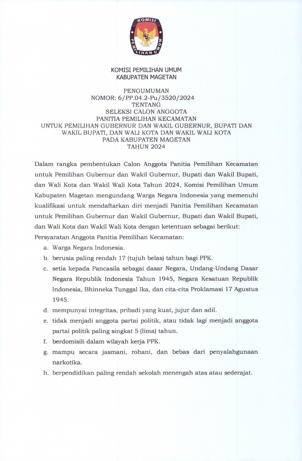 Berikut disampaikan Pengumuman Tentang Pendaftaran Bakal Calon Anggota KPU Kabupaten/Kota di Jawa Timur Periode 2024-2029